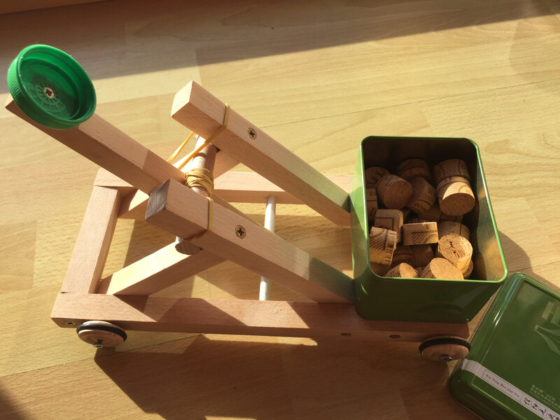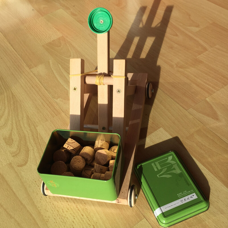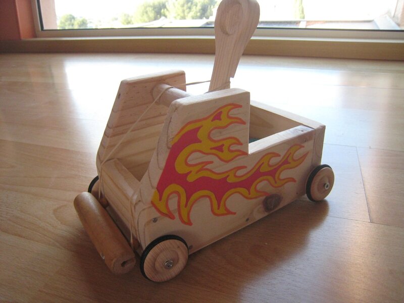 Pour l’anniversaire de Léon, j’ai fait une catapulte en bois, avec des projectiles en bouchon. Je n’ai pas fait de photos de la réalisation, mais il n’y a rien de rare…Si ce n’est peut être que pour le pare-choc, j’ai utilisé la pognée du Wok que j’avais démontée, le wok a fini en réflecteur de lampe, et la poignée en jeu…