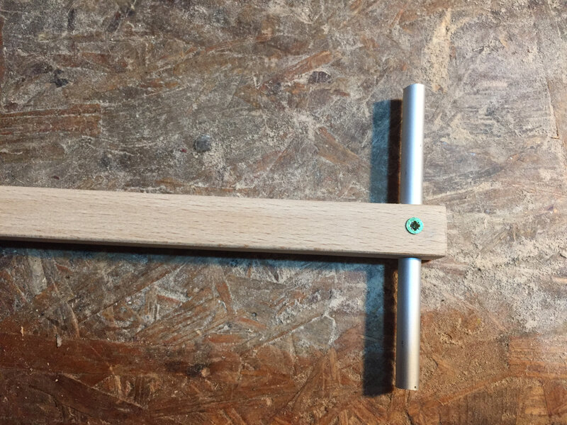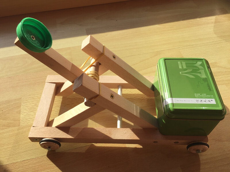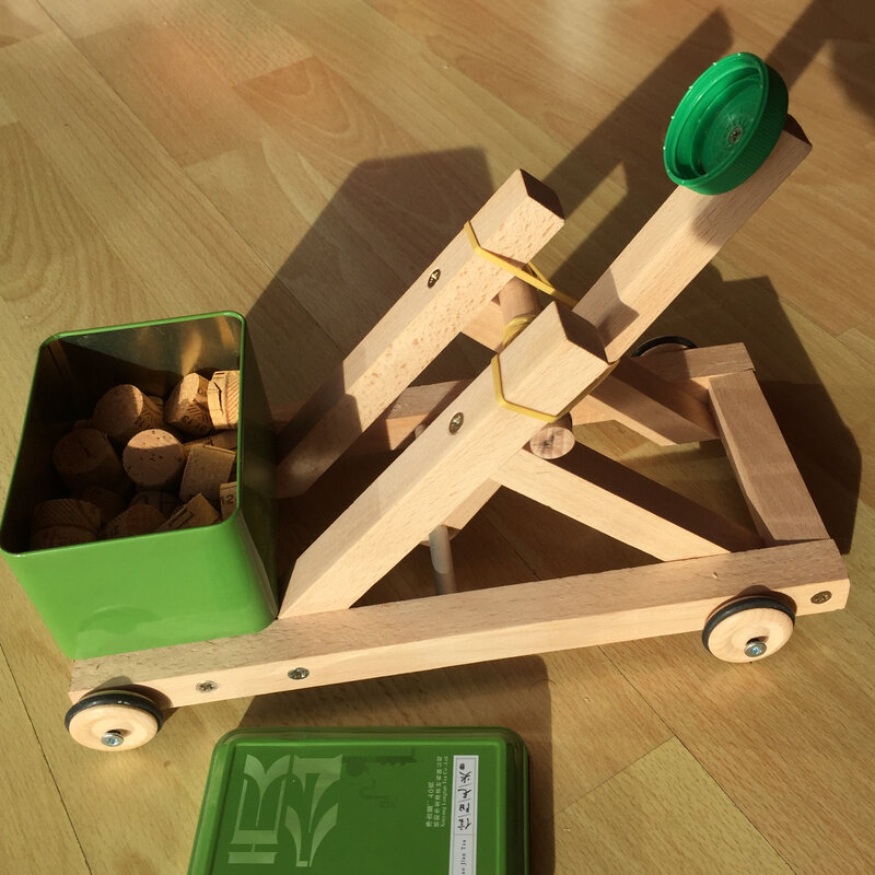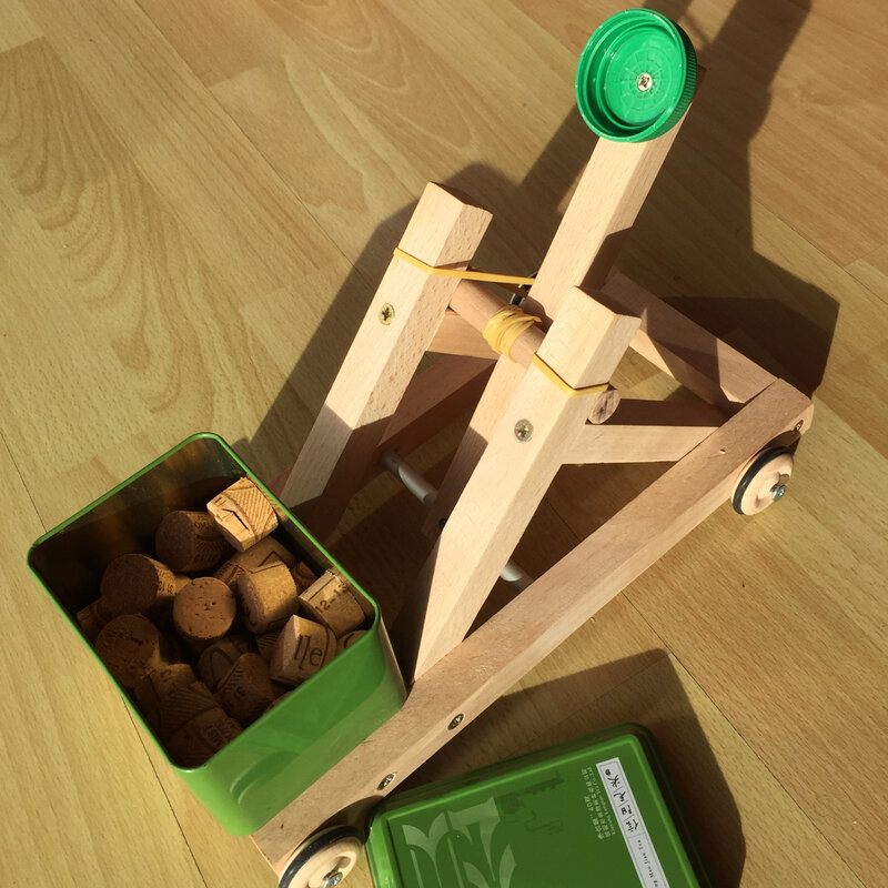 La structure est en tasseau de hêtre qui restaient d’une cuisine I..A. Ils sont directement vissées entre eux pour constituer l’ossature. Les projectiles sont des bouchons en liège coupés. La catapulte est un bouchon en plastique, le coffre à munitions est une boite à thé métalllique vissée sur la structure. Il y a longtemps, j’avais acheté des roues en bois toutes faites et je les ai fixées directement avec des vis sur les cotés. Pour articuler la catapulte, j’ai utilisé un petit tube en alu, bloqué par une vis et qui tourne dans des trous sur les cotés. elle est actionnnée par un élastique, et pour que le choc ne soit pas trop violent, j’ai ajouté un élastique enroulé à l’endroit où la catapulte tape la traverse.