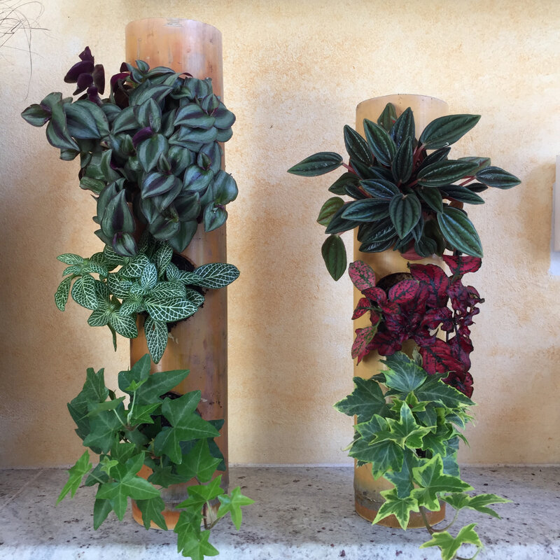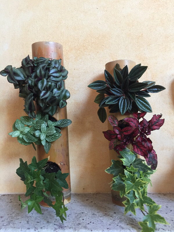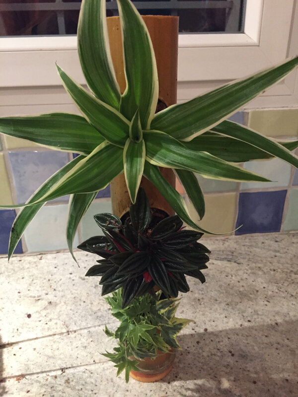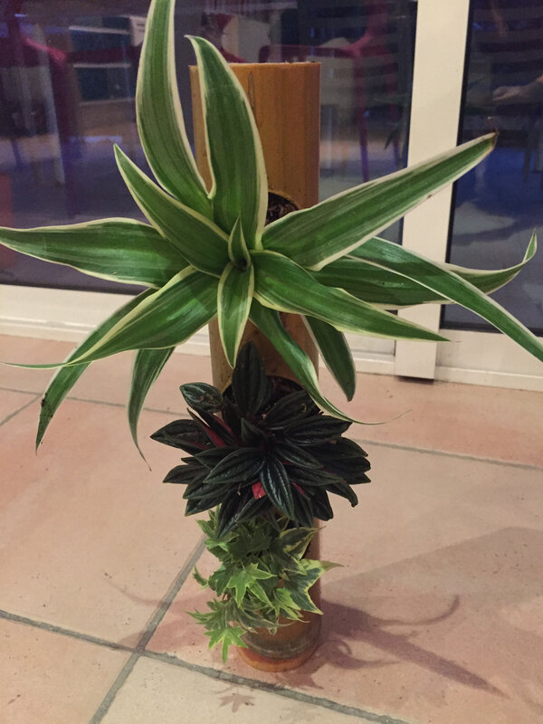 Nous sommes allés à la Réunion et nous avons vu de magnifiques bambous. Je n’ai pas résisté, j’en ai ramené des morceaux. Ensuite s’est posée la question de comment les utiliser. Pour les anniversaires de Morgane et de Claude, j’ai fait une composition avec des plantes, c’est le même principe qu »un cadre végétal mais dans un bambou.