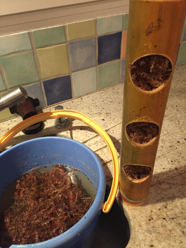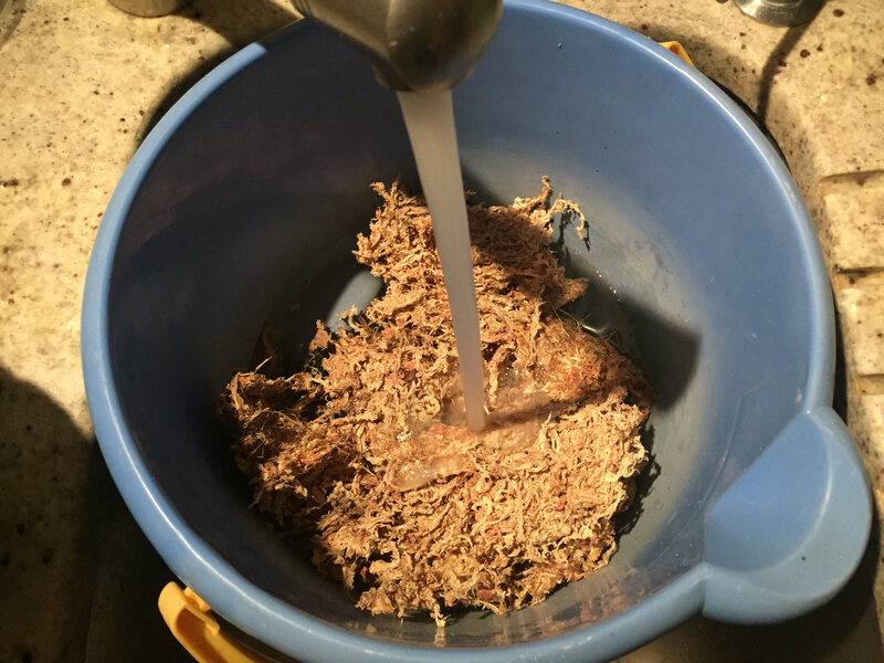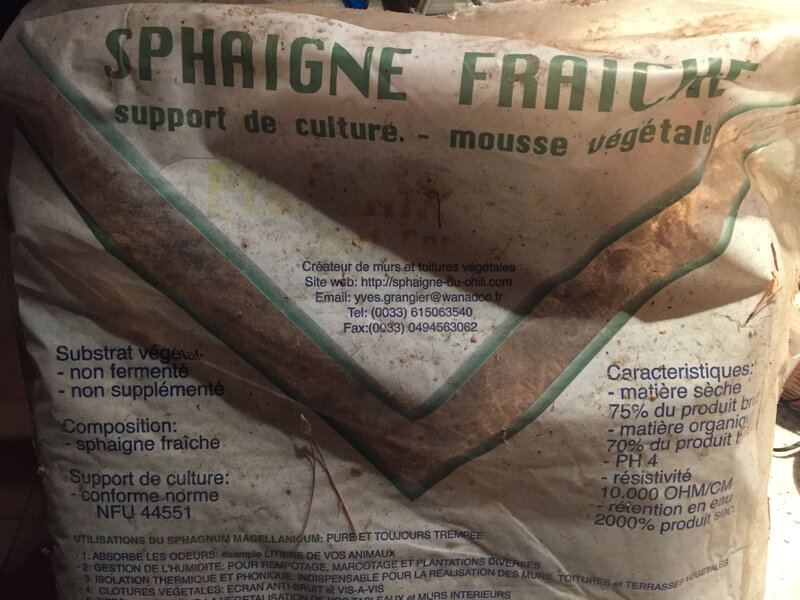 Pour que les plantes s’installent dans le bambou, il faut un support de culture, c’est de la sphaigne du chili, une mousse qui se gorge d’eau. Il faut la laisser s’imbiber toute la nuit.