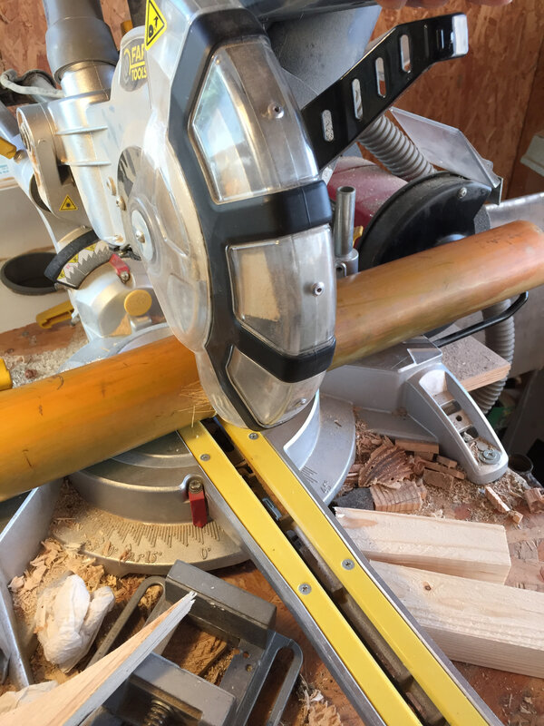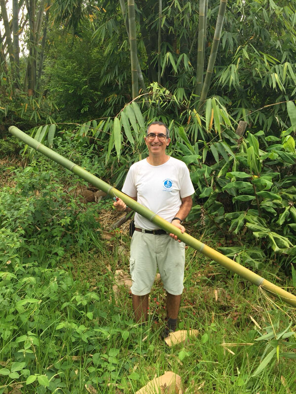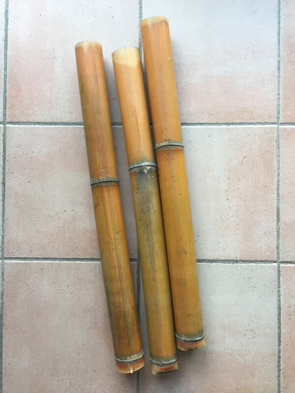Le bambou vient de la Réunion où il y a de tres beaux et gros bambous. J’en ai coupé un qui n’était pas en bonne santé avec la scie du couteau suisse. Celà m’a pris un moment mais comme je suis assez persévérant quand je suis motivé, j’en suis venu à bout, mais pour le ramener il a fallu le débiter en plusieurs bouts, la scie du couteau suisse a chauffé!