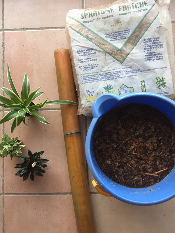 Le bambou est prêt, on peut planter les plantes. dans la sphaigne humide, celà se passe dans la cuisine.
