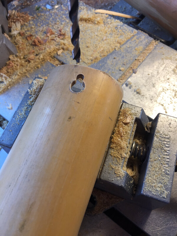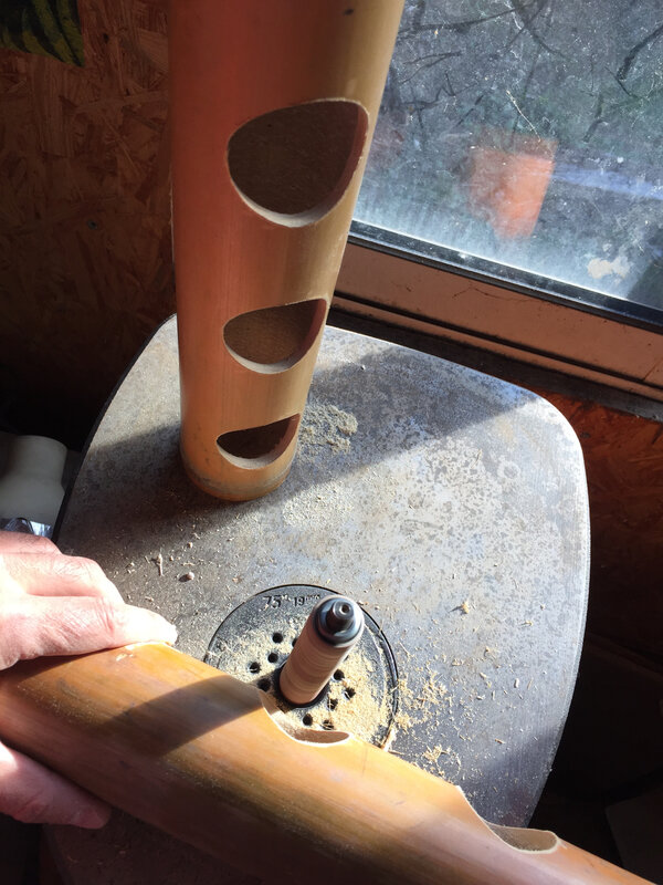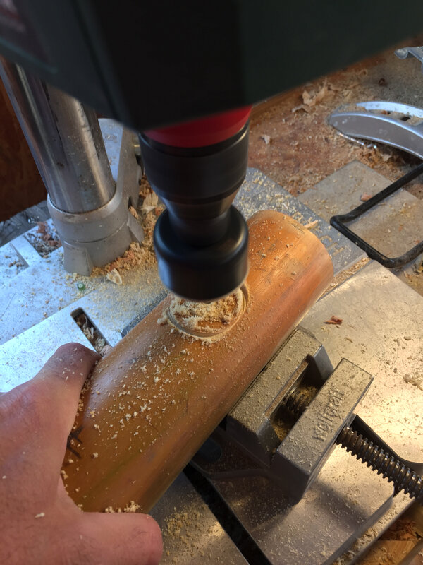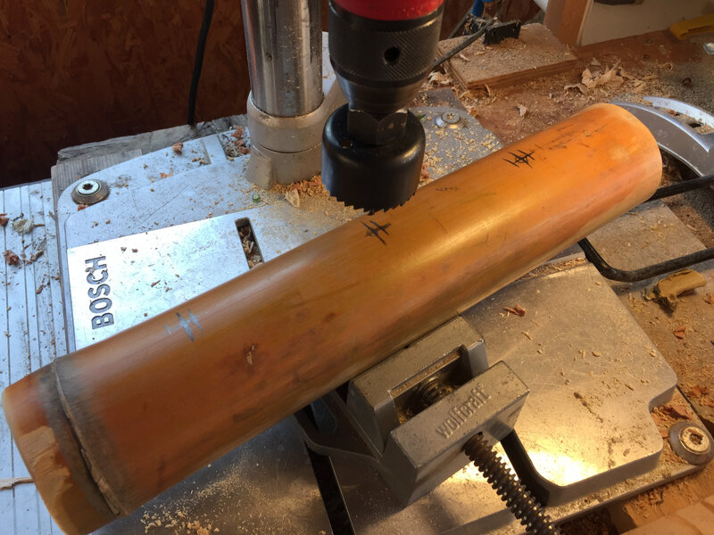 J’ai coupé un morceau de bambou en gardant la cloison. J’ai ensuite percé des trous à la scie cloche.