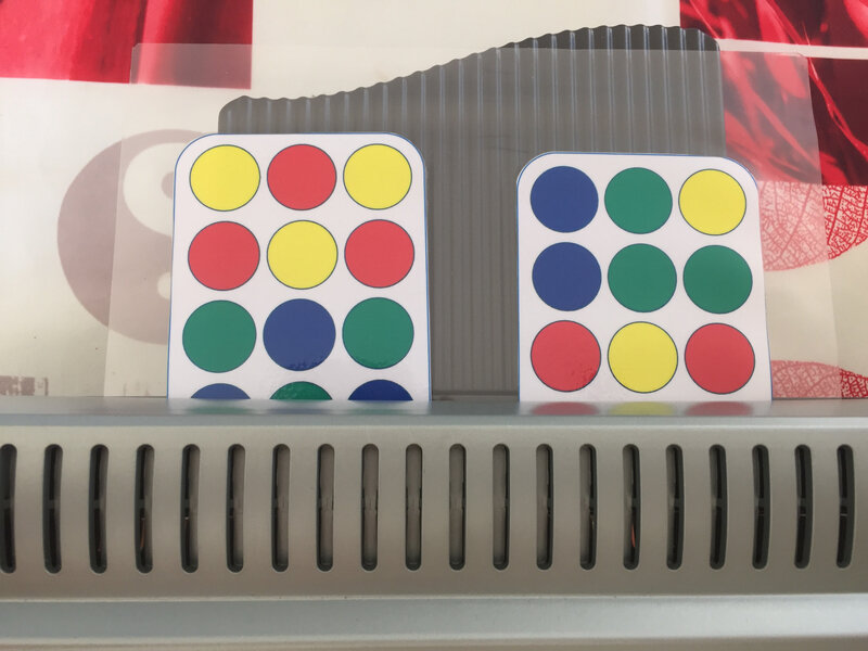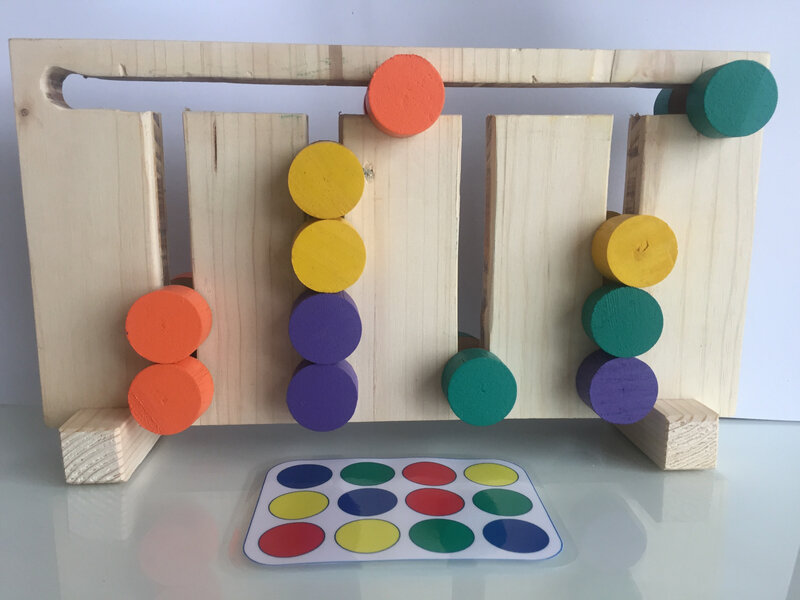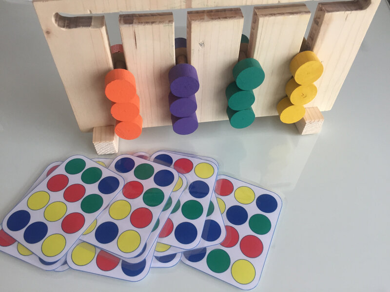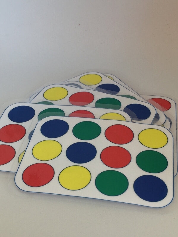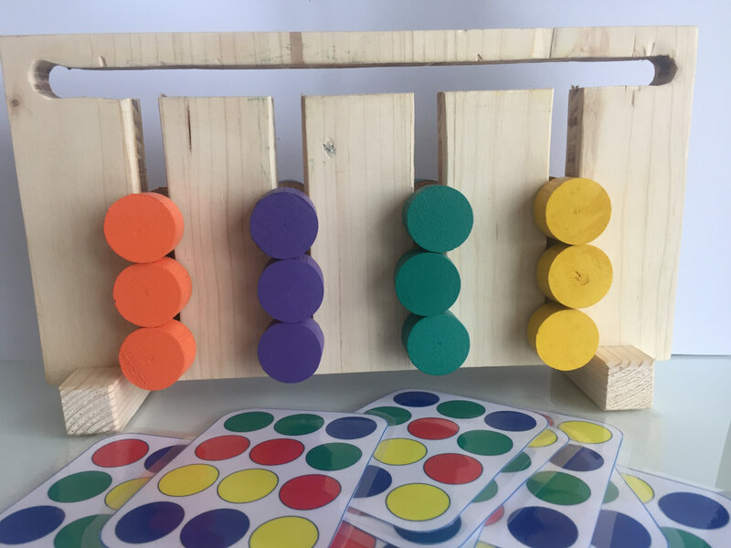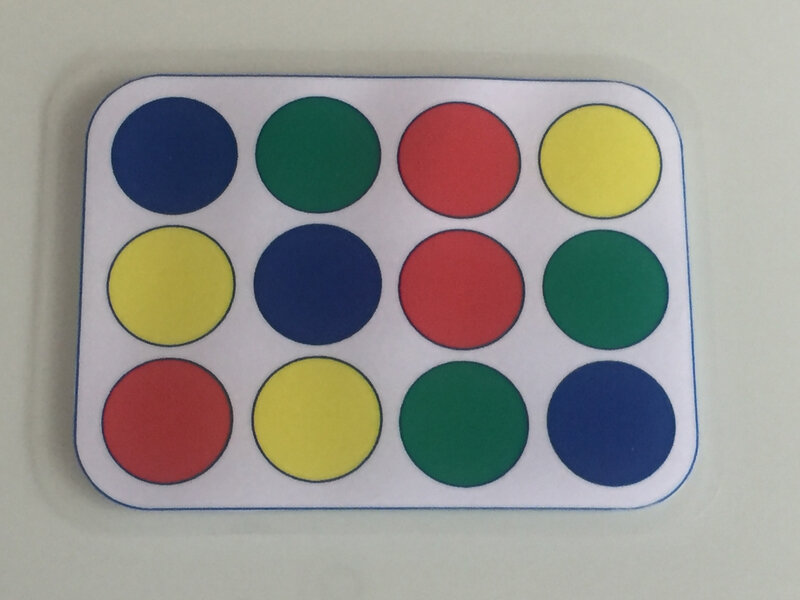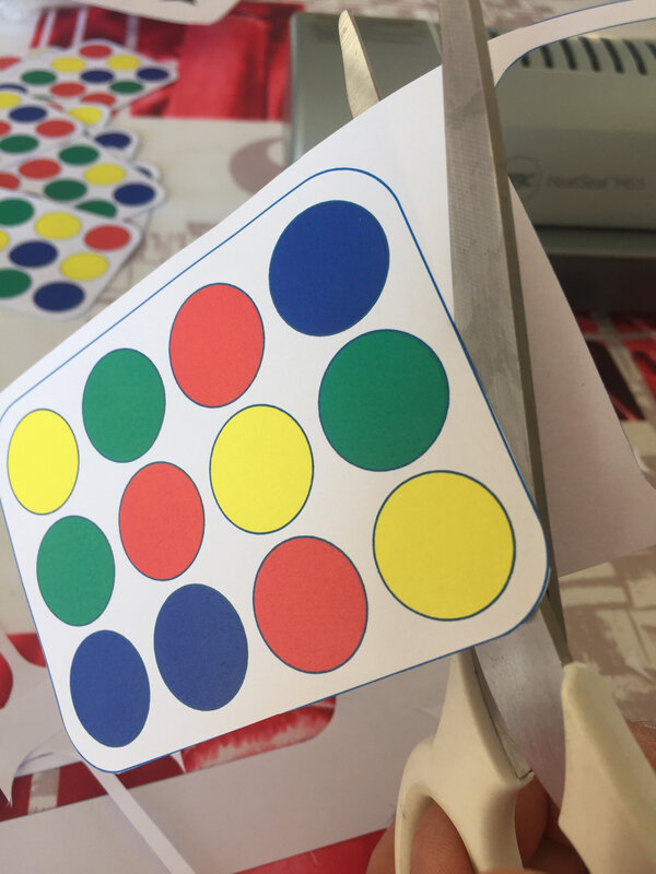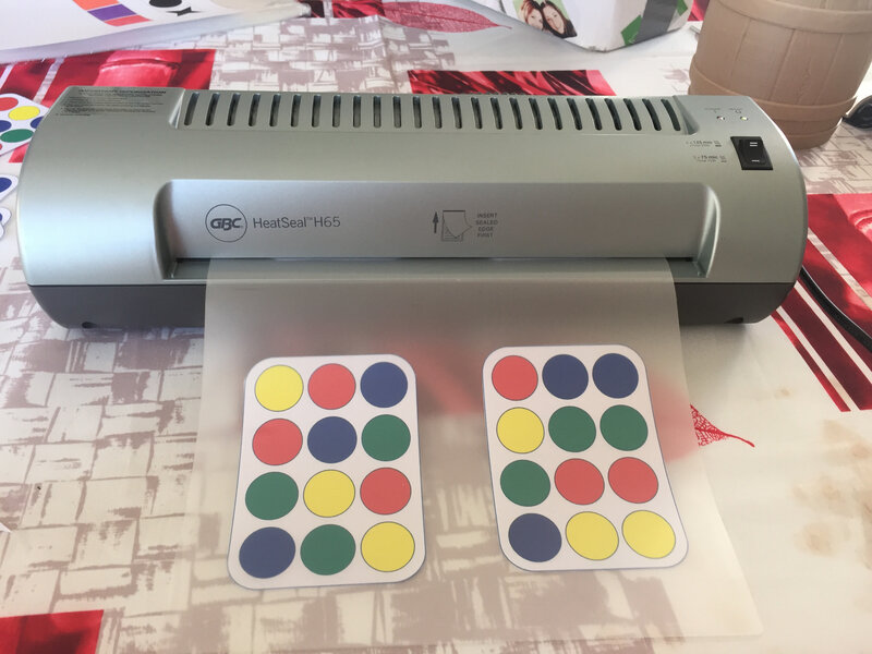 J’ai fait des cartes avec des combinaisons de couleurs avec Powerpoint, et j’ai ensuite découpé et plastifié les cartes.