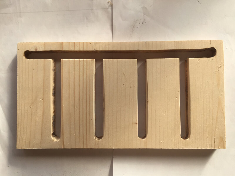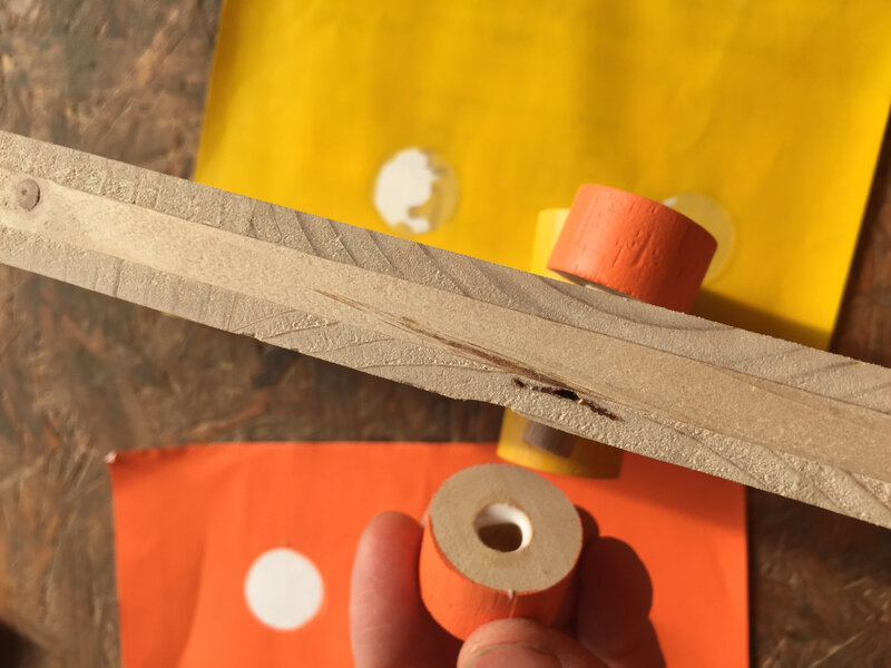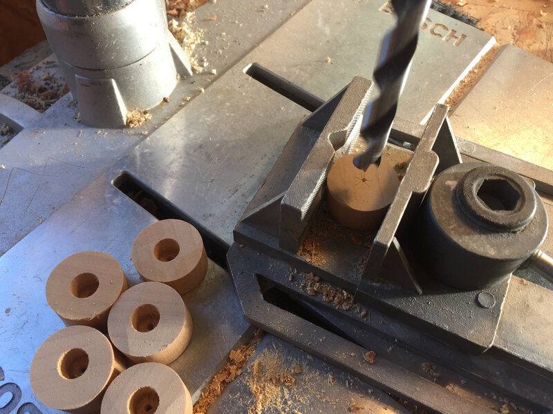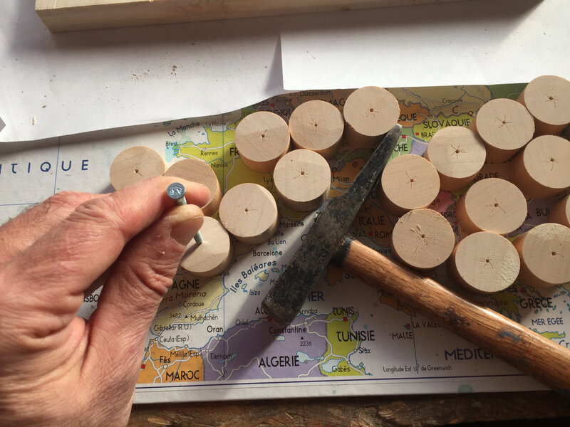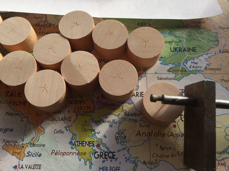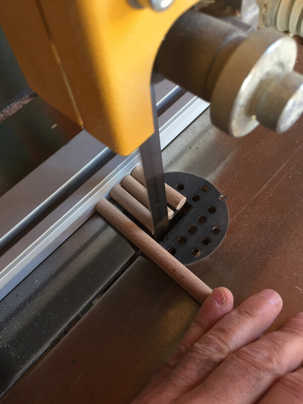 Pour les pions j’ai découpé une tringle à rideaux en bois (merci Chloé qui me l’avait laissée en dépot). J’ai utilisé la scie à ruban en mettant une butée pour les faire réguliers. Puis j’ai marqué les centres et percé des trous pour les tourillons.