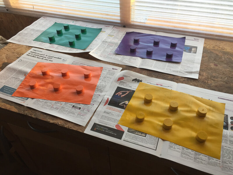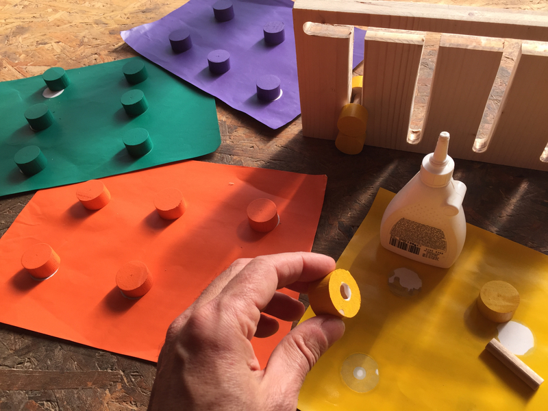 Puis un peu de colle pour assembler les ronds et les tourillons de part et d’autre de la planche avec le circuit.