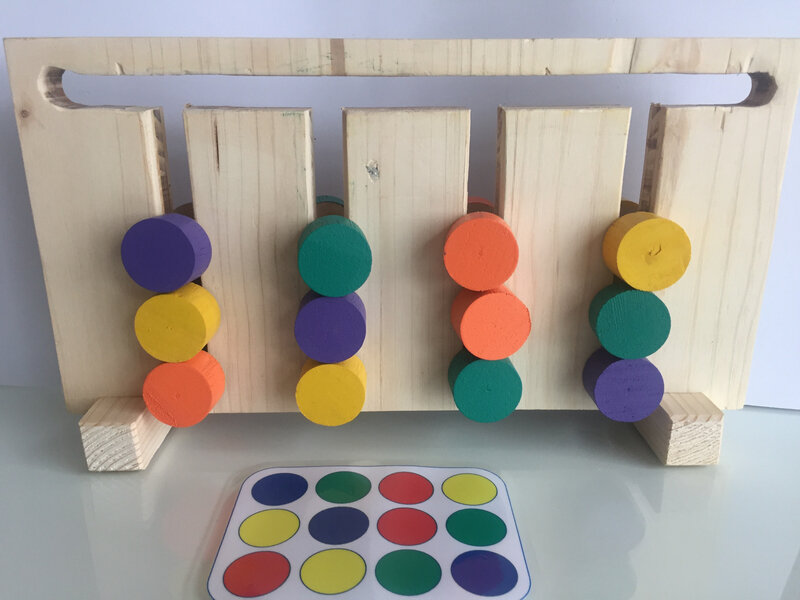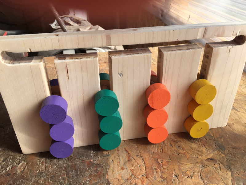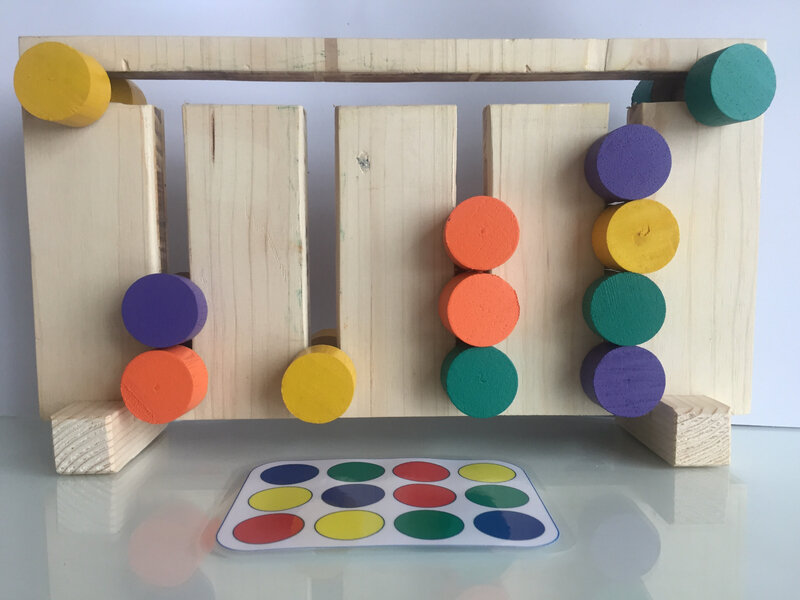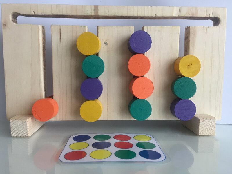 Comme Claude est allée retrouver Thomas, Sasha, Thais et Zoé en vacances, l’atelier des petits lutins s’est remis au travail en février et mars pour Thais et Zoé. Pour Thaïs, j’ai fait un jeu sur le principe du rubik’s cube, mais en 2D, il s’agit de reproduire des motifs qui sont sur des cartes, en déplaçant les pièces colorées (qui sont bloquées par une pièce identique de l’autre coté du bois). Il faut développer une stratégie pour enlever les pièces qui gènent et laisser passer les pièces.