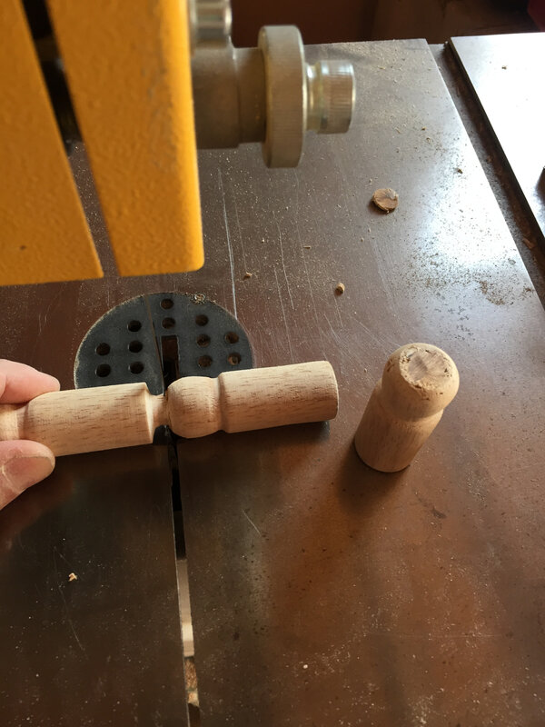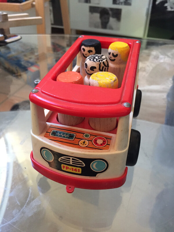 Le camion était en bon état, c’est ce qui m’avait motivé à le sauver de la poubelle il y a longtemps, il manquait simplement les bonhommes. Je les ai faits au tour à bois, je les ai séparés à la scie à ruban, et j’ai peint les visages au Posca.