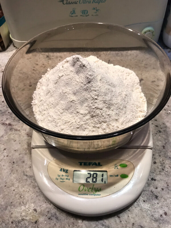 Dans un saladier, peser 500 g de sucre et 280 g de farine