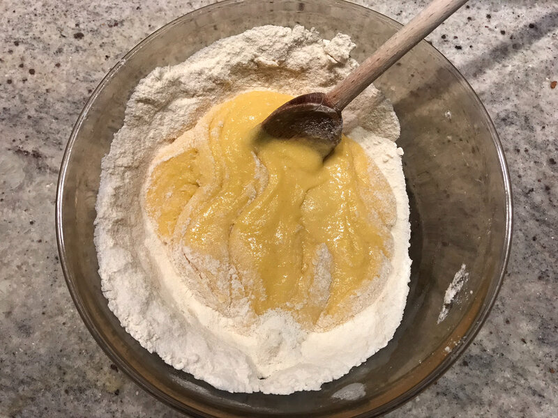 Le lendemain, on peut cuire. Préchauffer le four à 200°C. Remuer la pate pour melanger la peau epaisse de surface.