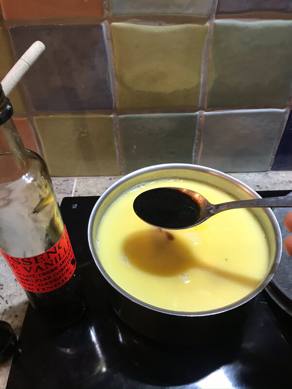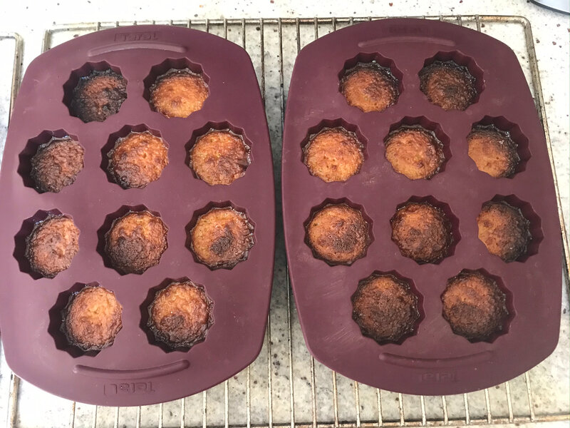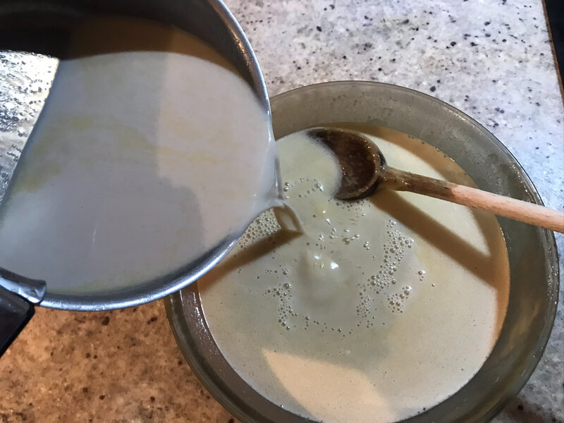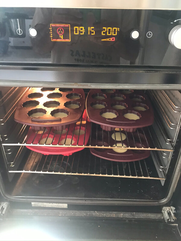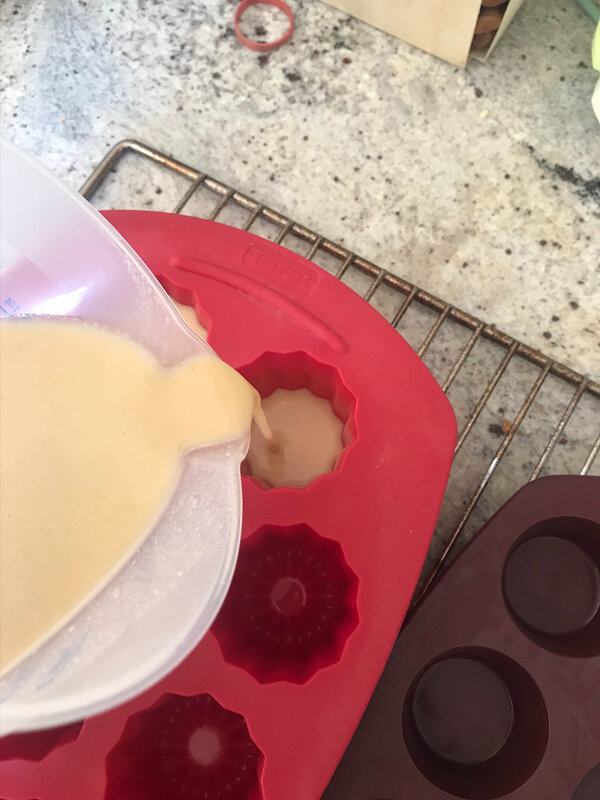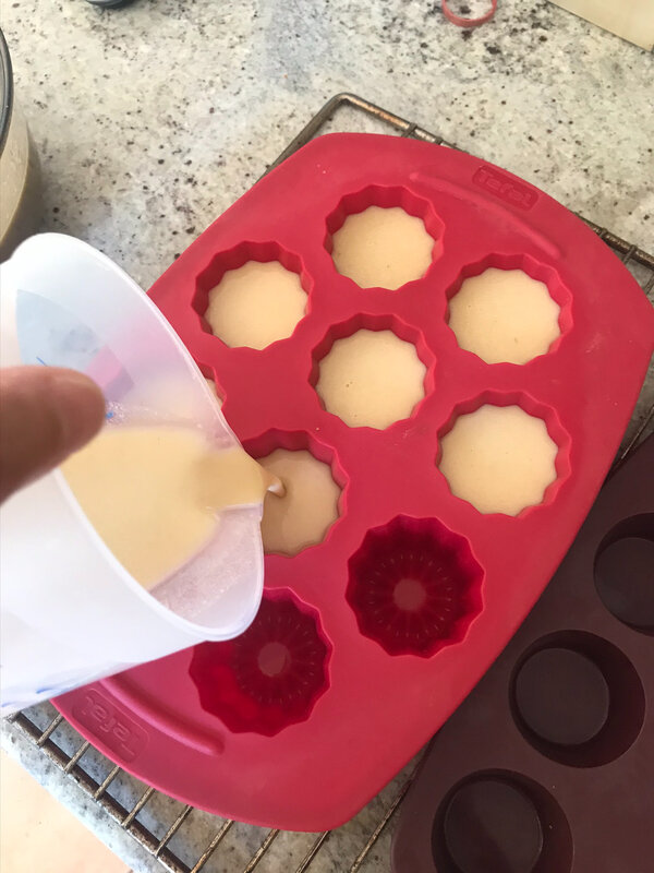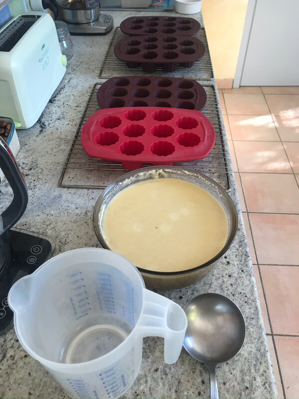 Puis verser dans les moules à cannles en silicone. Ce que j’ai toruvé de plus efficace c’est de verser grace à un pichet.
