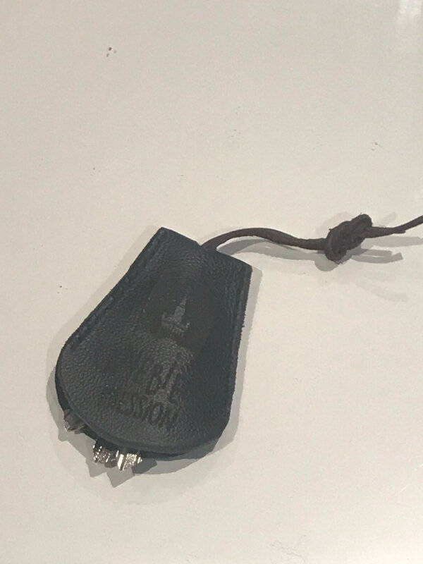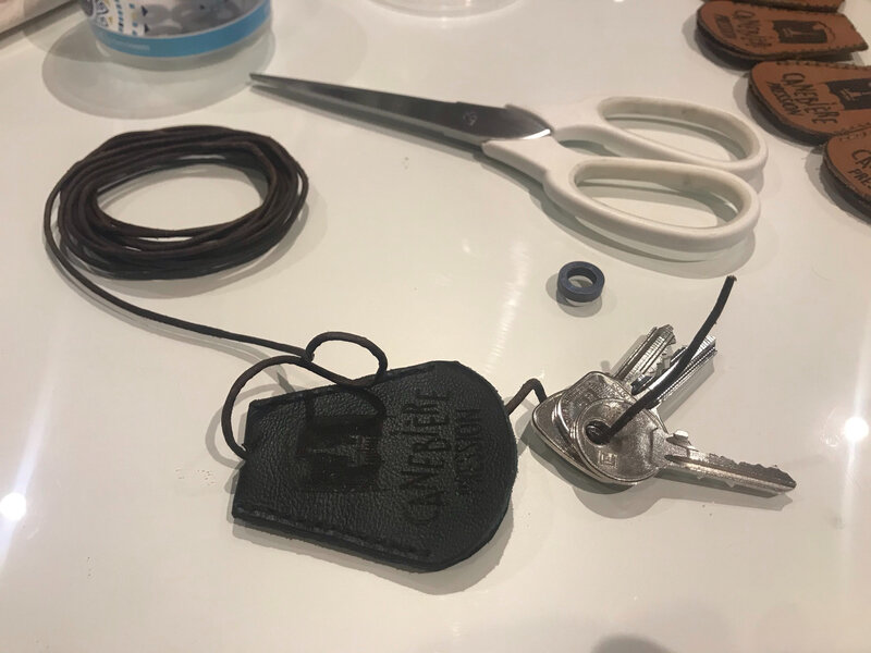 Pour finir et accrocher les clés, un cordon de cuir noué maintient les clés. Je vais le donner assemblé mais il faut défaire le noeud et enlever le cordon pour attacher les clés. Ensuite on l’enfile de nouveau dans le trou – pas si facile – et on fait un noeud pour bloquer. J’avoue que ce n’est pas très rapide, il vaut mieux l’utiliser pour des clés que l’on n’enlève que rarement.