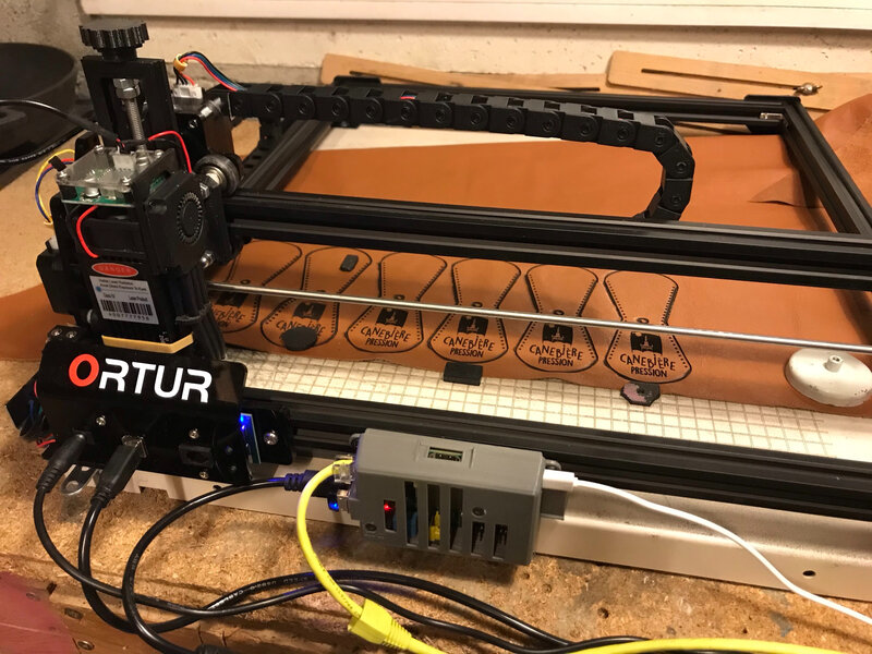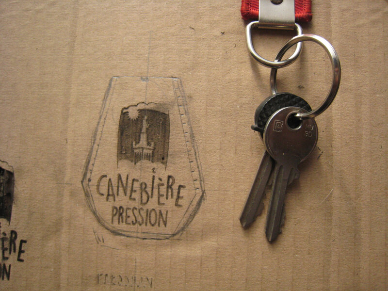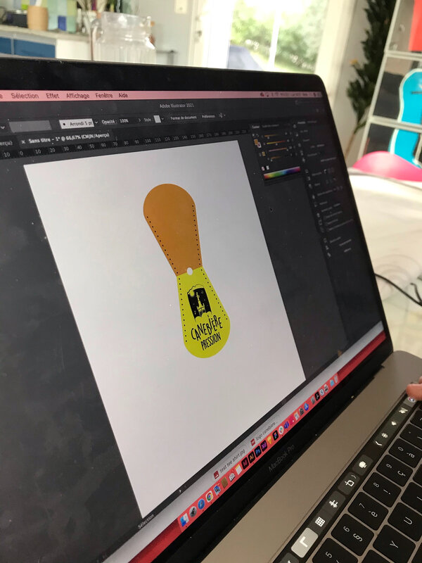 C’est une réalisation collective: j’ai lancé l’idée, Jérémie a fait une maquette en carton, Chloé qui avait fait le logo a créé l’image du porte clé avec le logo et les points de couture. Jérémie a programmé et fait les gravures dans le cuir.