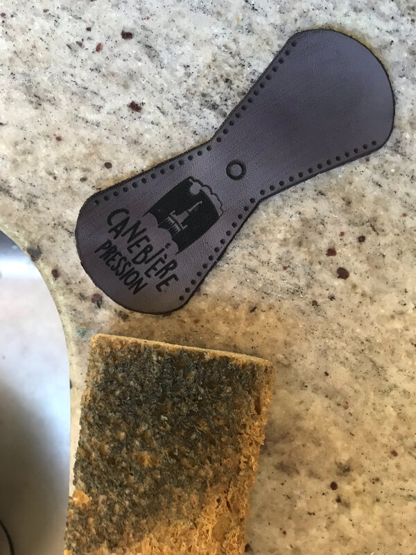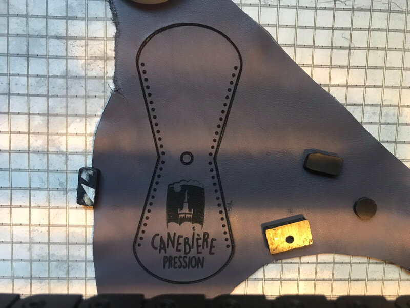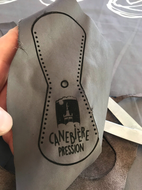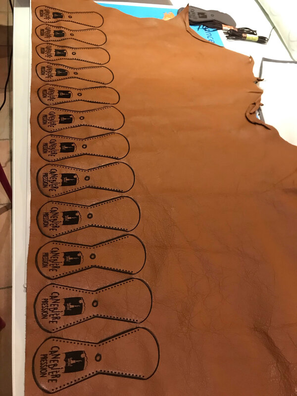 Le laser a gravé le cuir mais pour le couper il fallait plusieurs passes et cela noircissait beaucoup, j’ai donc recoupé le cuir ensuite avec des ciseaux. J’ai nettoyé la gravure avec une éponge humide, il part du noir, et ensuite le cuir reste propre. Le premier exemplaire est probant, on peut lancer la série.
