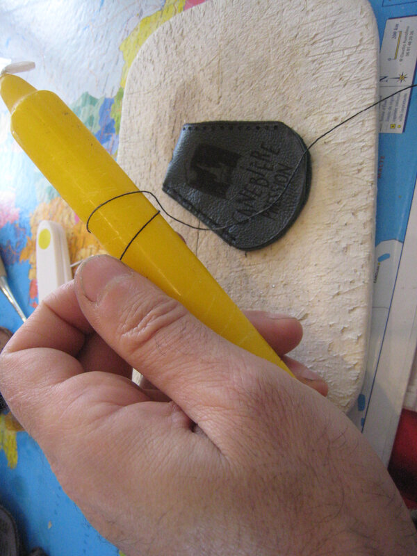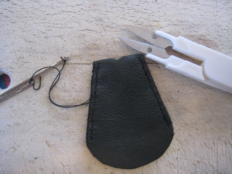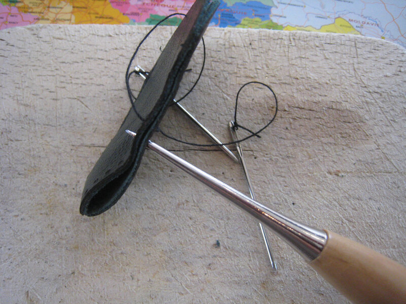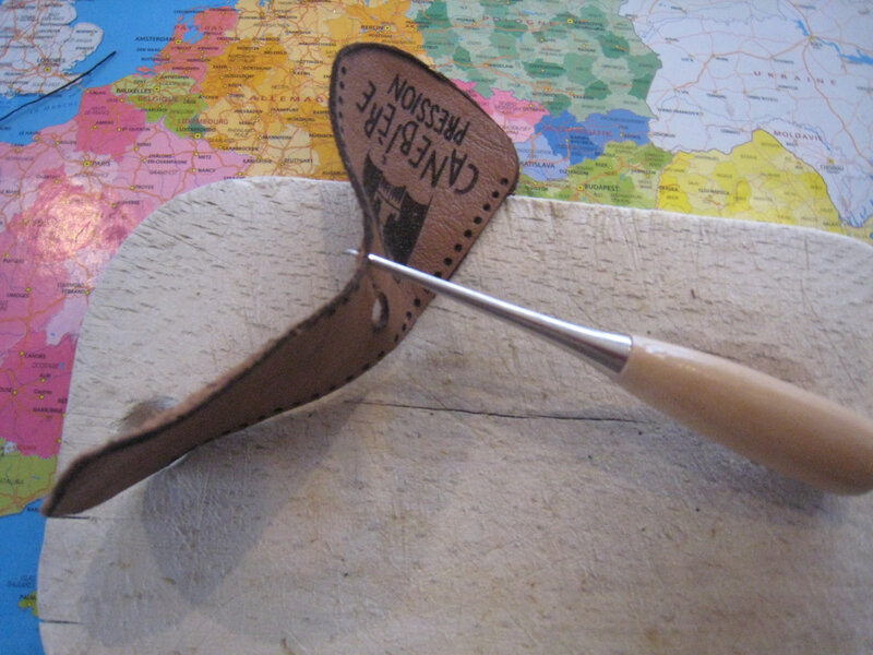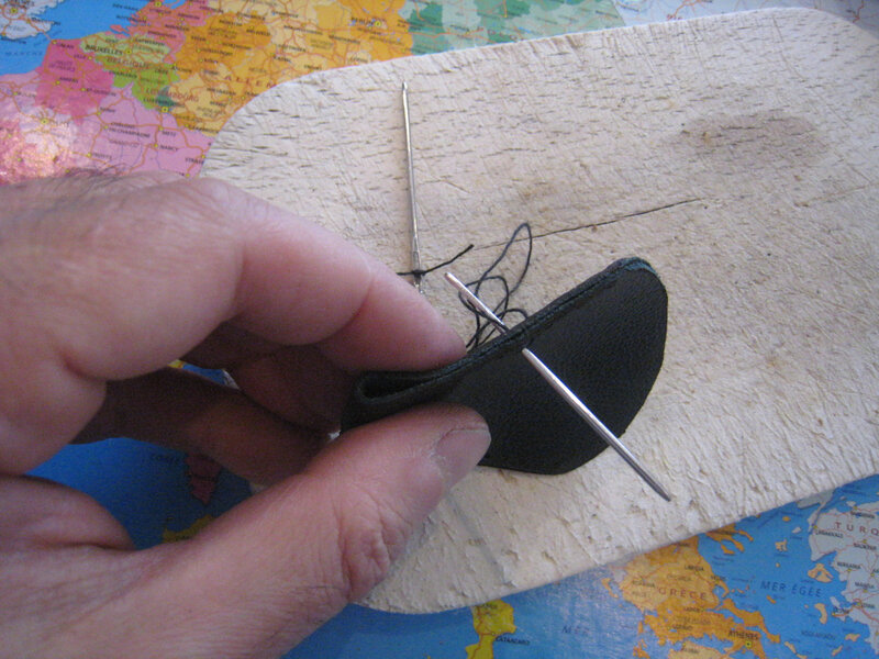 Pour coudre, j’ai percé les trous avec une alène, au niveau des points gravés.
