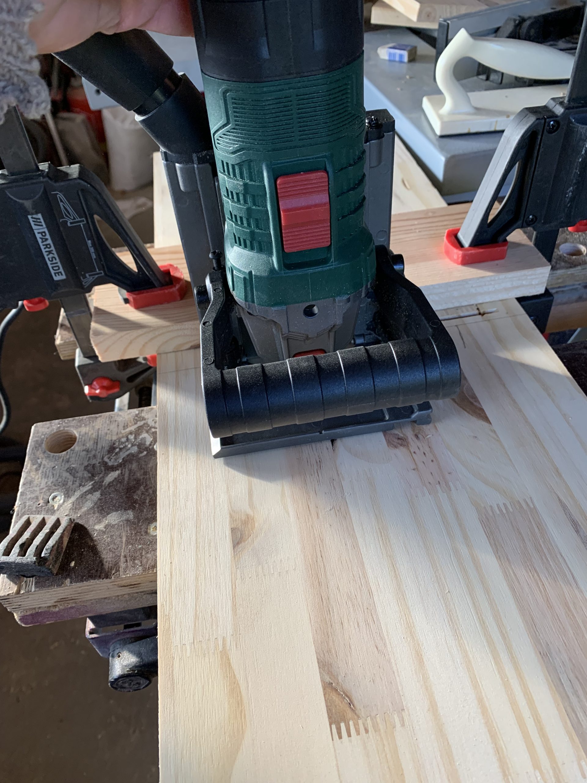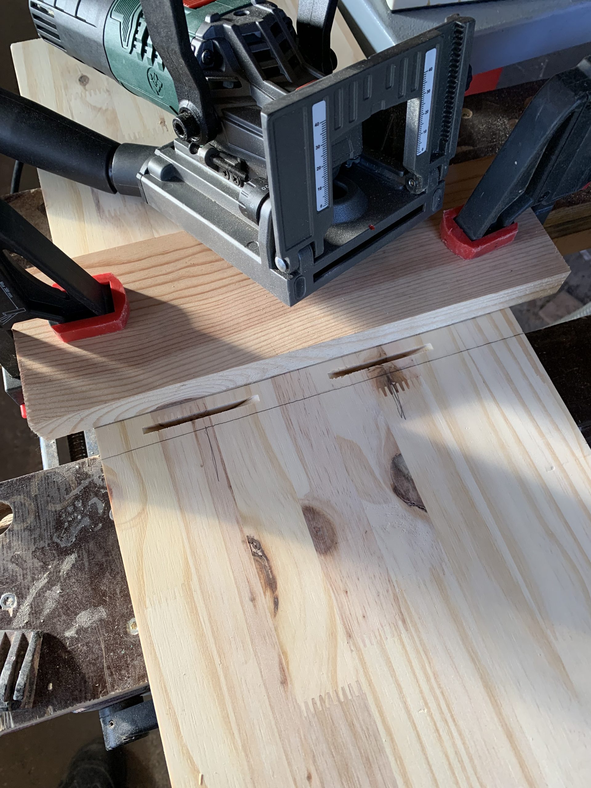 Pour l’assemblage, j’ai utilisé une technique nouvelle pour moi, les biscuits, ou lamelles, car j’ai acheté chez L..L une lamelleuse pas chère.