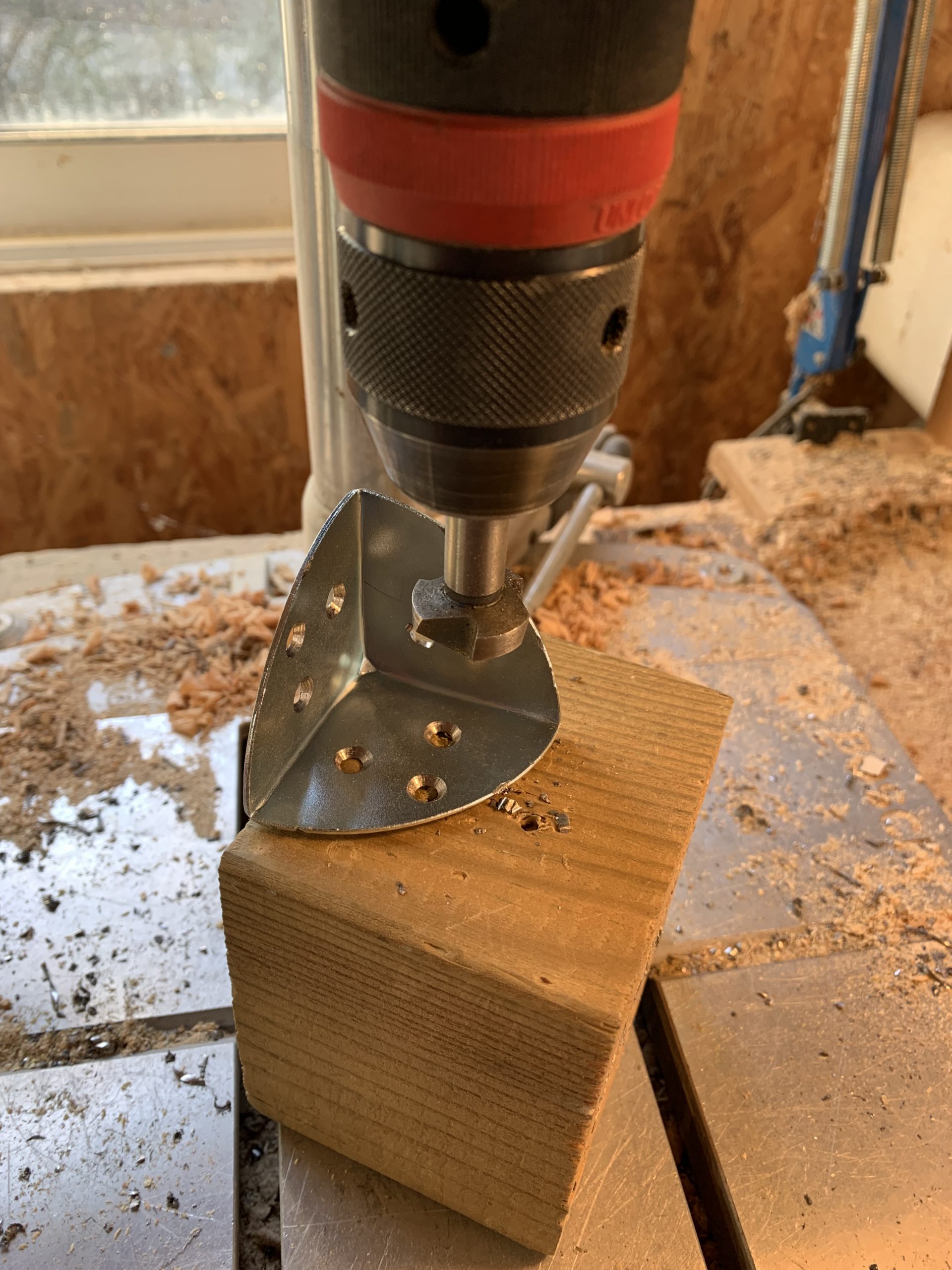 Pour fixer l’étagère sur le mur, j’ai utilisé des coins de malle métalliques, que j’ai repercés pour mettre plusieurs vis.