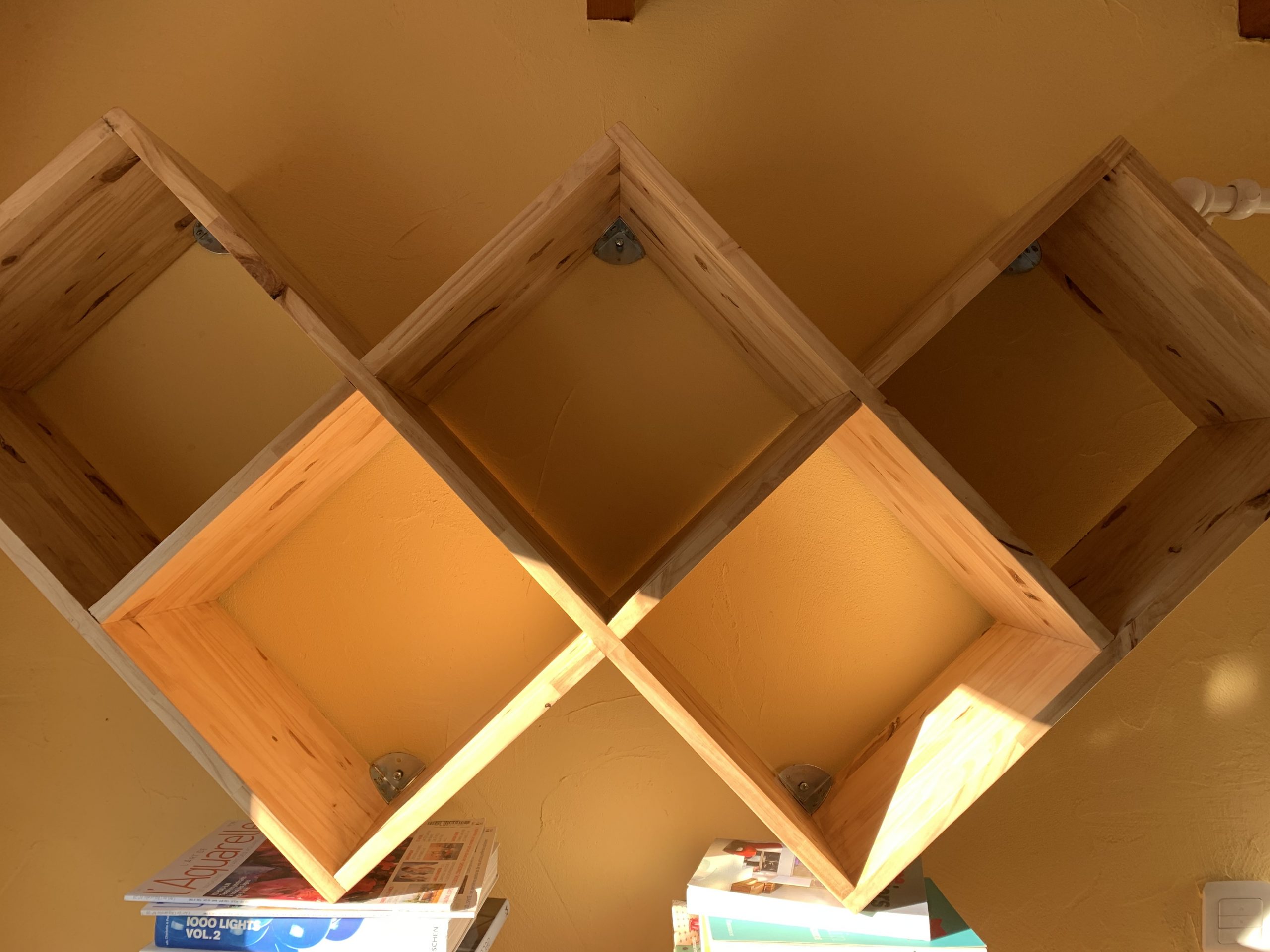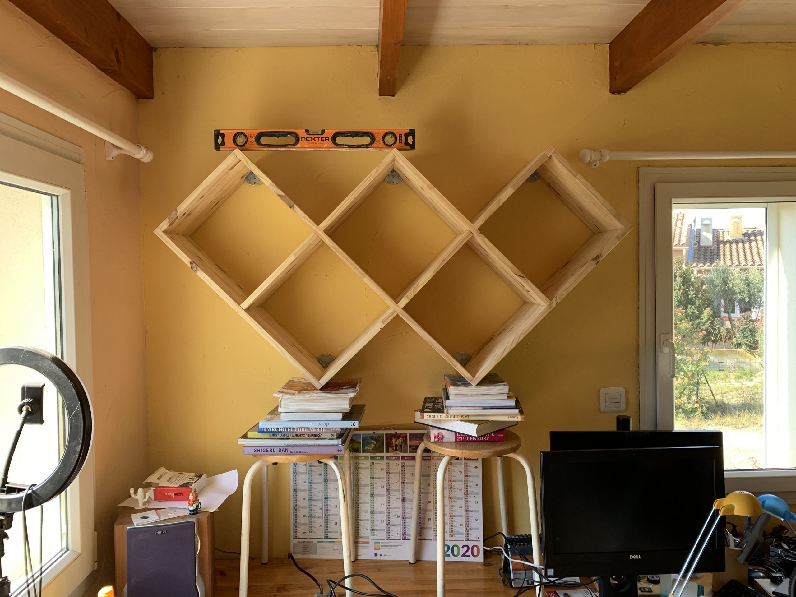 J’ai voulu faire une bibliotheque un peu originale et qui prenne bien sa place dans le mur disponible.