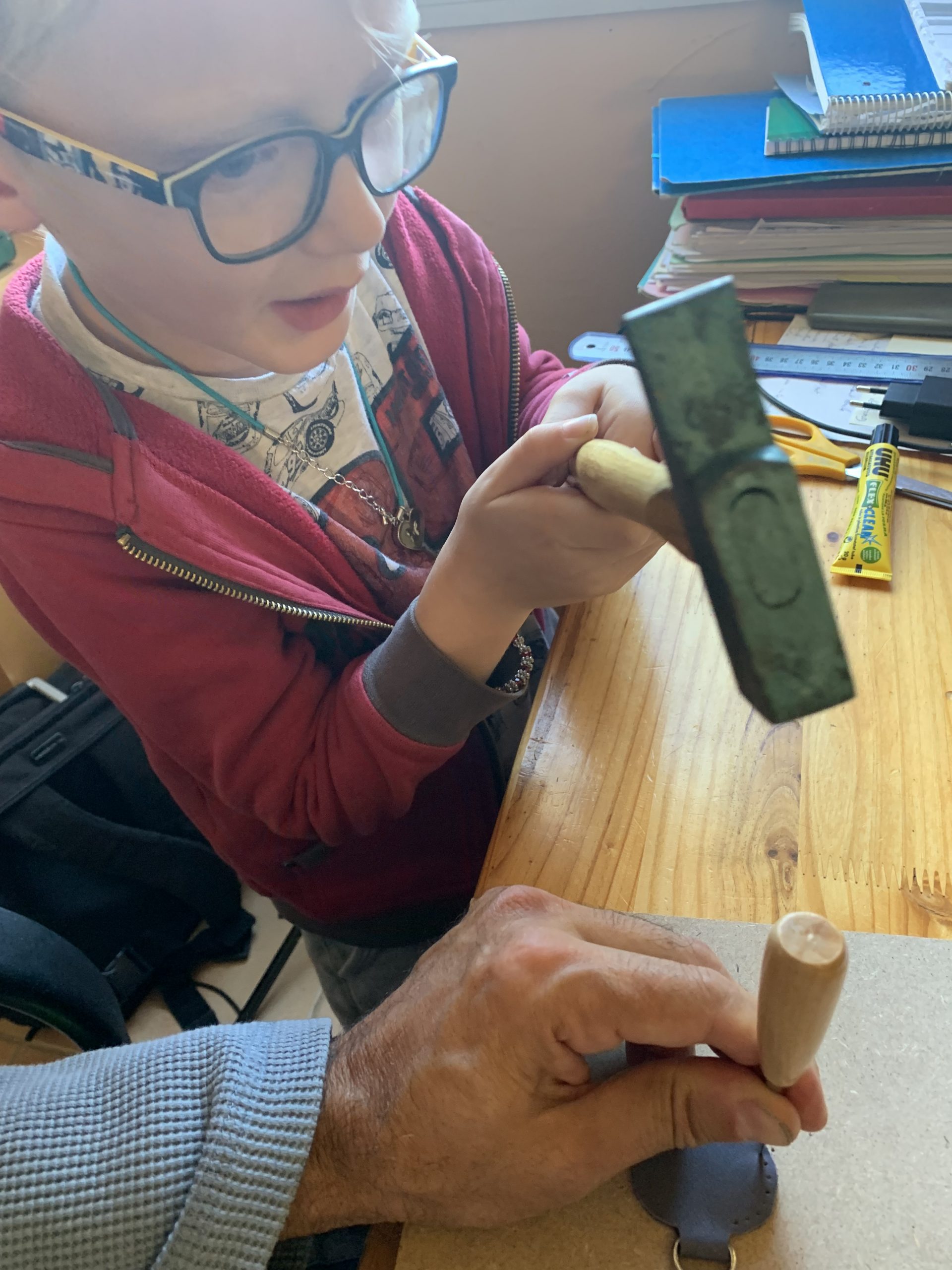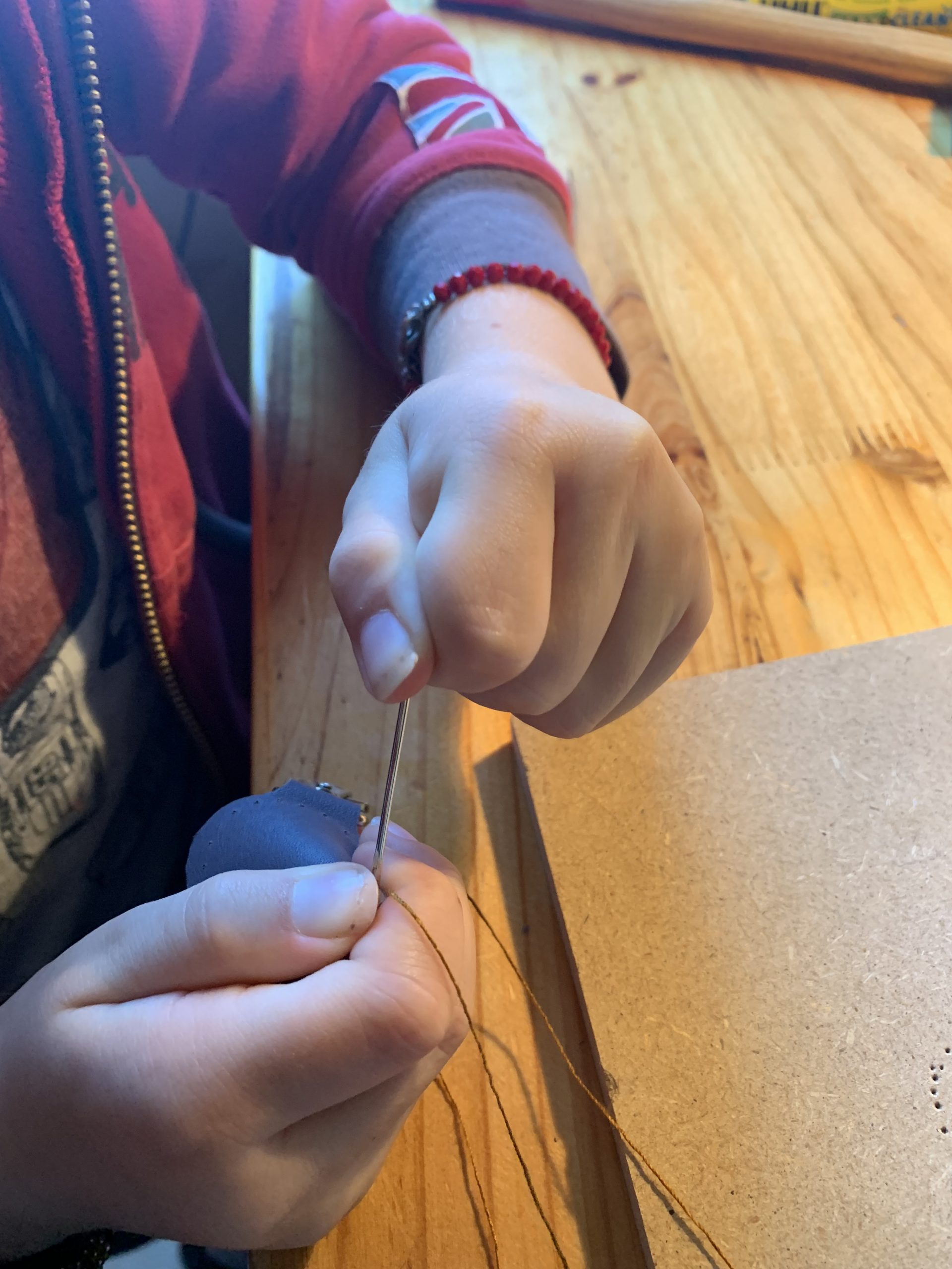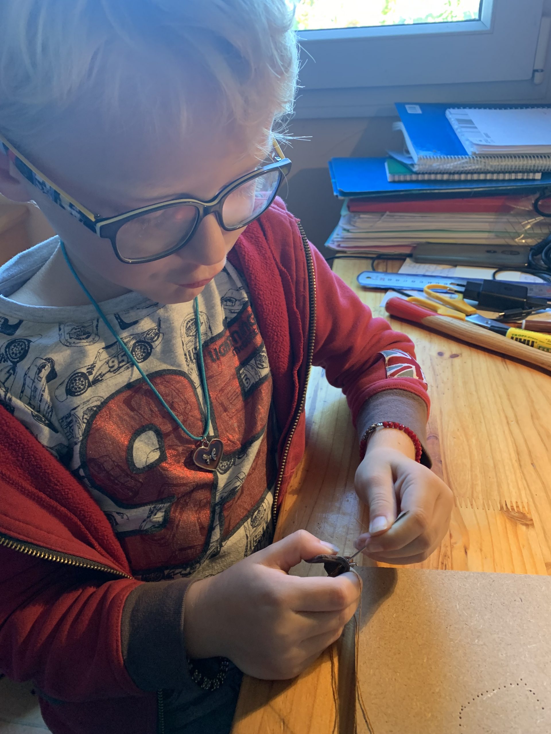 Puis nous avons poinçonné les trous pour la couture avec un poinçon et un marteau. Celà a bien fait rigoler Benjamin, il est allé de bon coeur mais pas d’accident à déplorer!