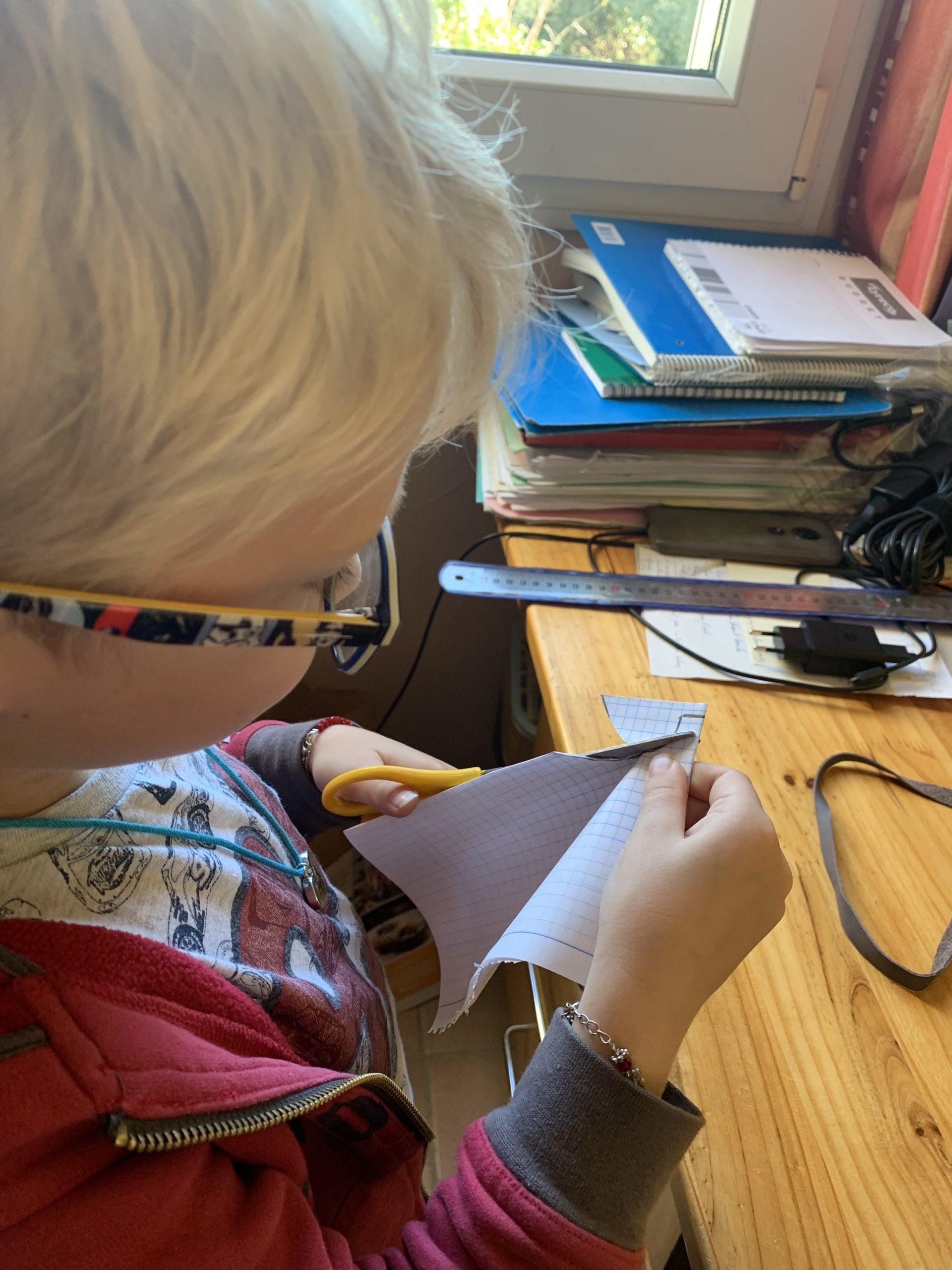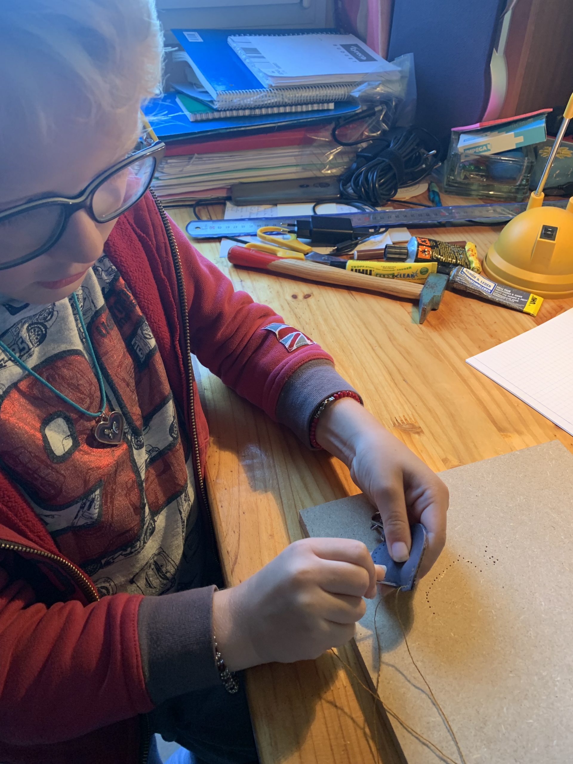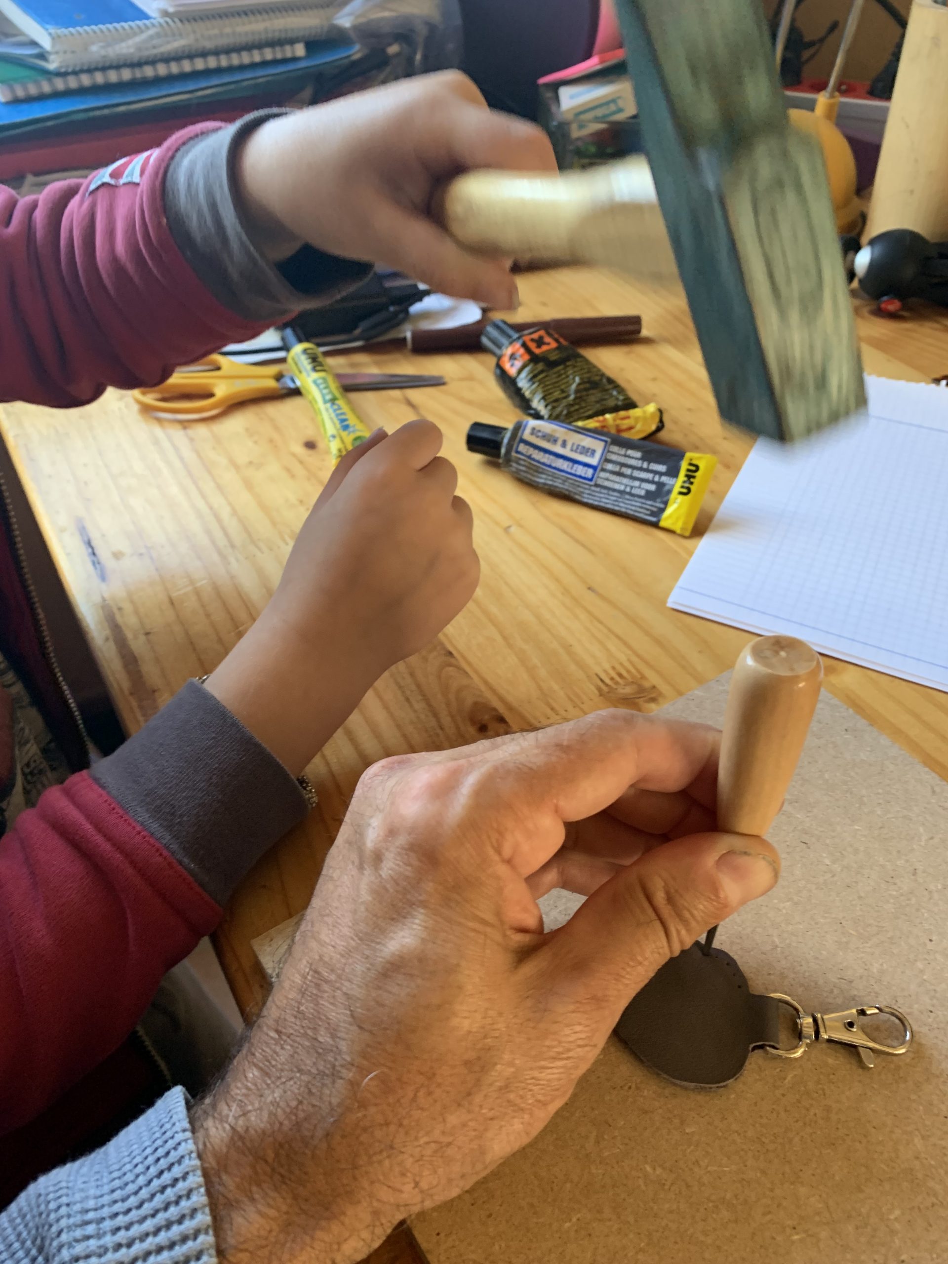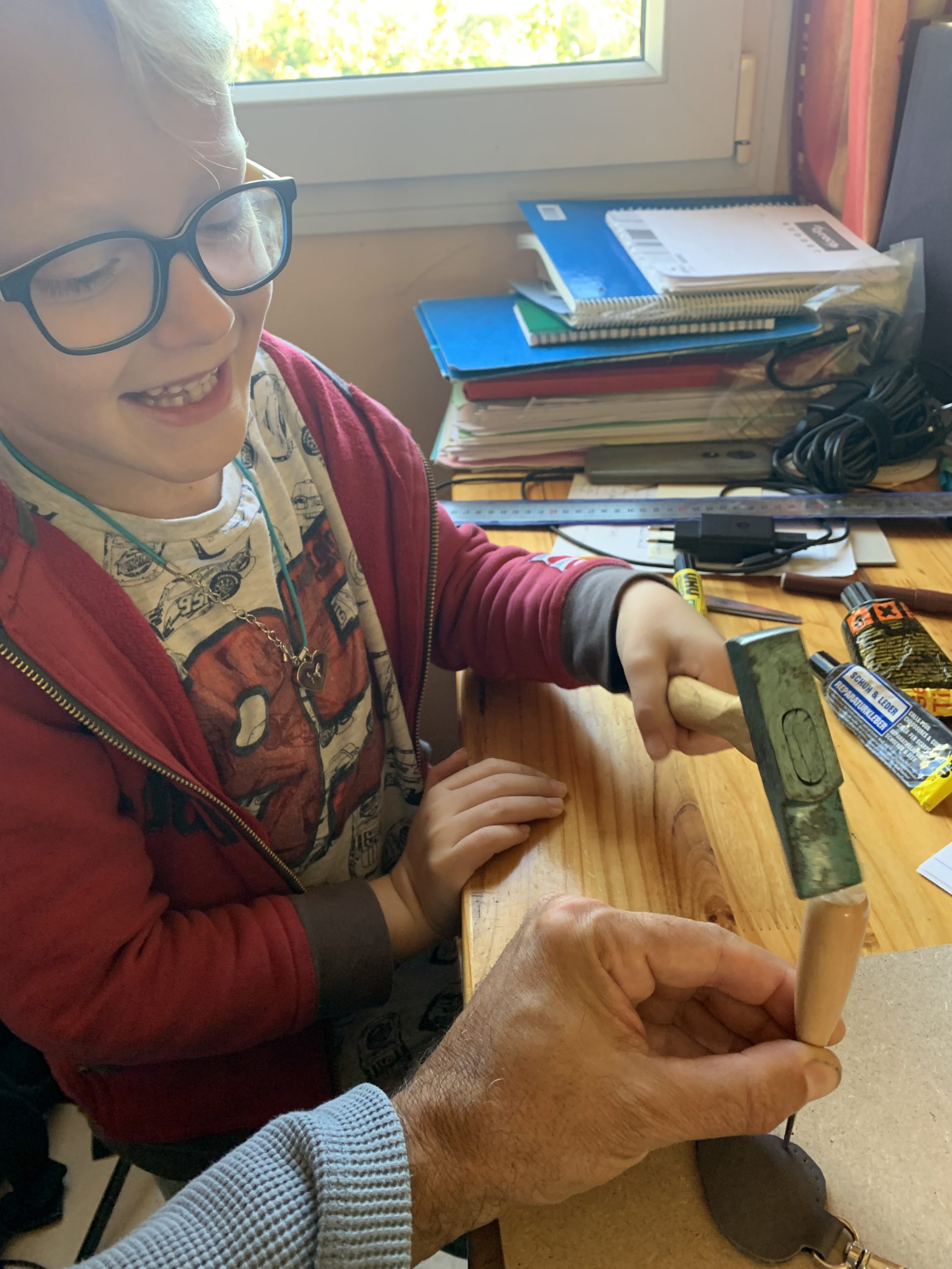 Puis nous avons poinçonné les trous pour la couture avec un poinçon et un marteau. Celà a bien fait rigoler Benjamin, il est allé de bon coeur mais pas d’accident à déplorer!