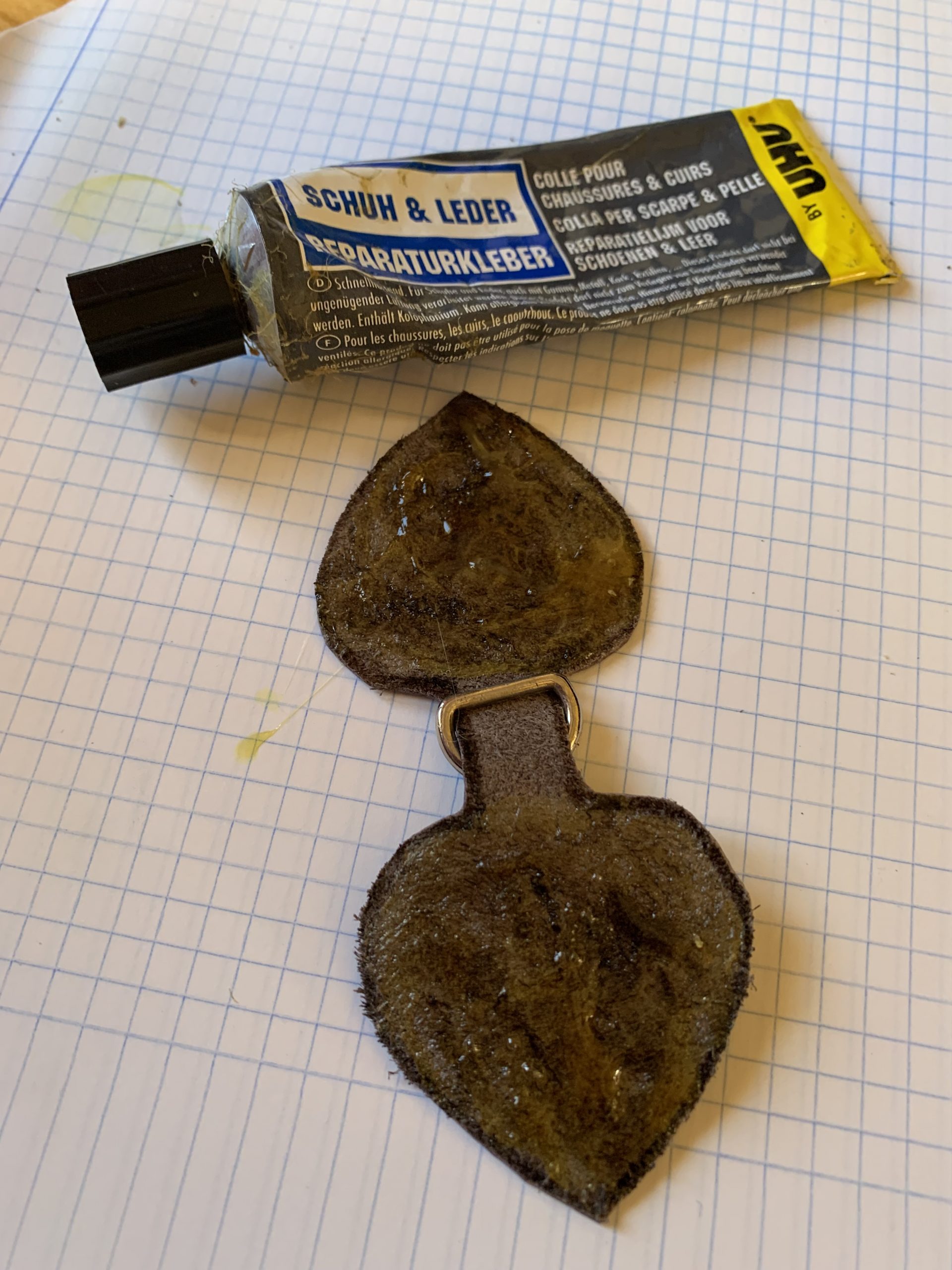 Et après un petit essai pour vérifier que tout va bien, nous avons encollé à la colle pour le cuir et collé.