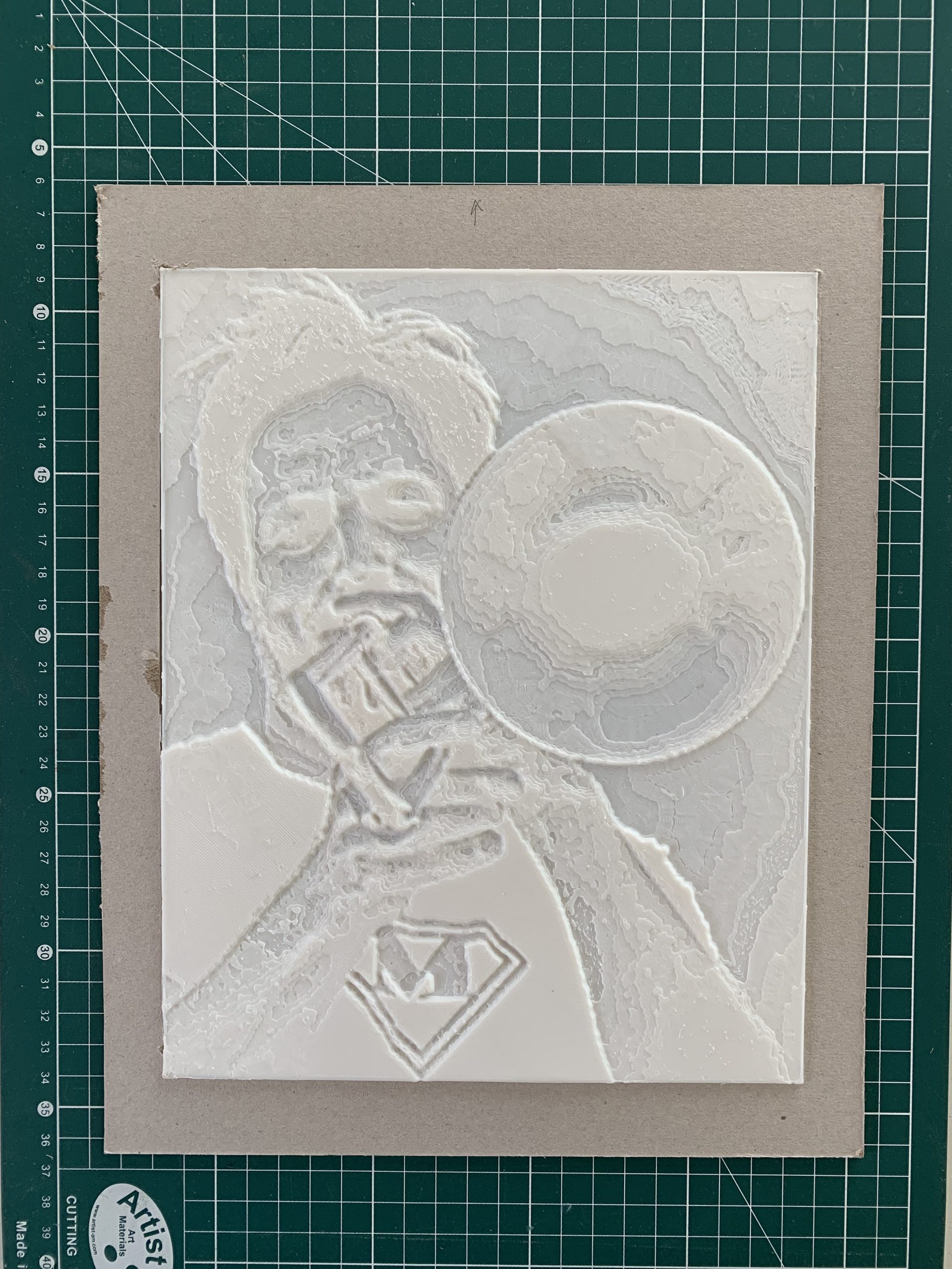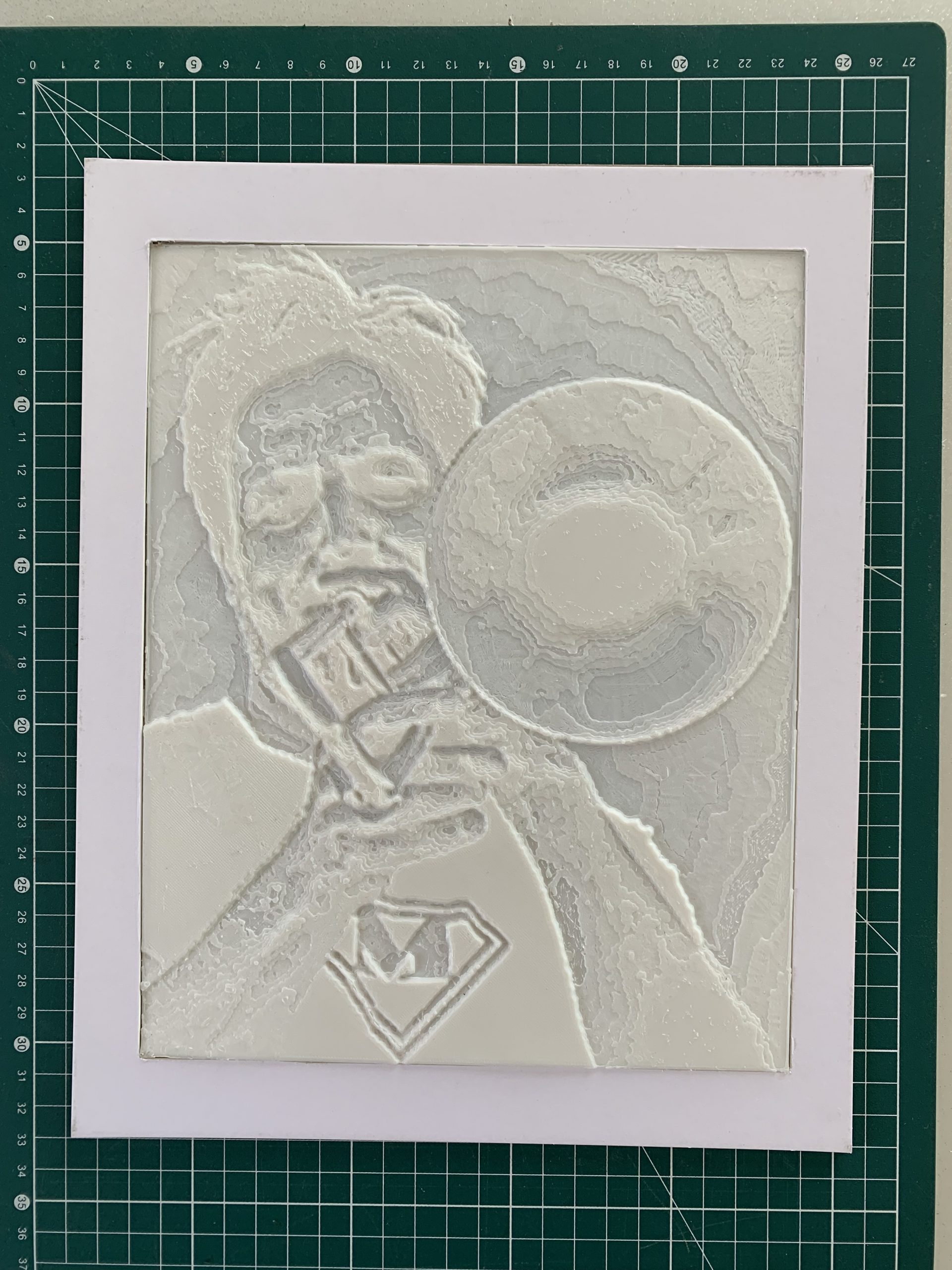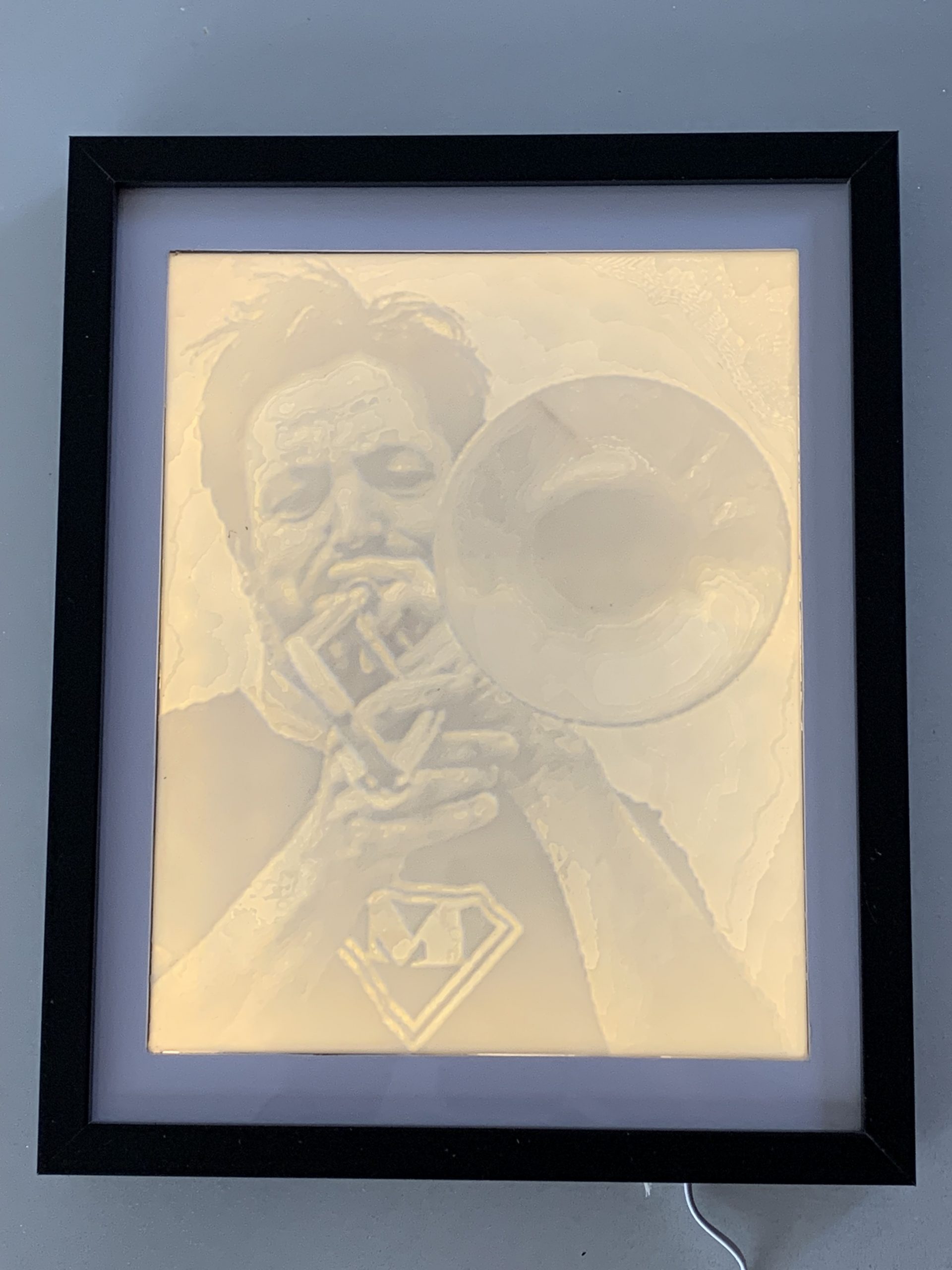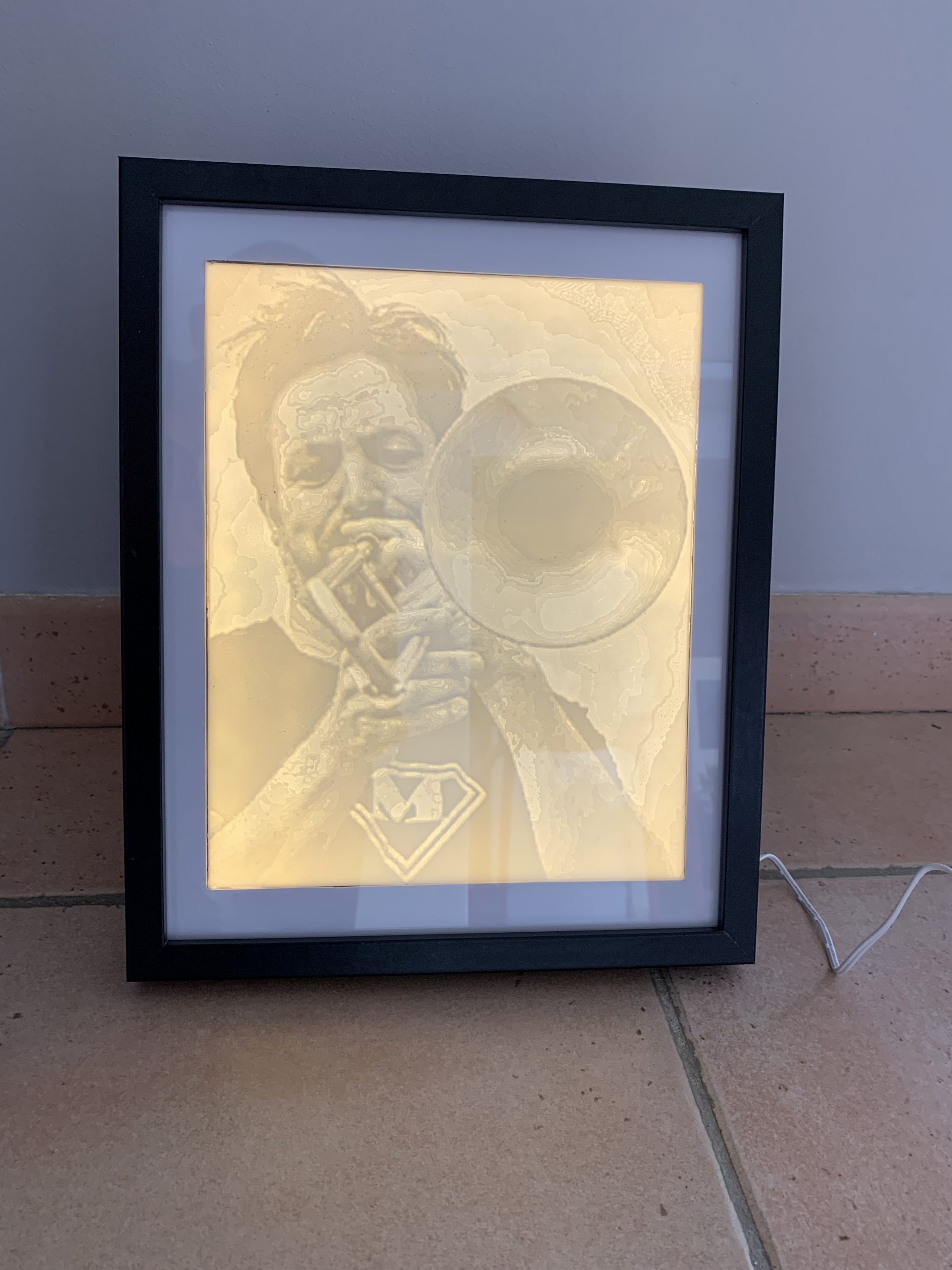 Pour les 50 ans de mon ami Fred qui joue du trombone à la fanfare Mudanza, j’ai fait une lithophanie. C’est une lampe qui éclaire en transparence une plaque dont les différence d’épaisseur permettent d’obtenir des parties plus claires ou plus foncées. Je crois qu’au départ c’est fait en pierre taillée, mais je l’ai faite en impression 3D.