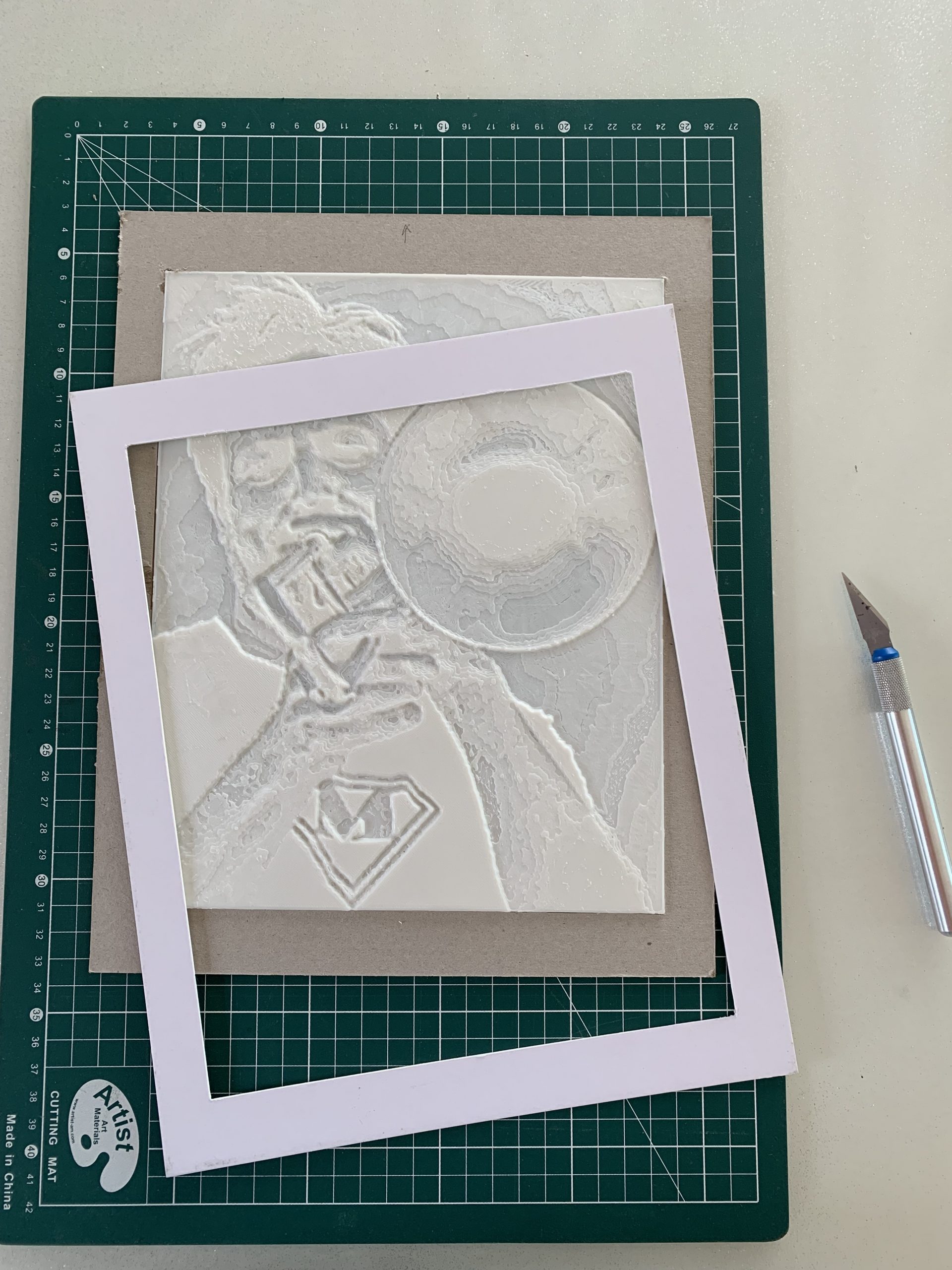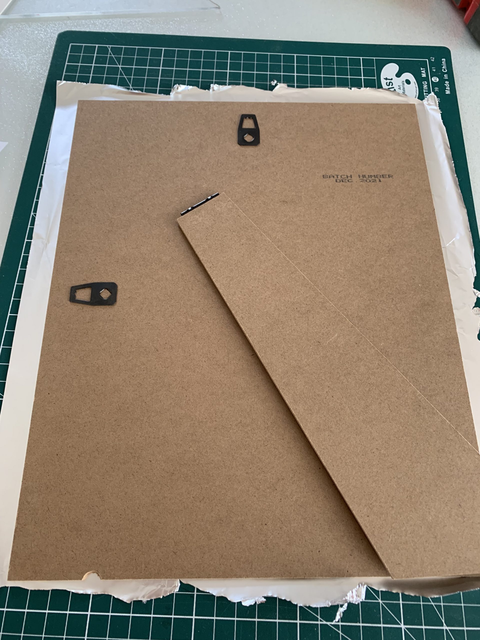 J’ai intégré la plaque dans un cadre plus grand et j’ai recoupé un carton et le passe-partout pour la faire tenir.