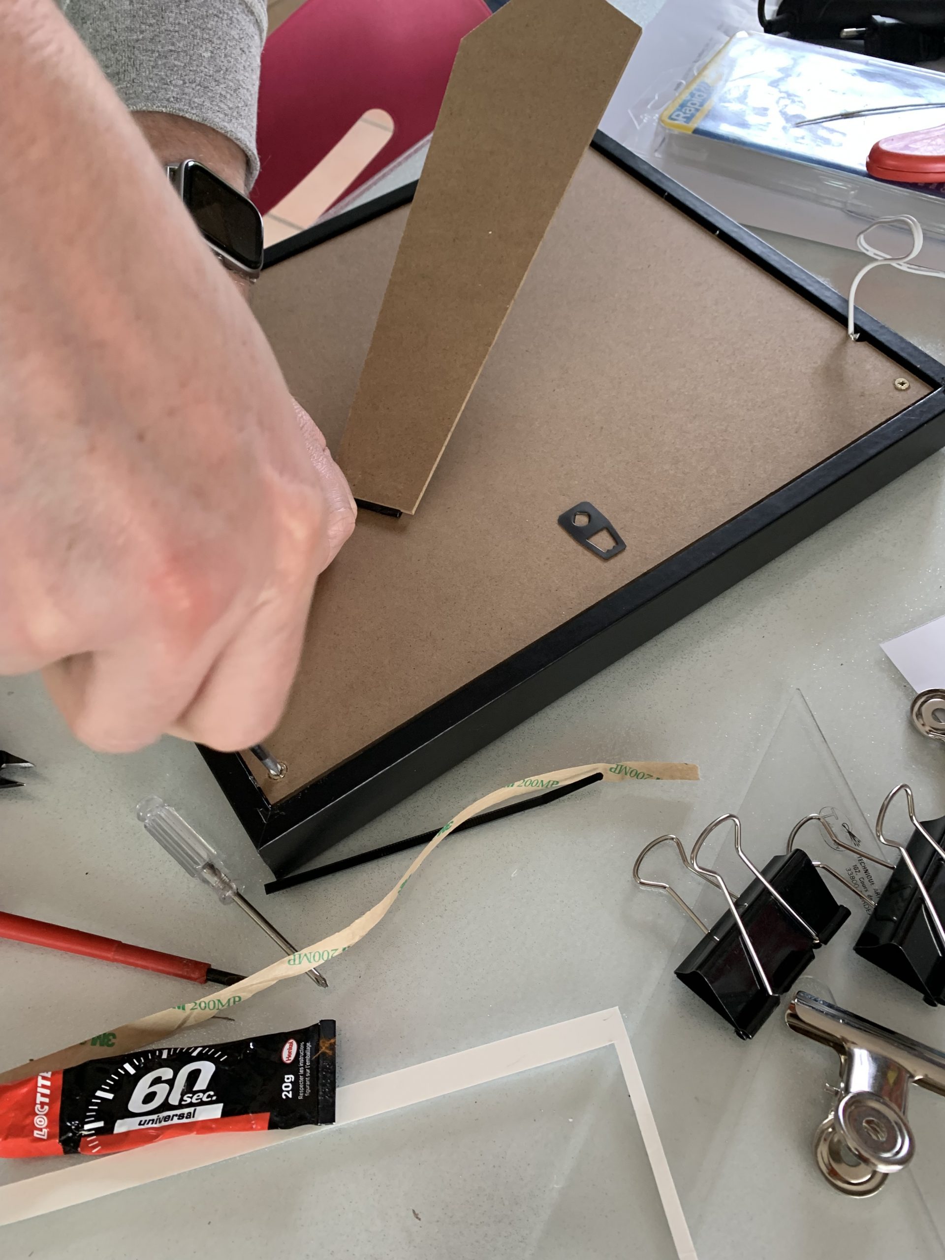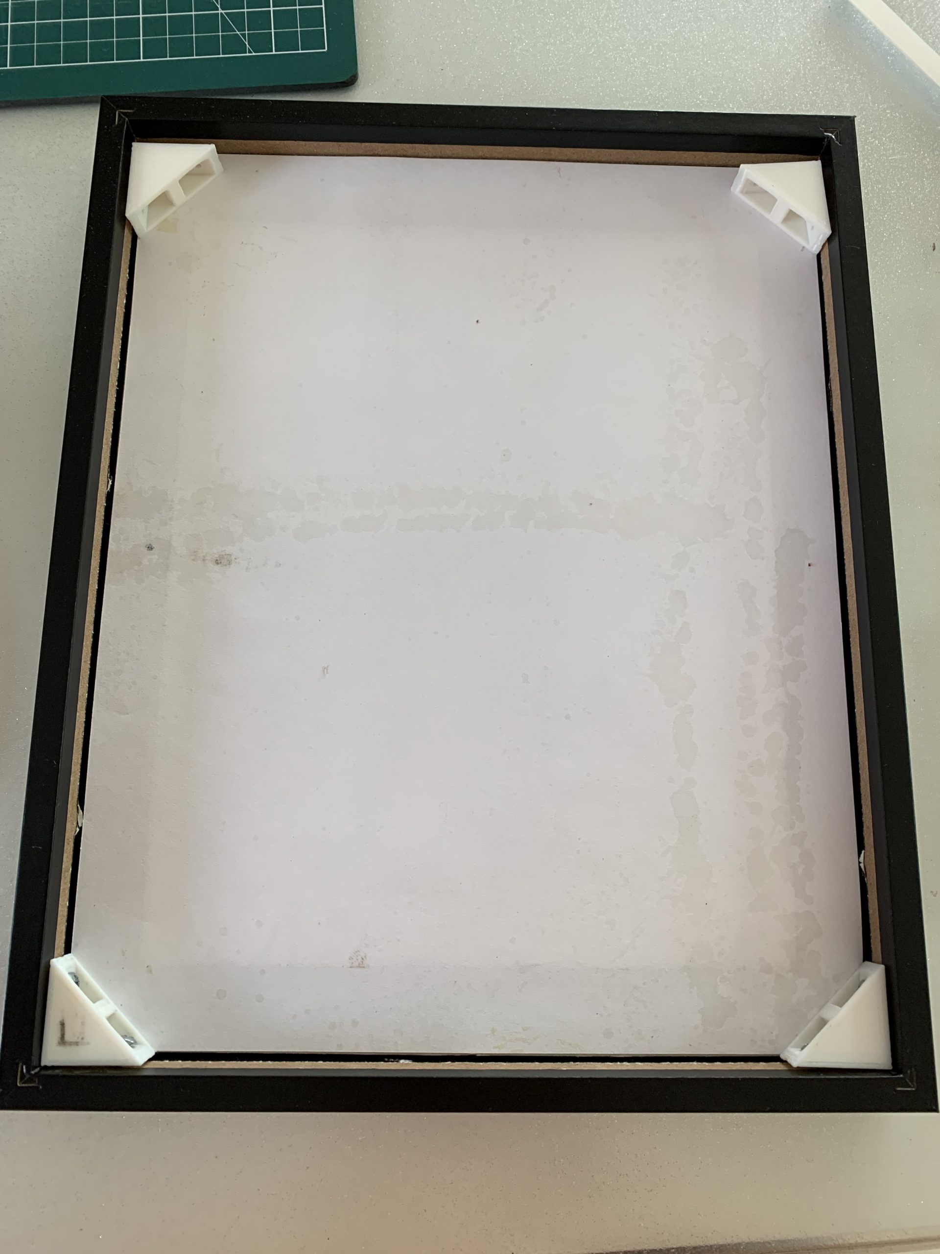 A l’arrière, j’ai collé une feuille de papier fin. Jérémie s’est associé au projet et pour faire tenir le carton plaqué contre la vitre il a fait des pièces en impression 3D qui sont fixées sur les flancs du cadre. Ces pièces permettront aussi de visser le fond.