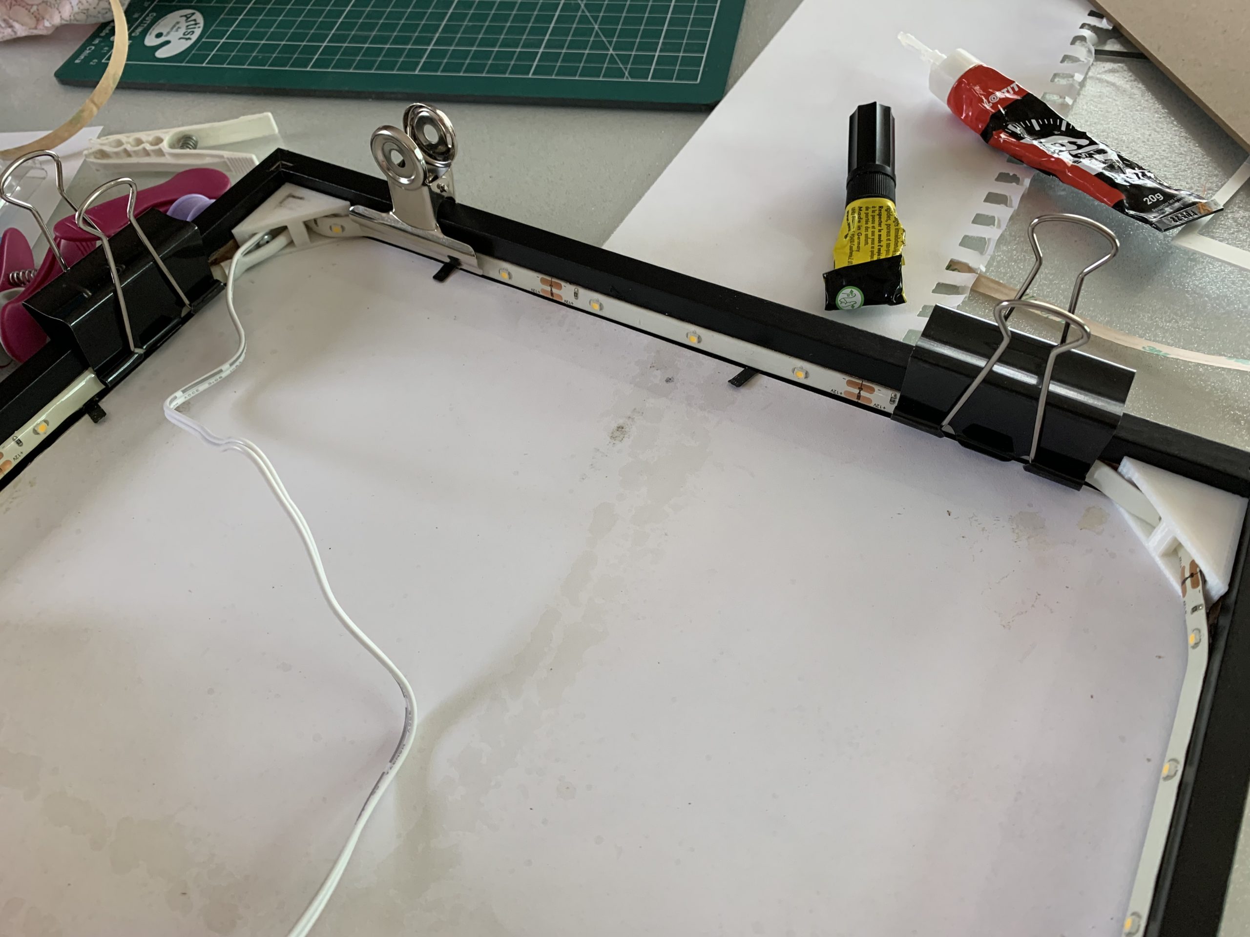 Pour éclairer, j’ai collé une bande de leds sur le chant du cadre. Le ruban passe dans les pièces du coin. Normalement le ruban est autocollant mais pour assurer je l’ai collé avec une colle plus forte.