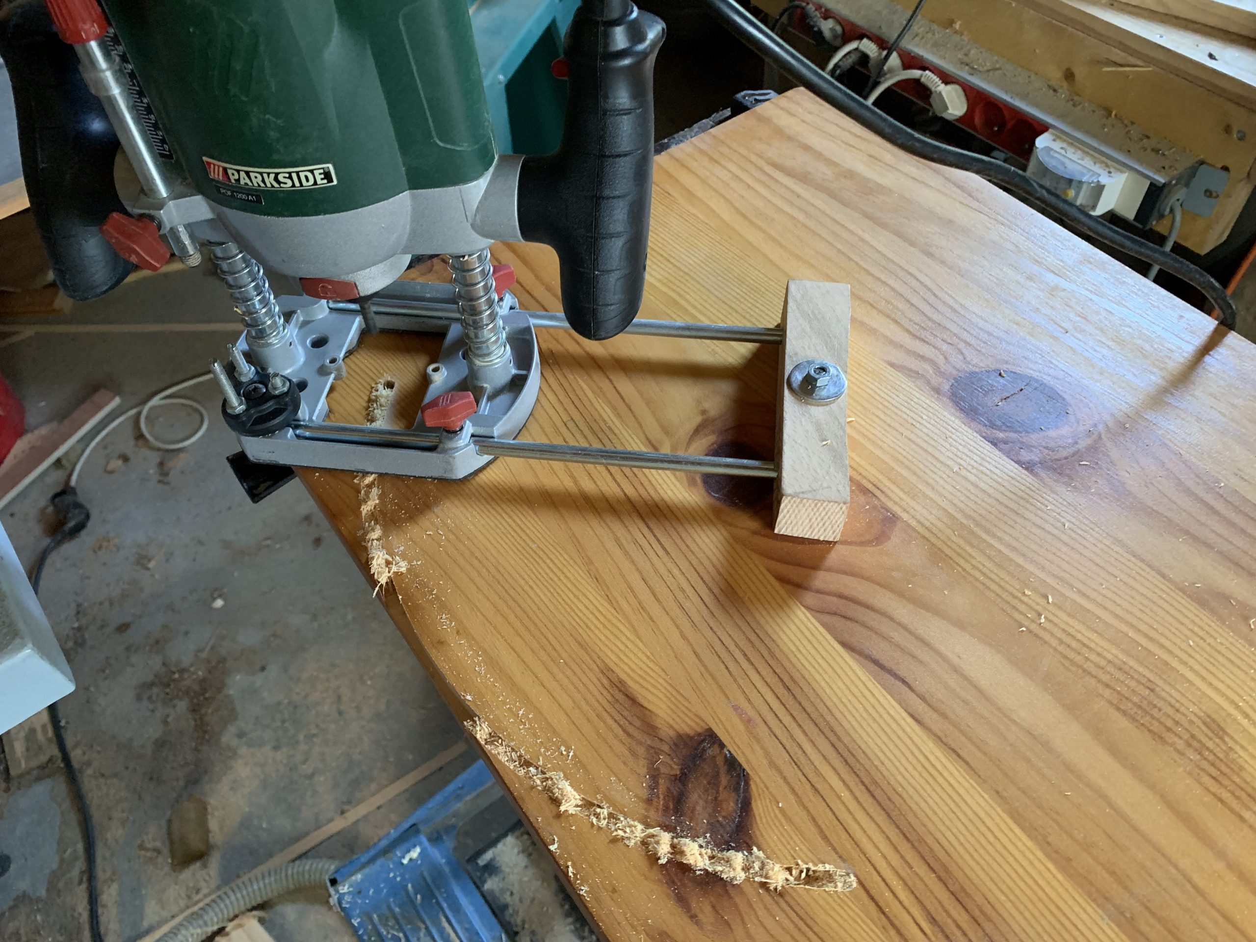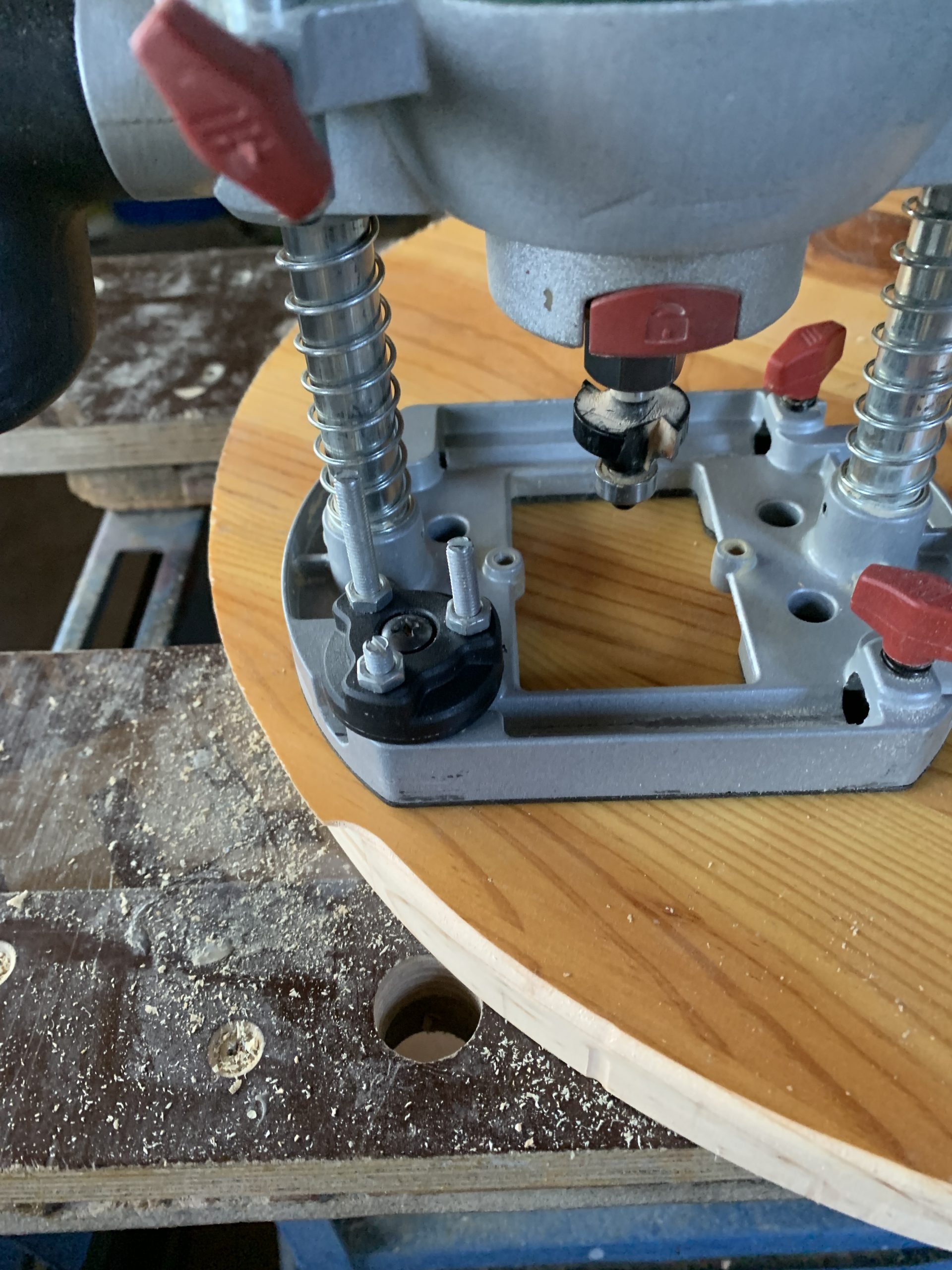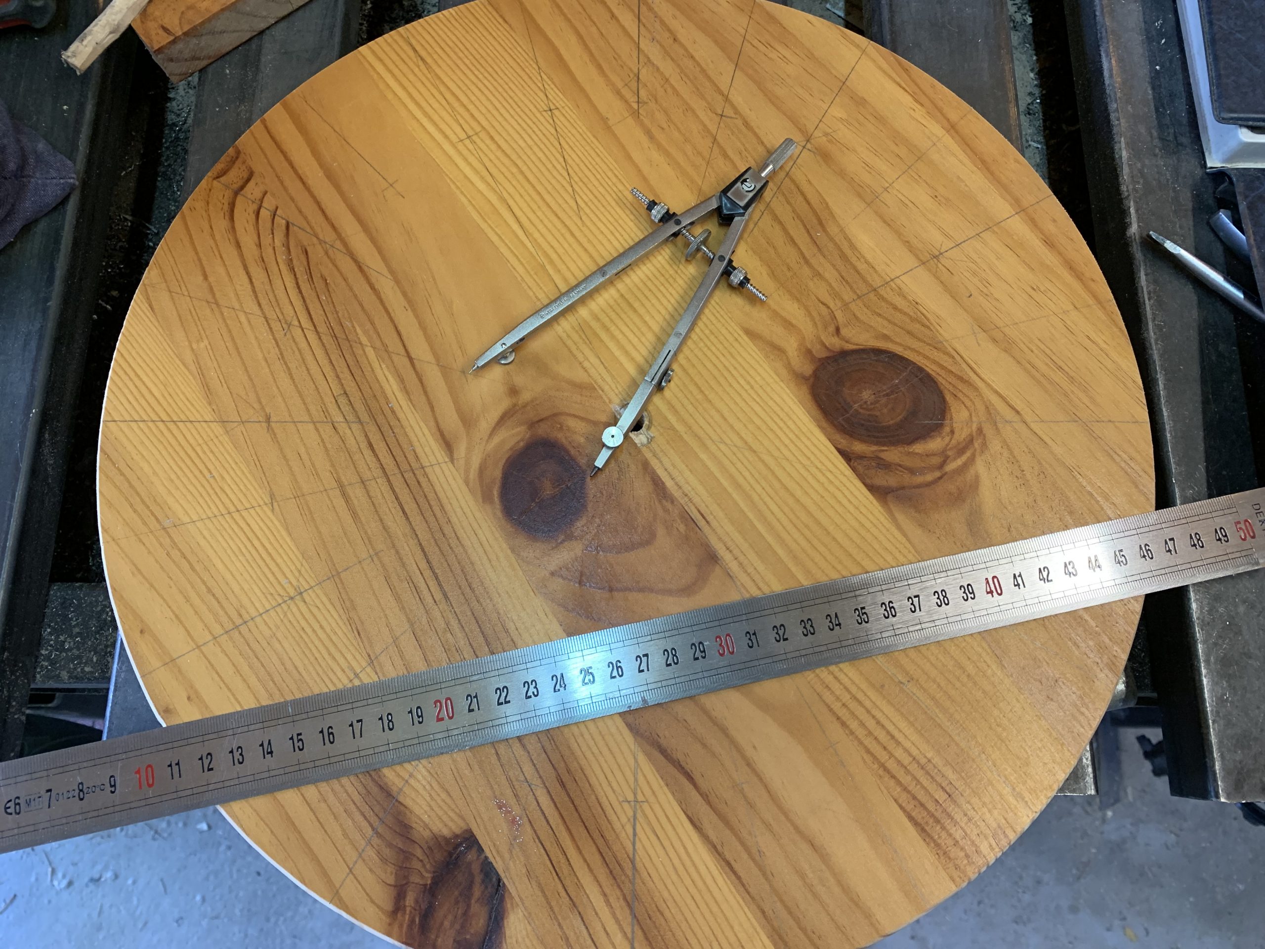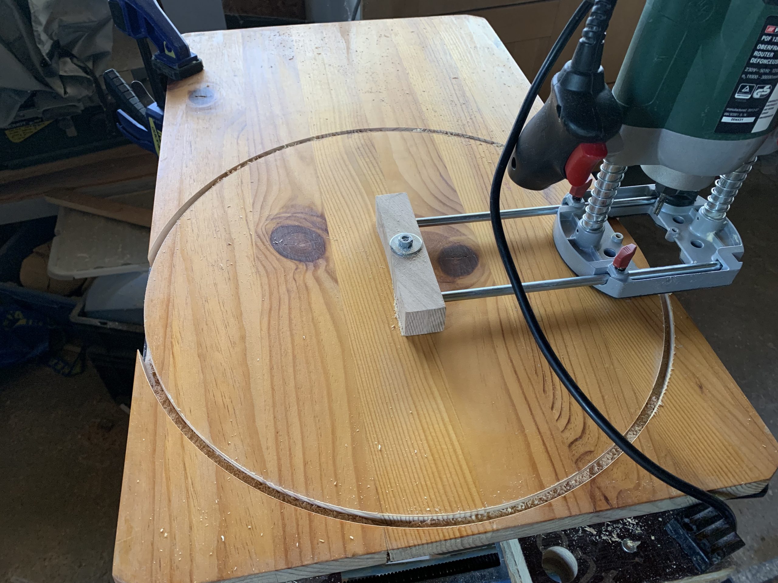 La partie à fabriquer est uniquement la roue de loterie. J’ai choisi une planche déja vernie de récupération, et j’ai fait une gorge en cercle avec la défonceuse et j’ai fini la découpe avec la scie à ruban. J’ai fait un léger arrondi à la défonceuse pour bien finir le bord.