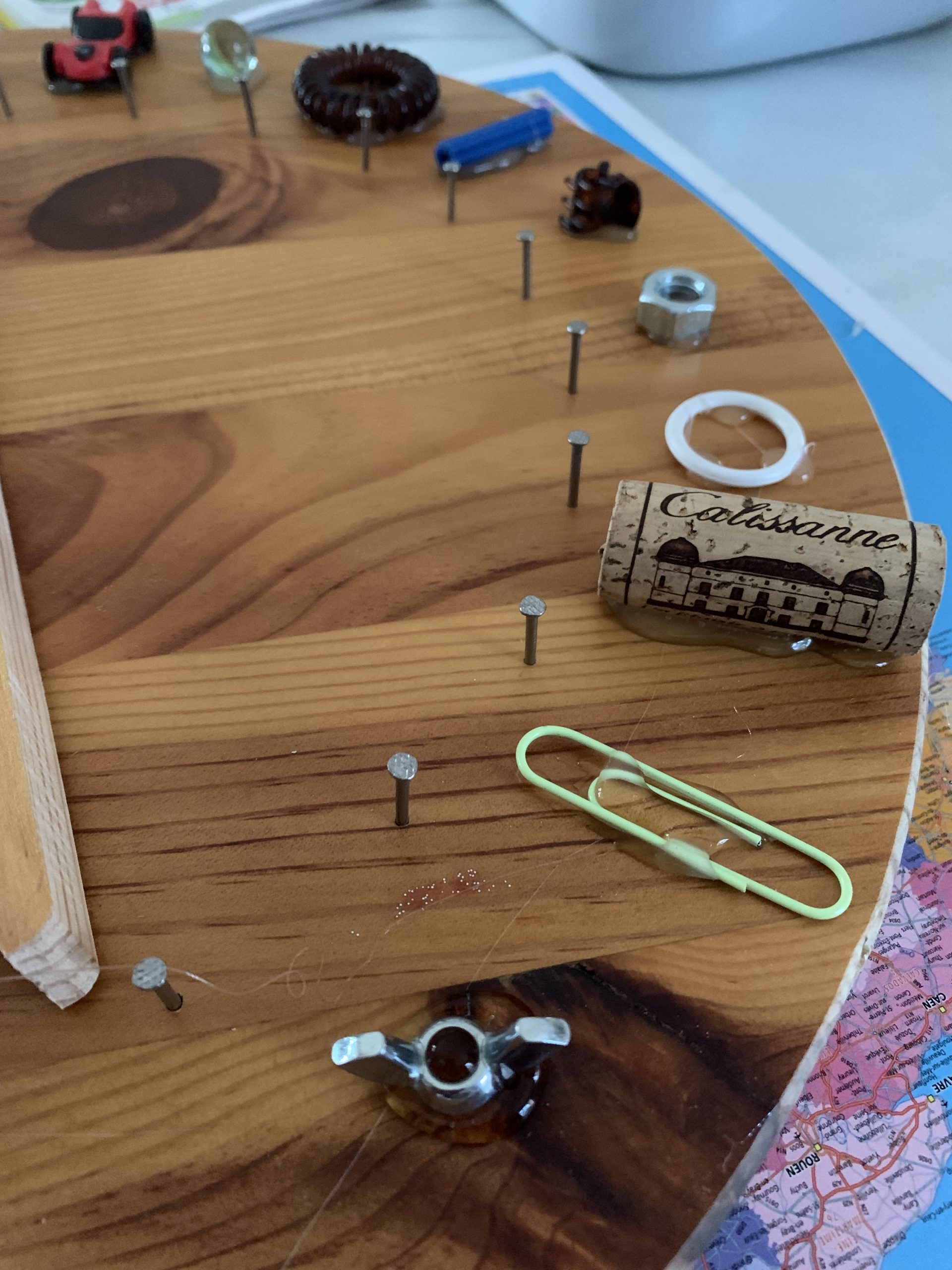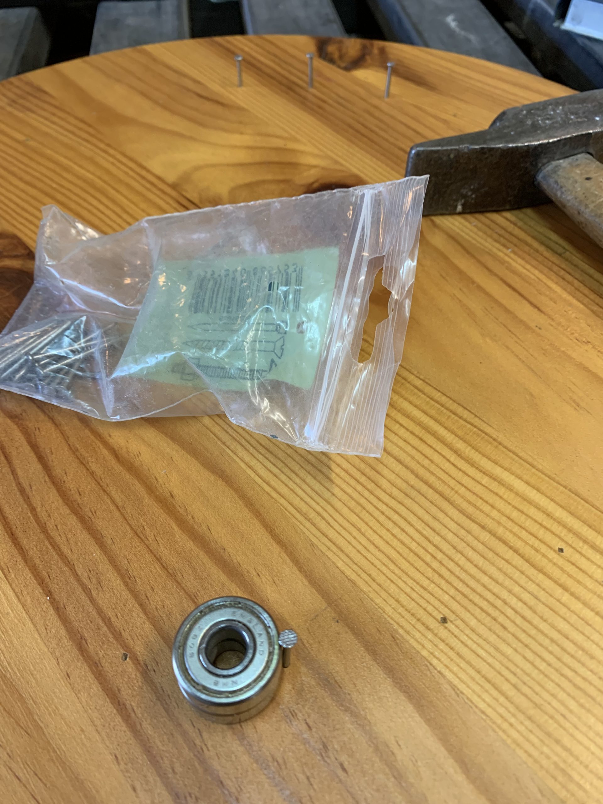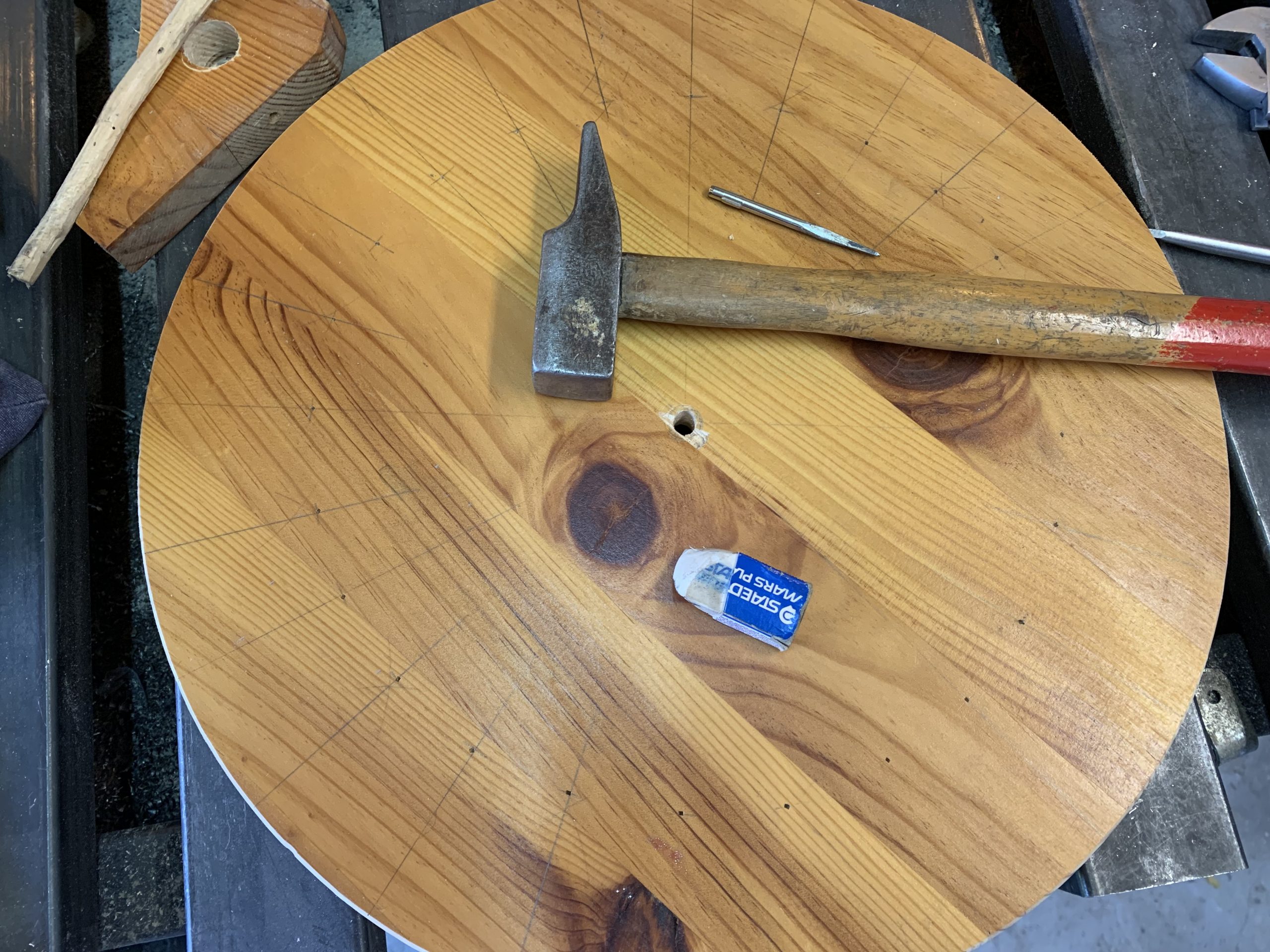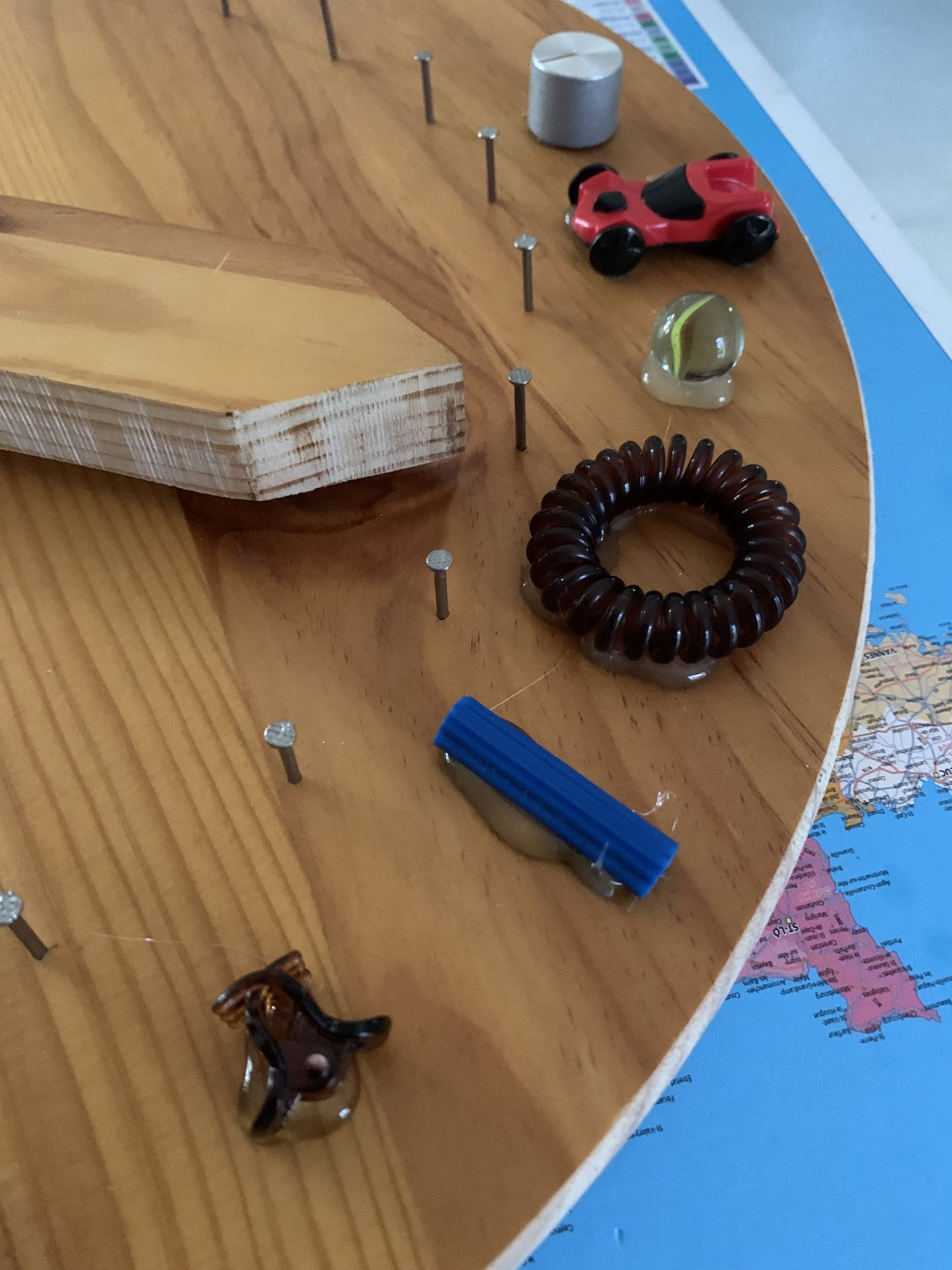 J’ai ensuite tracé les emplacements des objets, j’ai pointé la position et j’ai mis des clous pour arrêter la flêche. J’ai utilisé la hauteur du roulement pour planter les clous à la même hauteur.