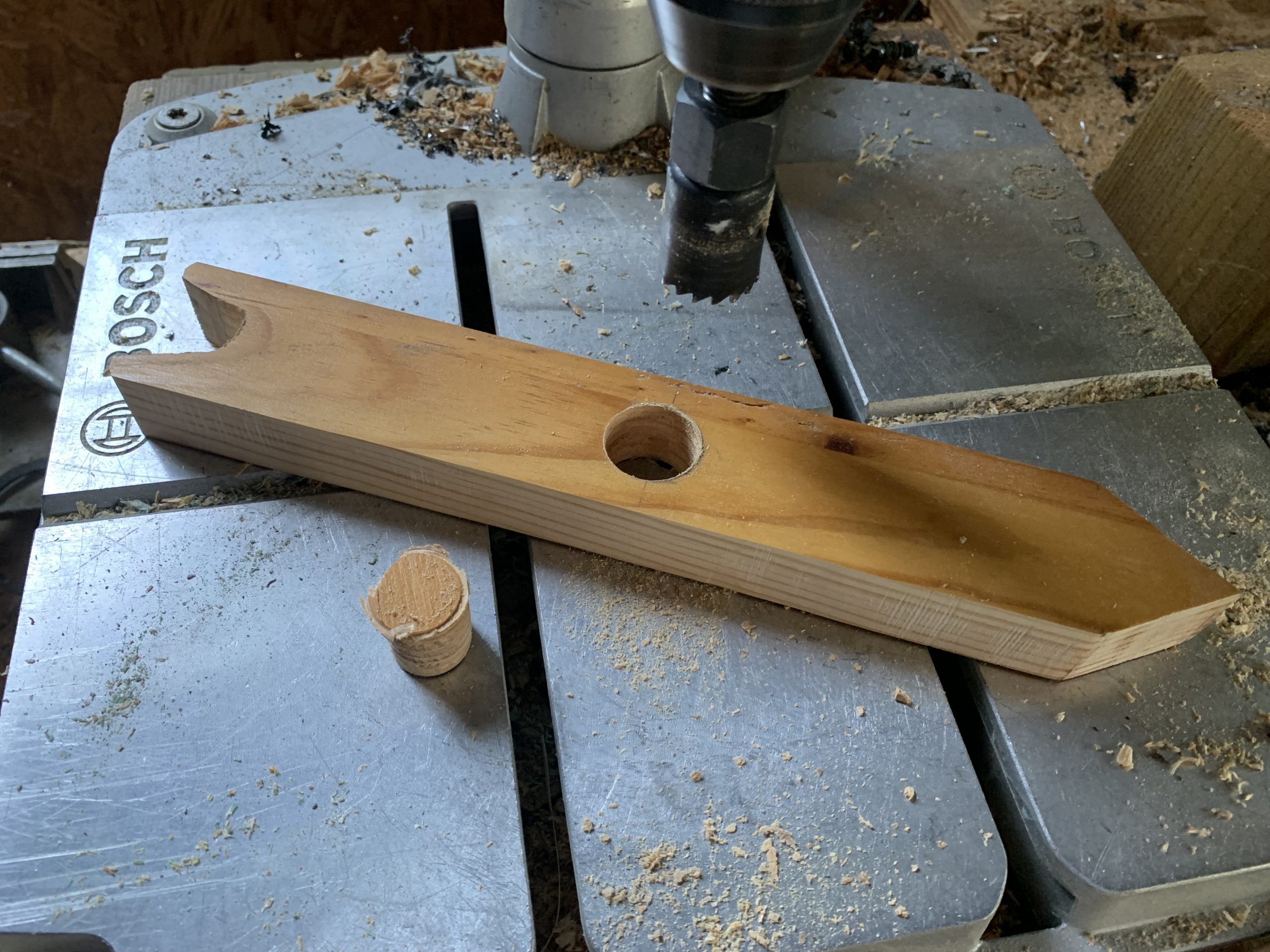 Pour la flèche j’ai utilisé la chute de la planche et je l’ai découpée à la scie à ruban. J’ai ensuite découpé le logement du roulement avec une scie cloche.