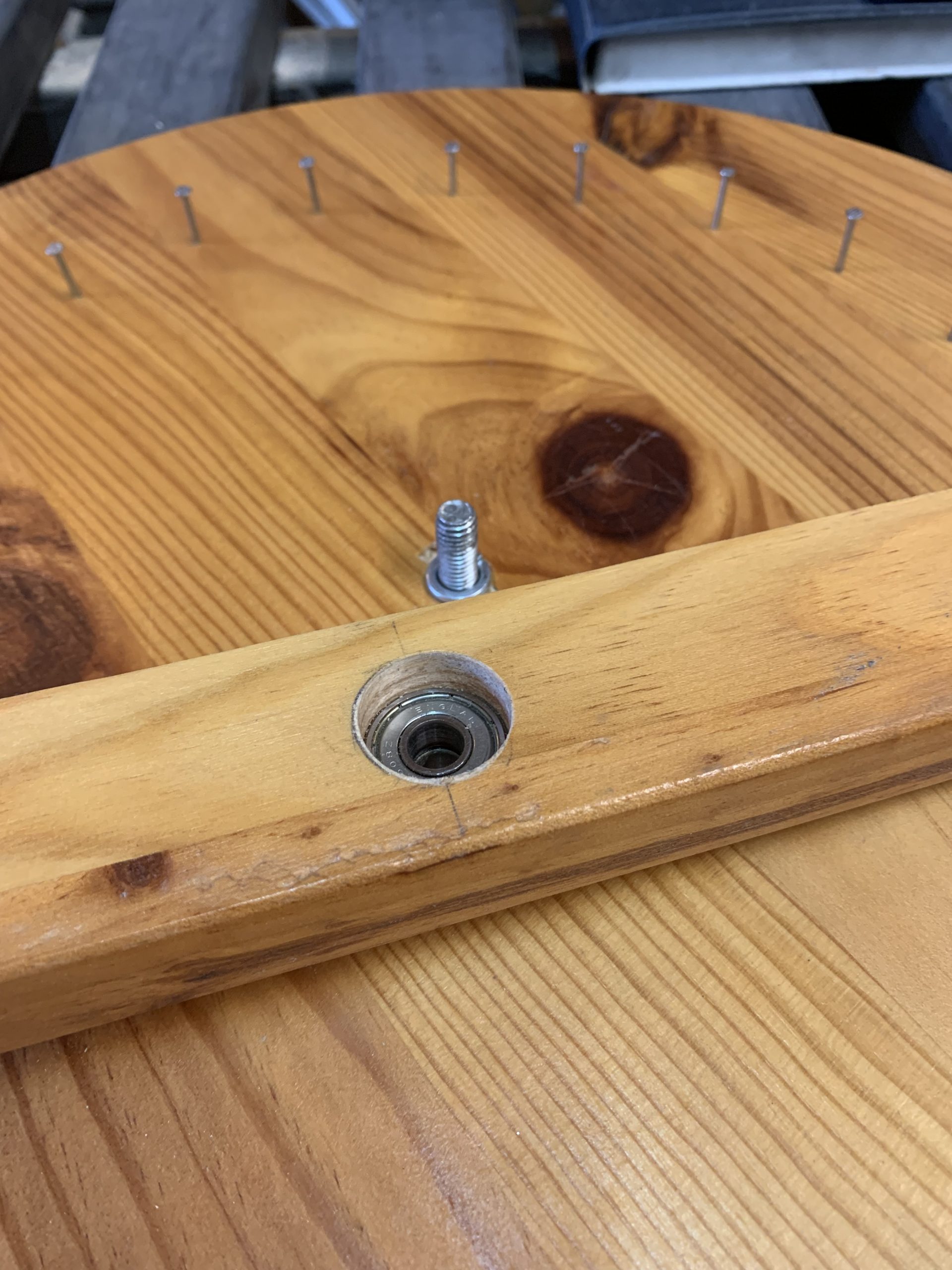 La flèche est vissée sur la planche au travers du roulement. J’ai interposé des rondelles pour permettre à la flèche de tourner sans frotter.