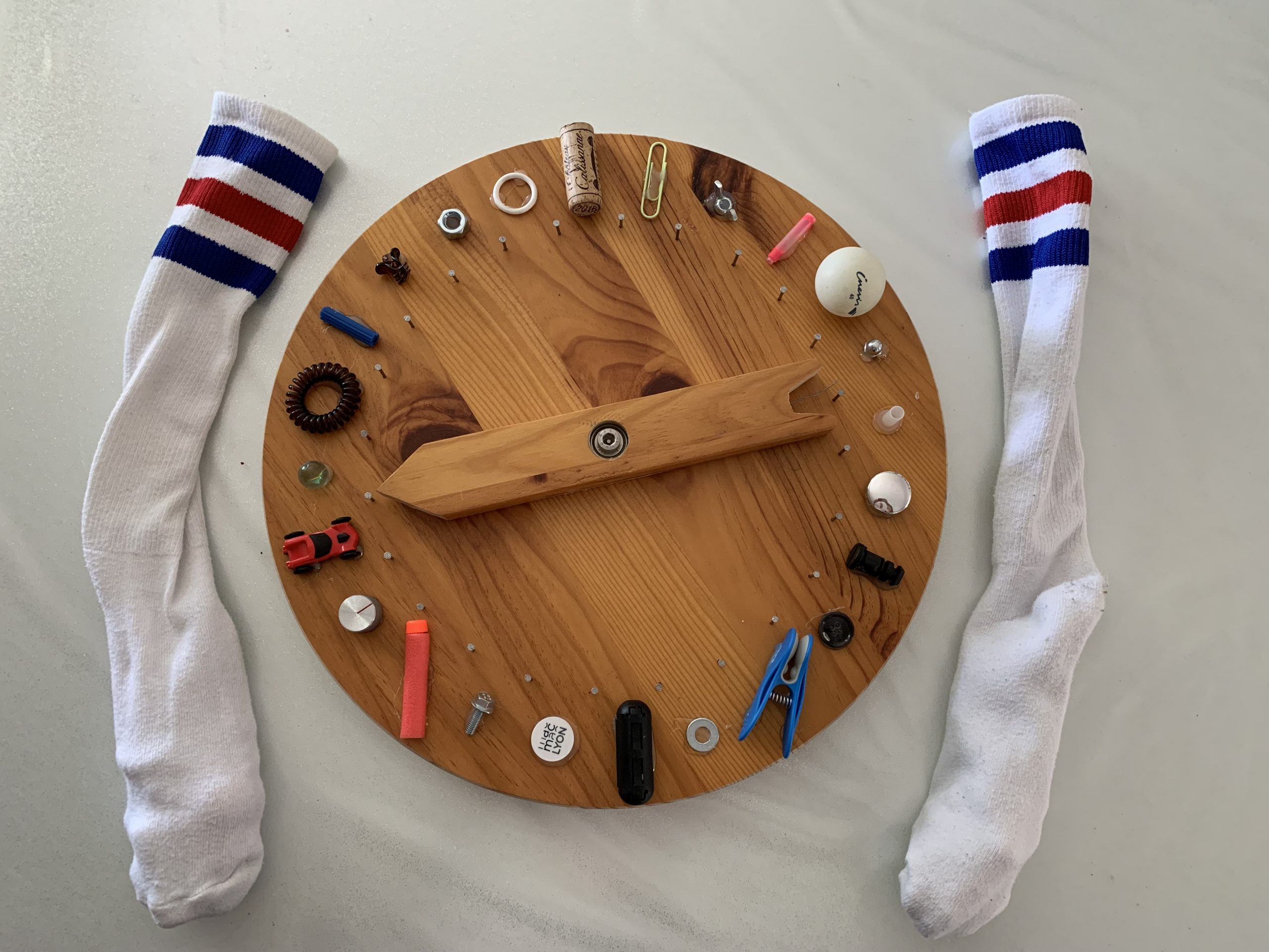 Claude m’a suggéré une idée de jeux pour les petits fils qui se joue à deux. Il s’agit d’un concours de rapidité à trouver un objet parmi beaucoup dans une chaussette, sans le voir, uniquement en le reconnaissant avec les doigts. L’objet est désigné par une roue de loterie.