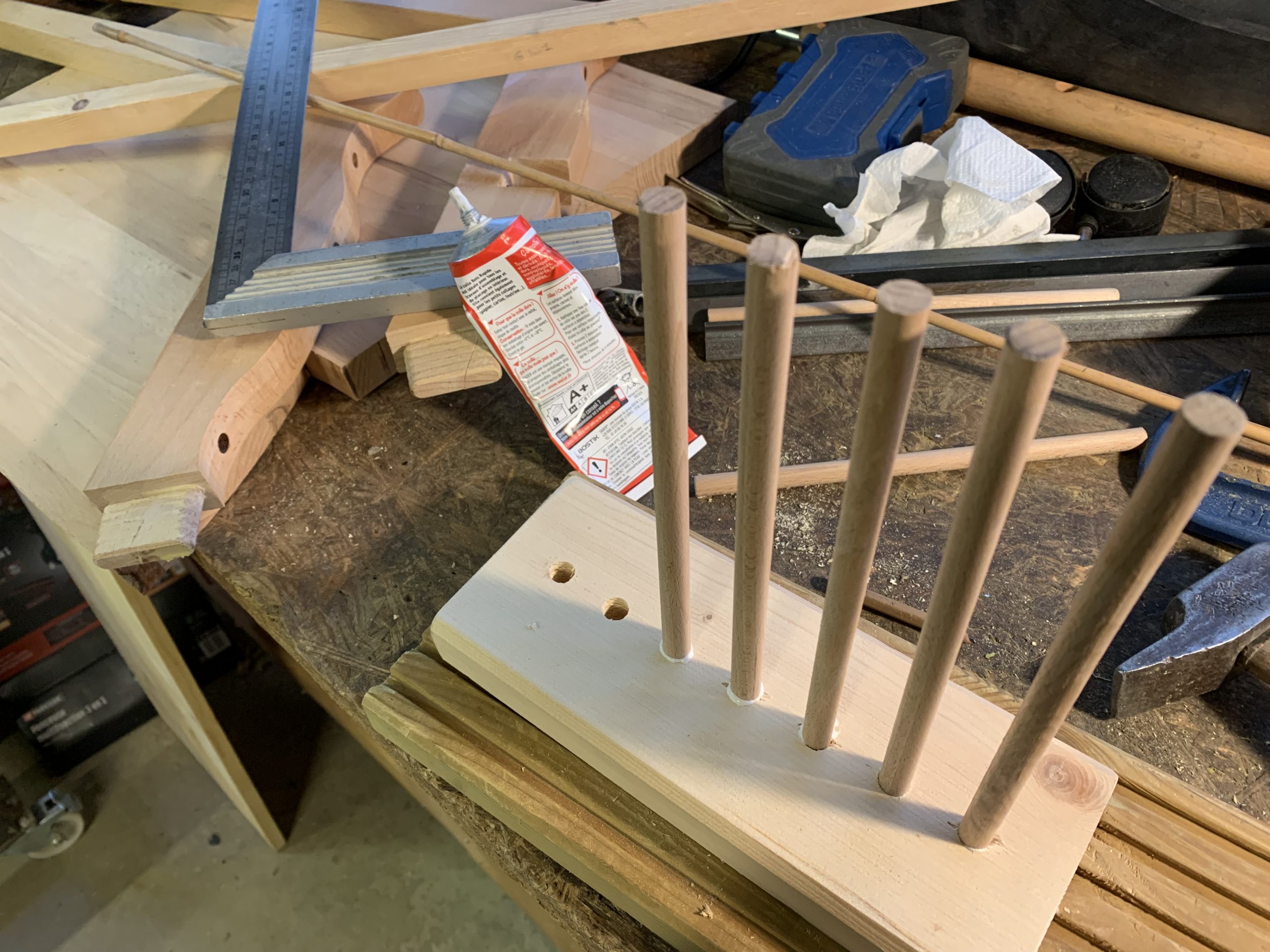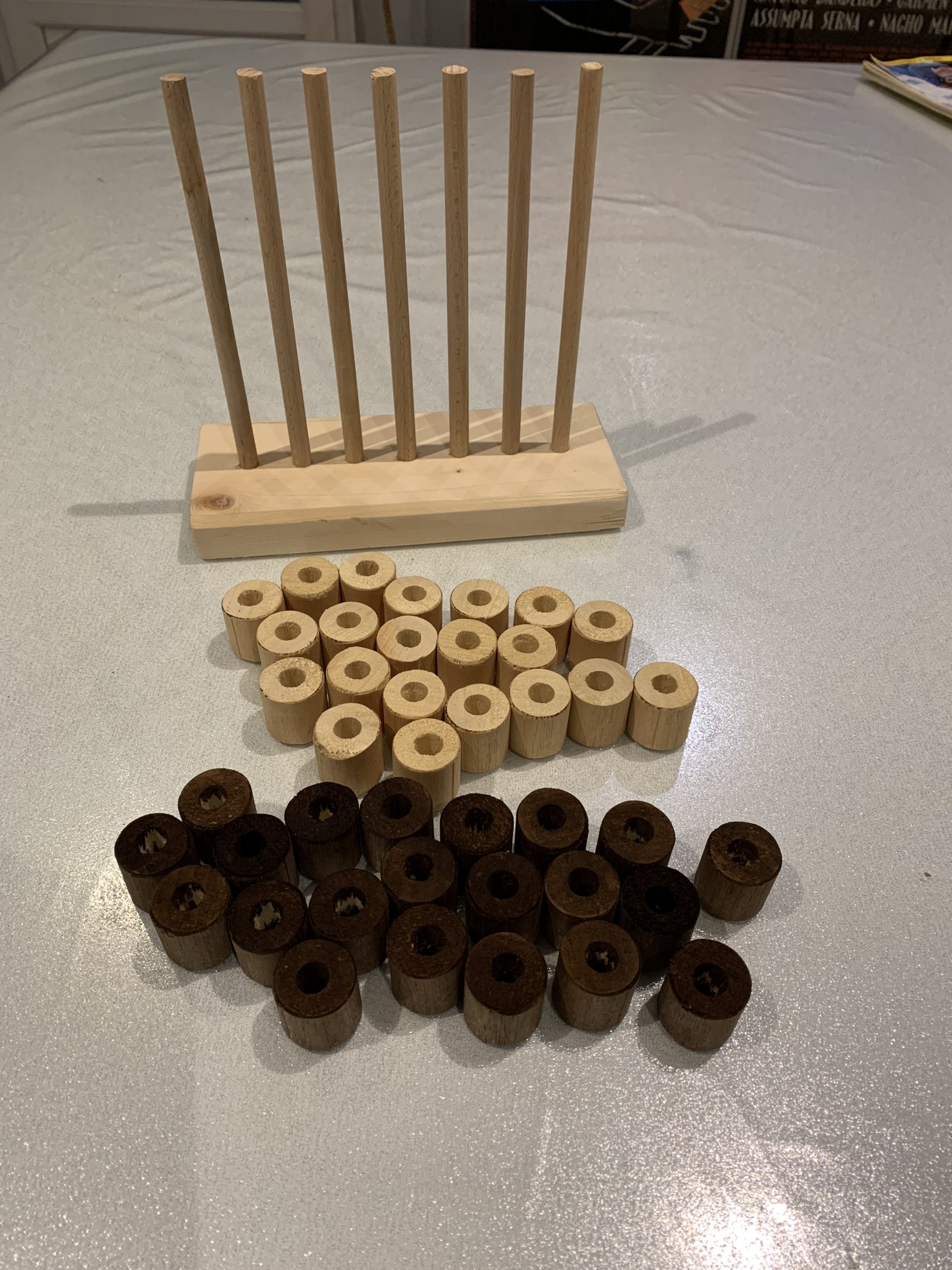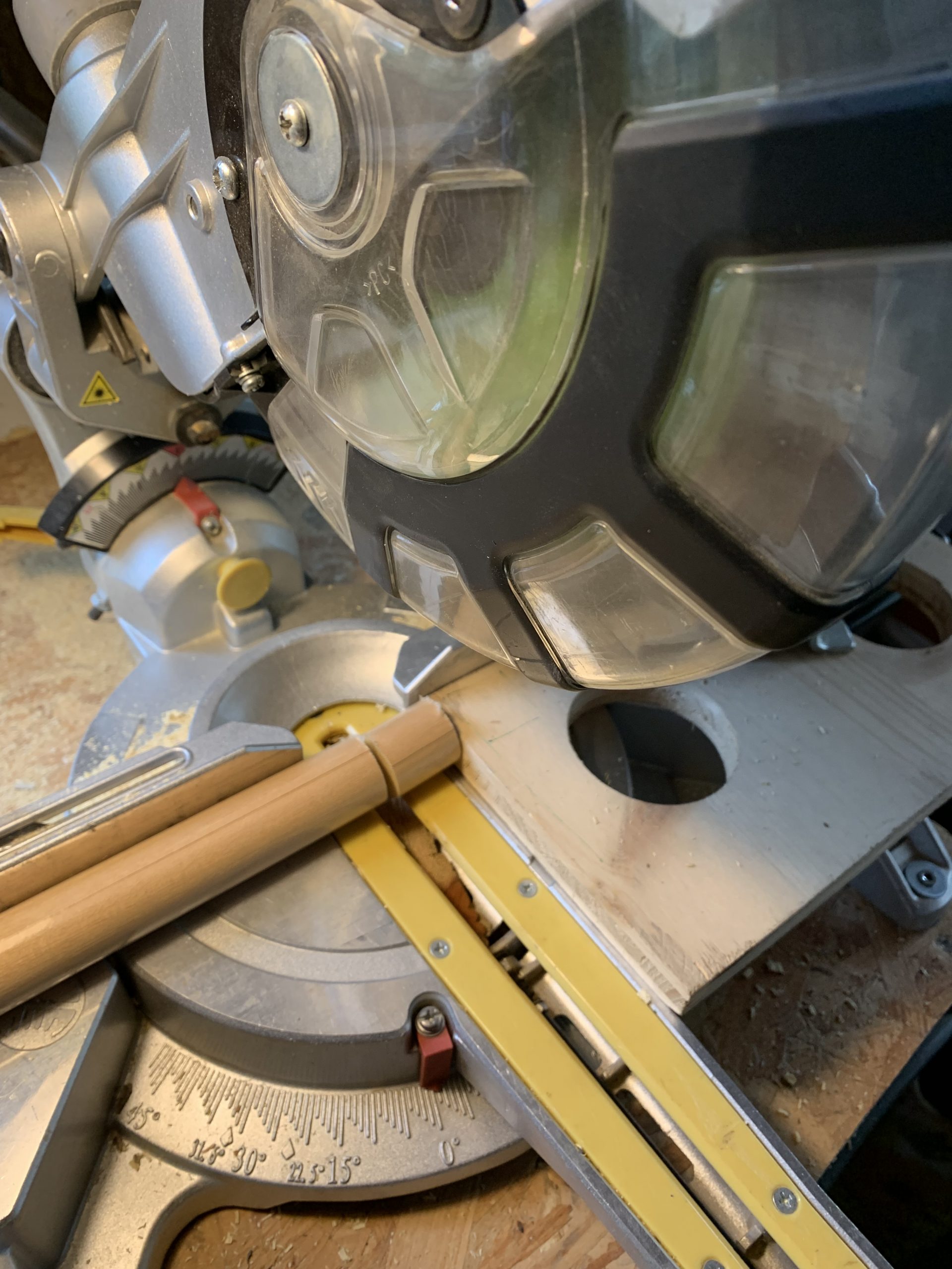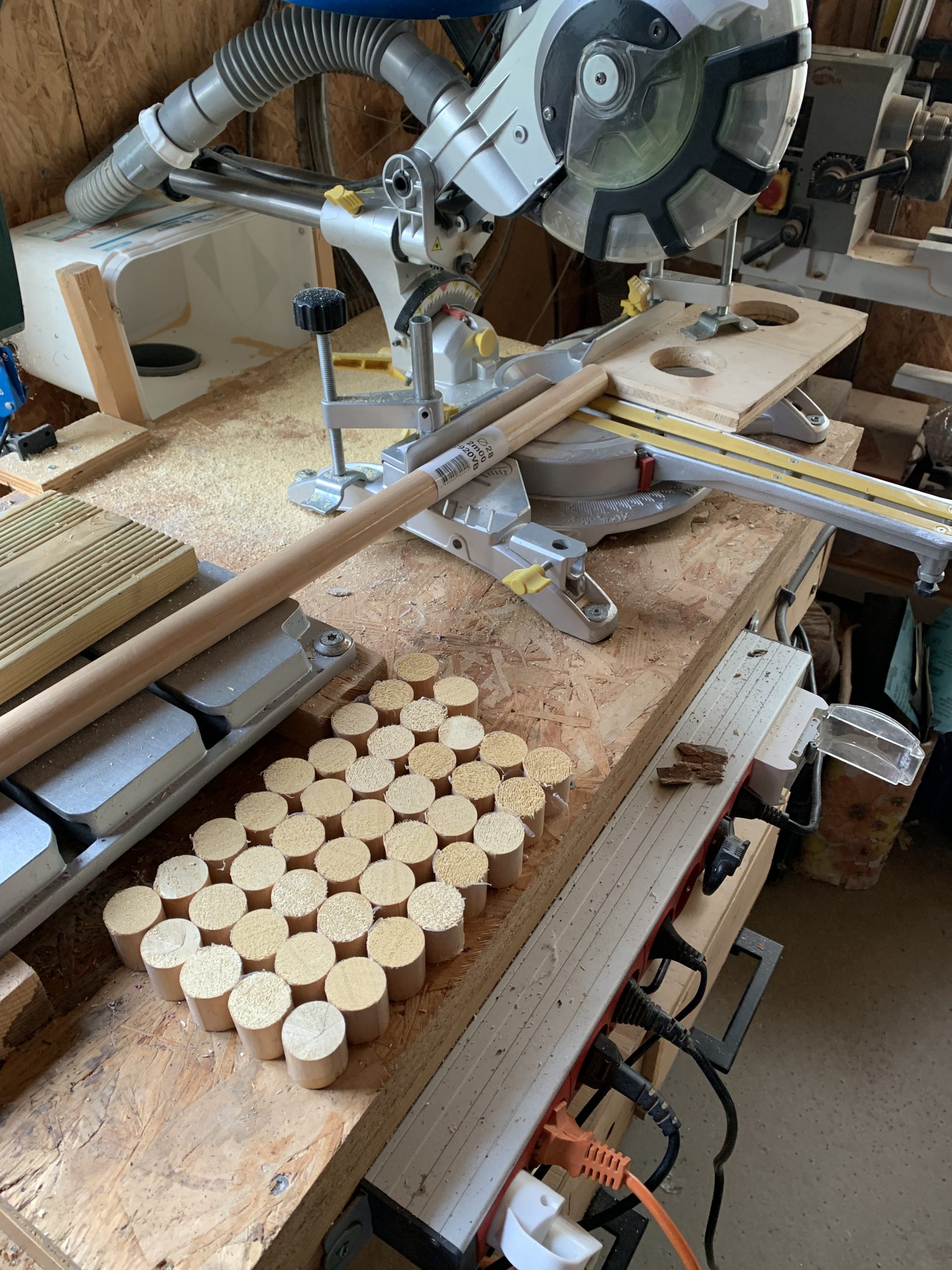 J’ai choisi un bois de tringle à rideaux de diamètre assez important, j’ai tronçonné les pions à la scie à onglets avec une butée pour les faire tous de la même taille, il en faut 7*6=42.