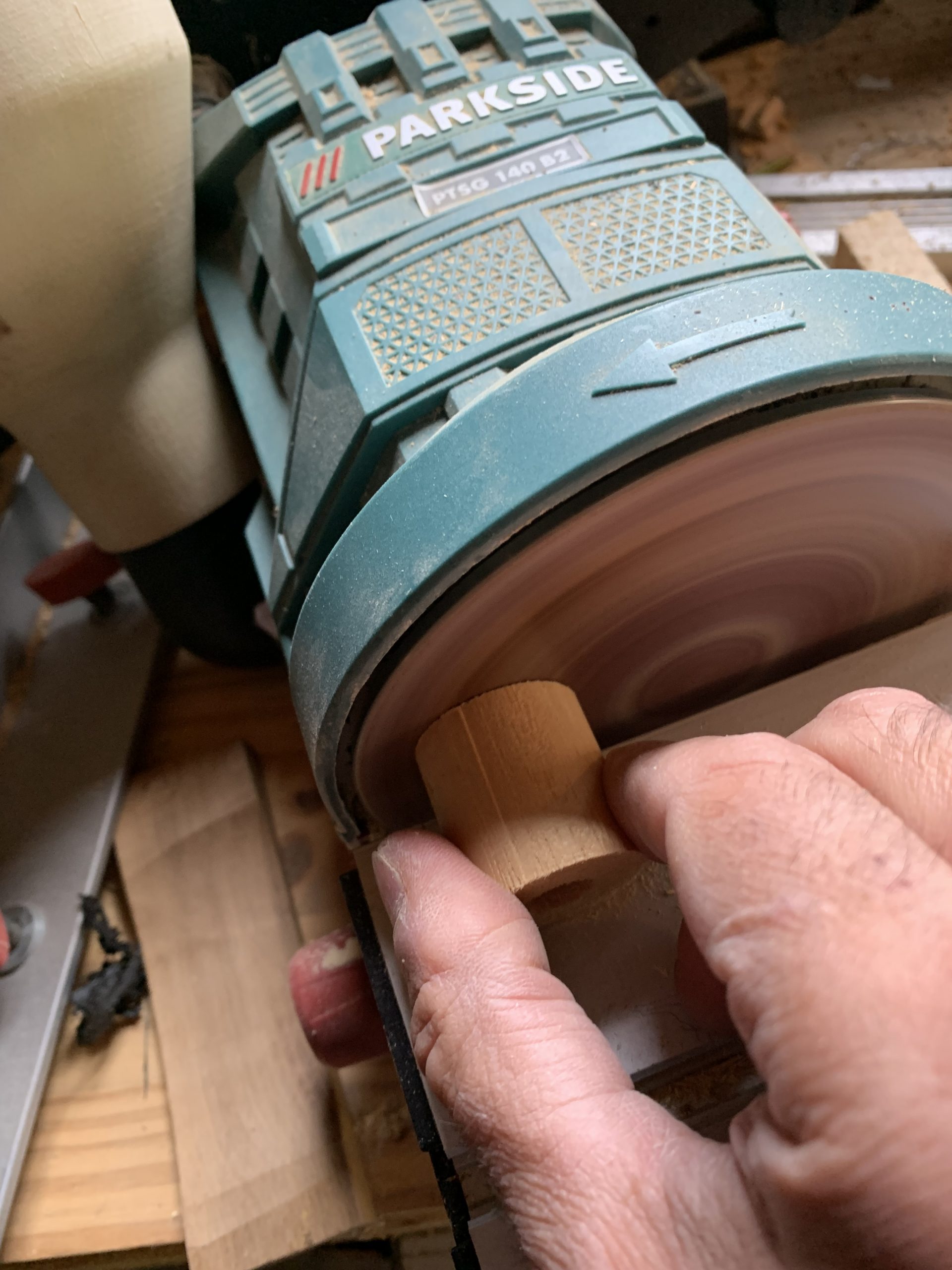 J’ai donc cherché ce qui pouvait correspondre dans mon atelier et j’ai utilisé des cylindres coupés dans une tringle à rideaux en bois.