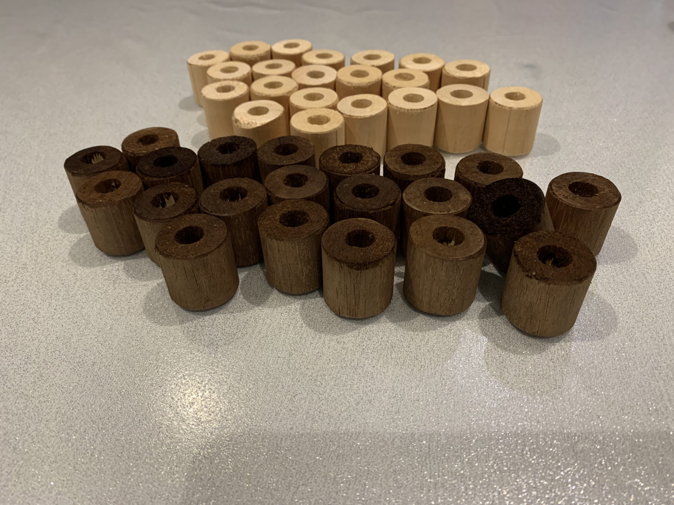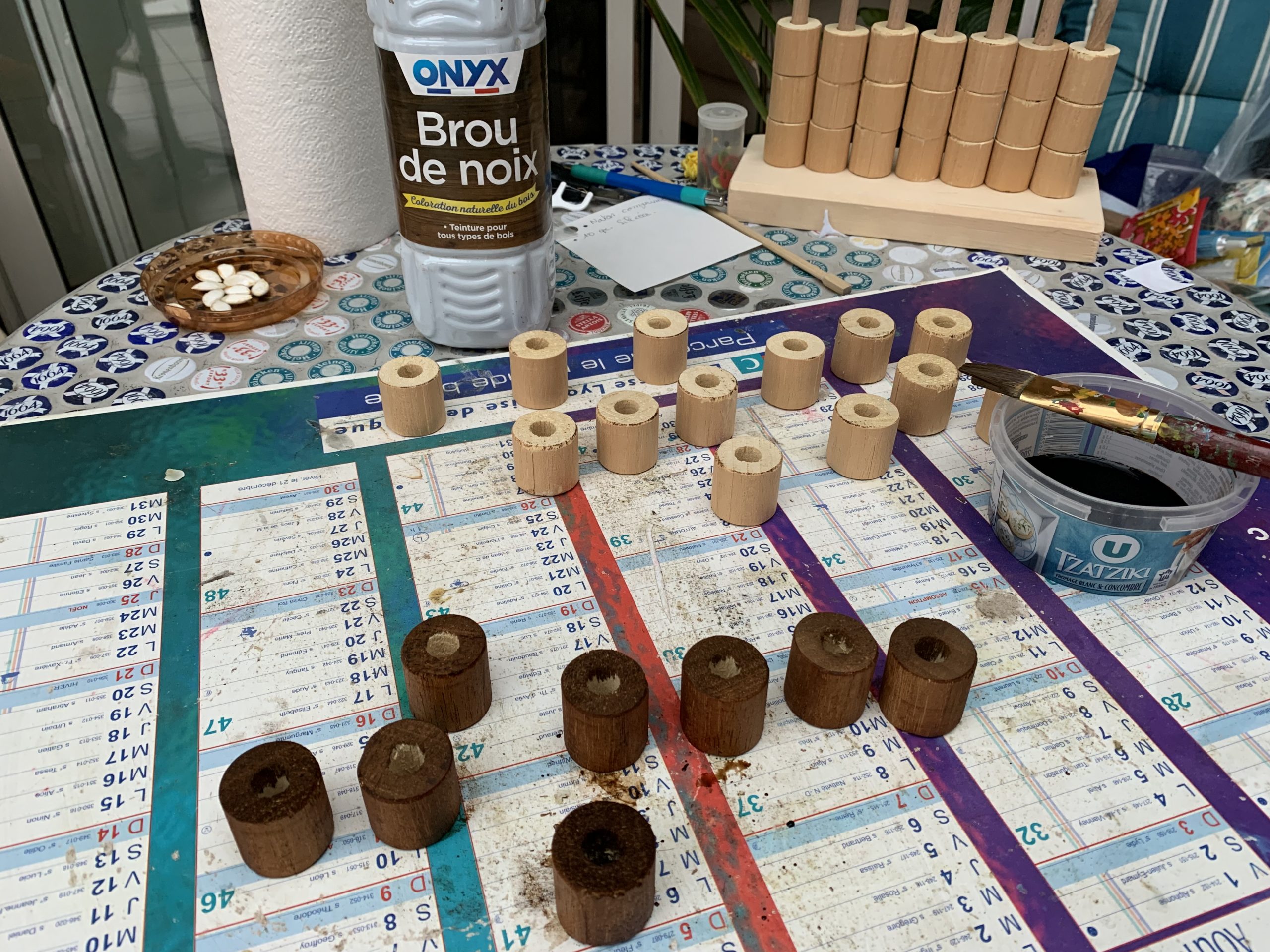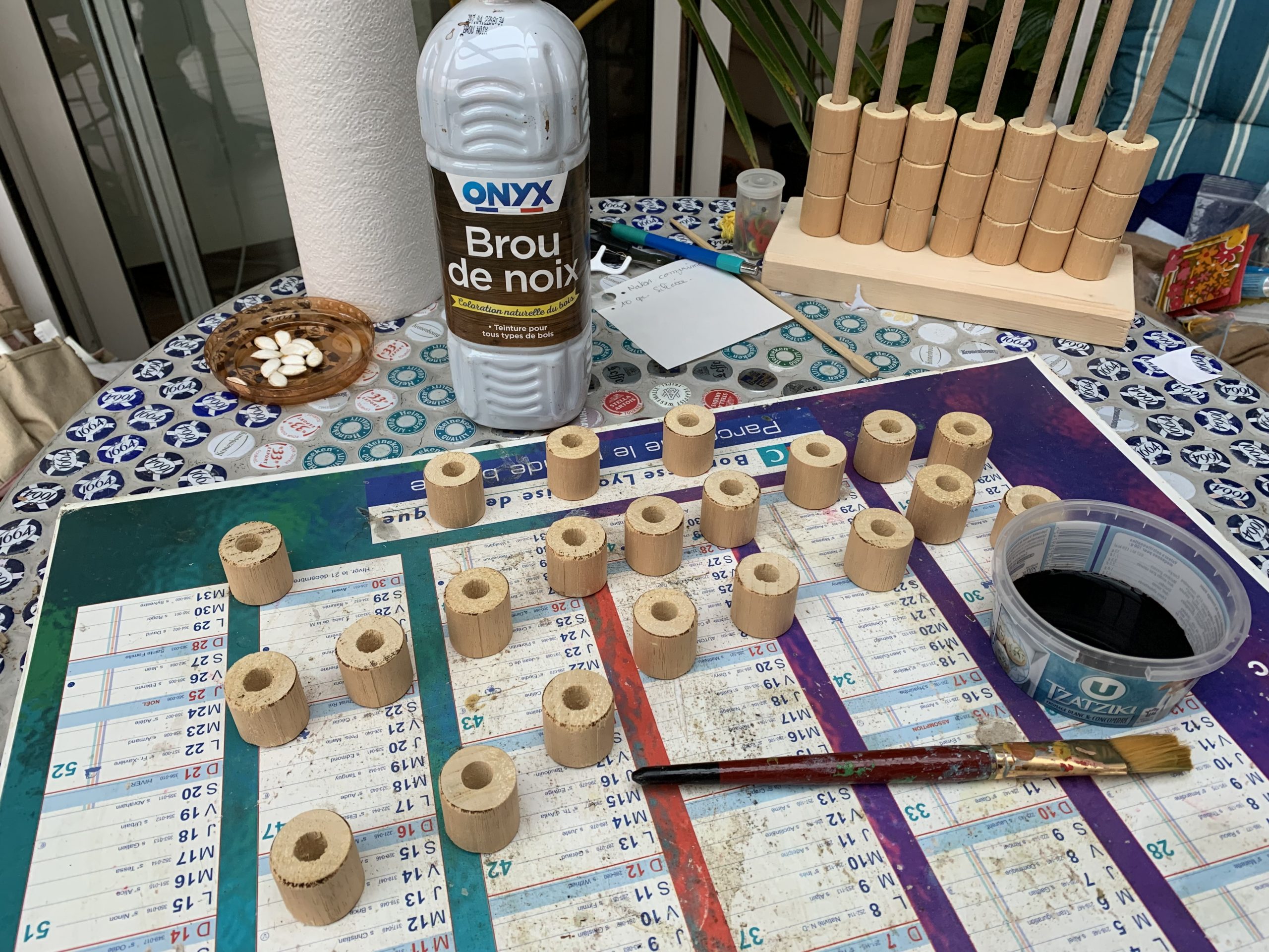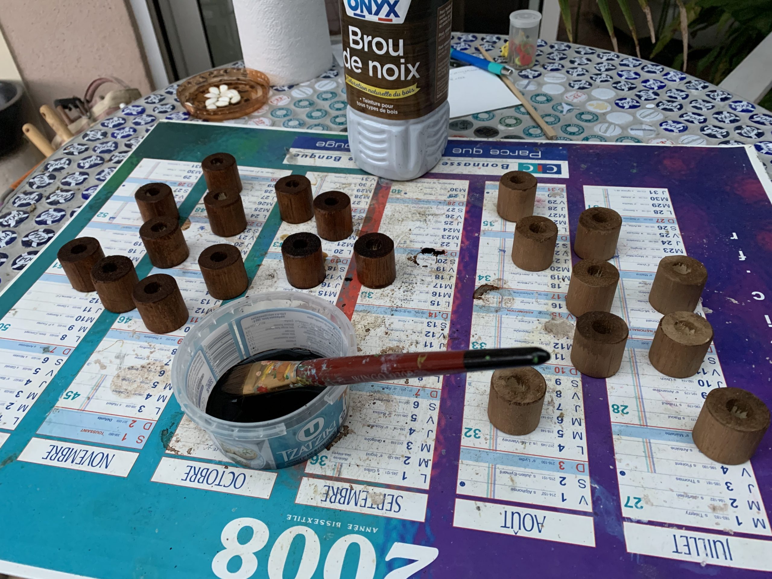 Il faut 2 teintes de pions. Je les ai teintés avec du brou de noix. C’est naturel et facile à utiliser. J’ai mis plusieurs teintes pour arriver à une teinte assez foncée.