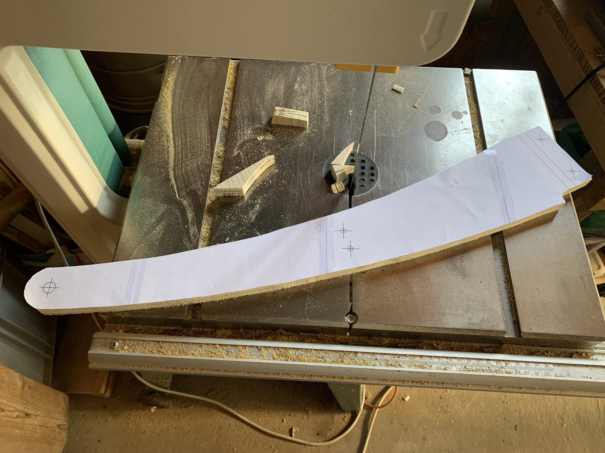 Pour la fabrication, j’ai suivi les conseils du blog Bonsangdebois et j’ai imprimé les patrons, que j’ai collés sur du contreplaqué de 15 mm d’épaisseur, et découpés à la scie à ruban.