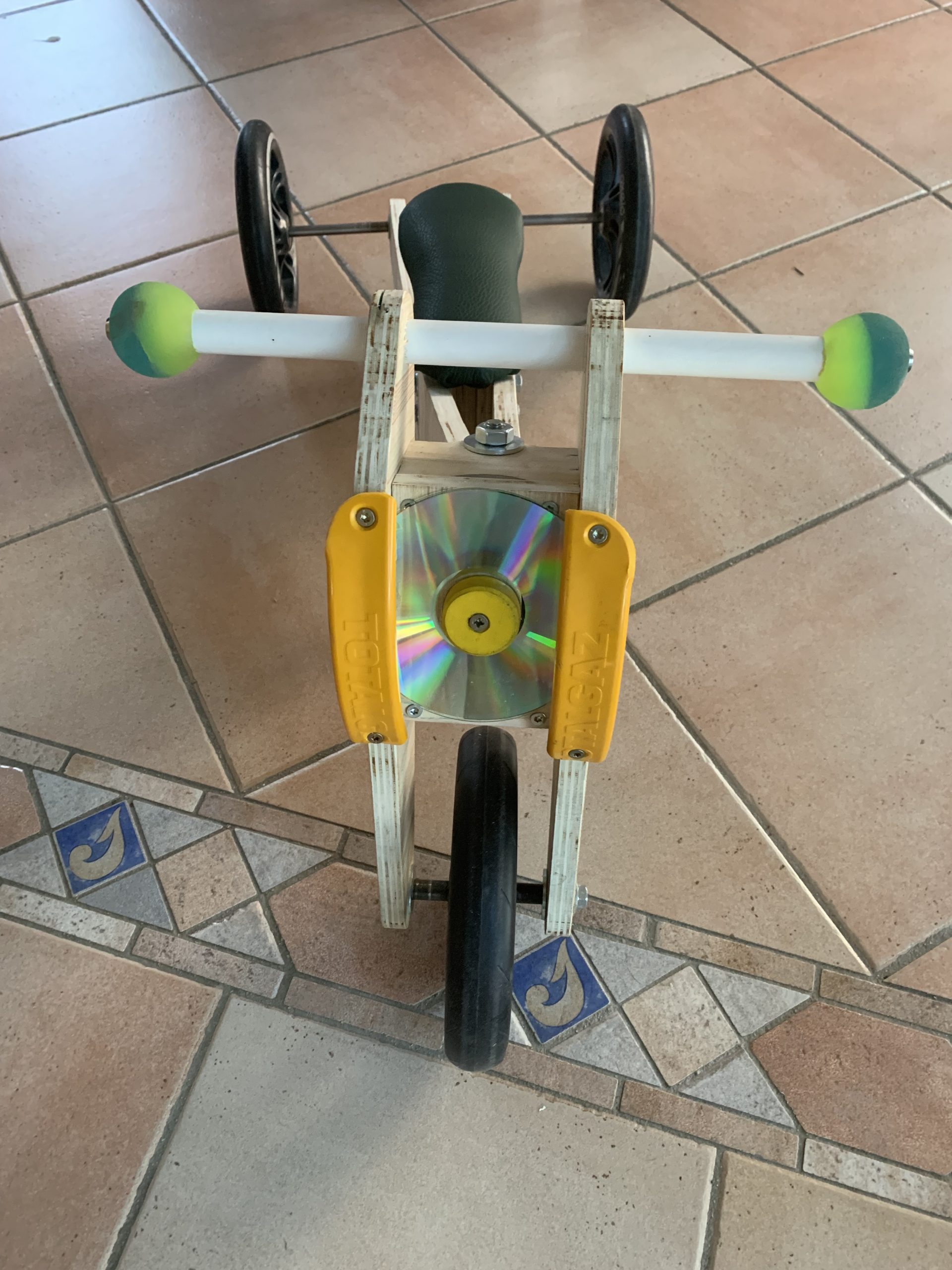 Un CD pour le phare, des balles rebondissantes pour le guidon, et des morceaux de poignée de bouteille de gaz de Total pour les parechocs.