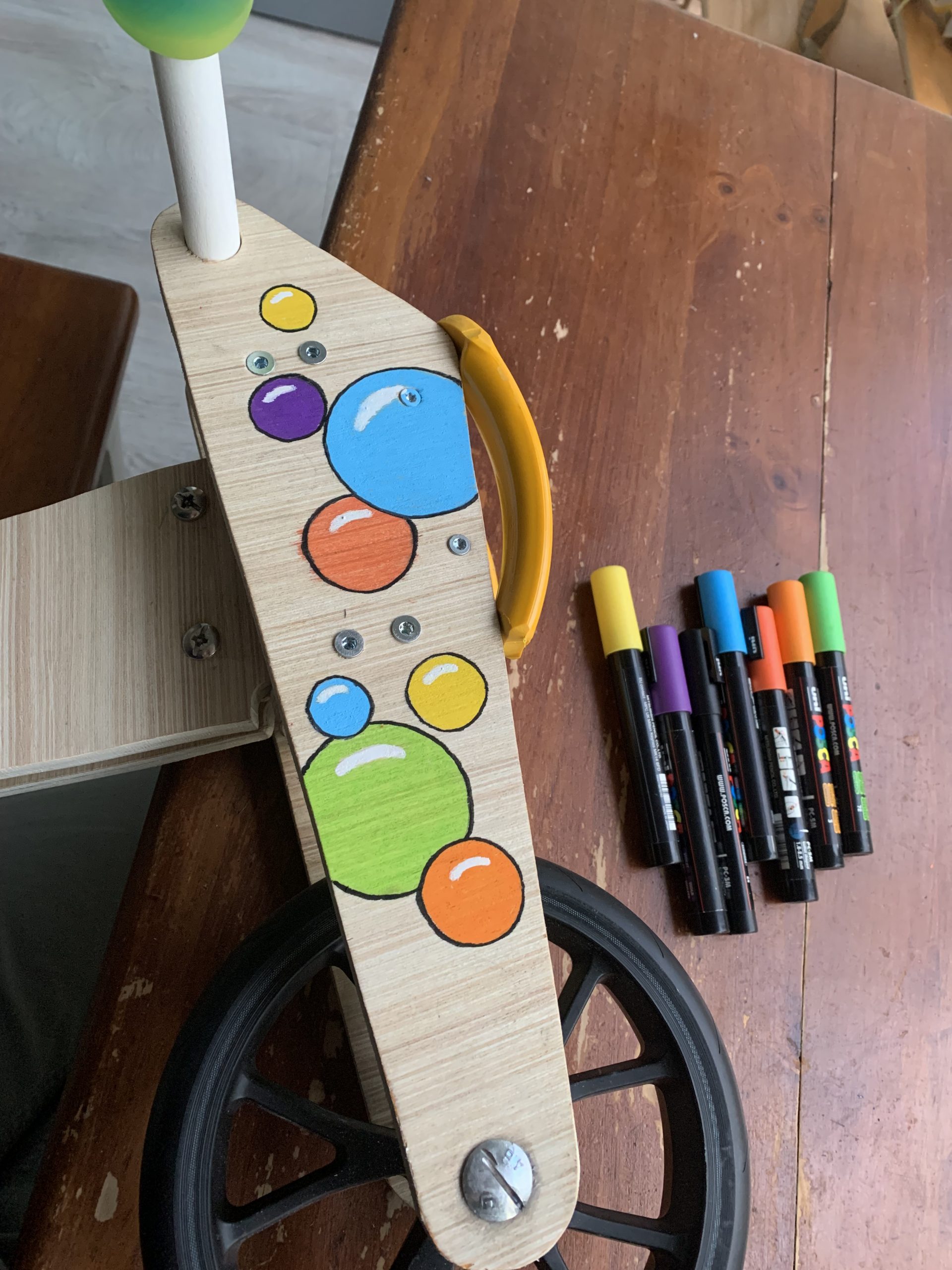 J’ai récupéré 2 roues de la première que j’avais faite, mais pas moyen de trouver la 3 eme roue, j’ai donc dû en racheter une à Deca..on, ce sont des roues de trottinette de 20 cm de diamètre, elles ont des roulements et elles roulent très bien.