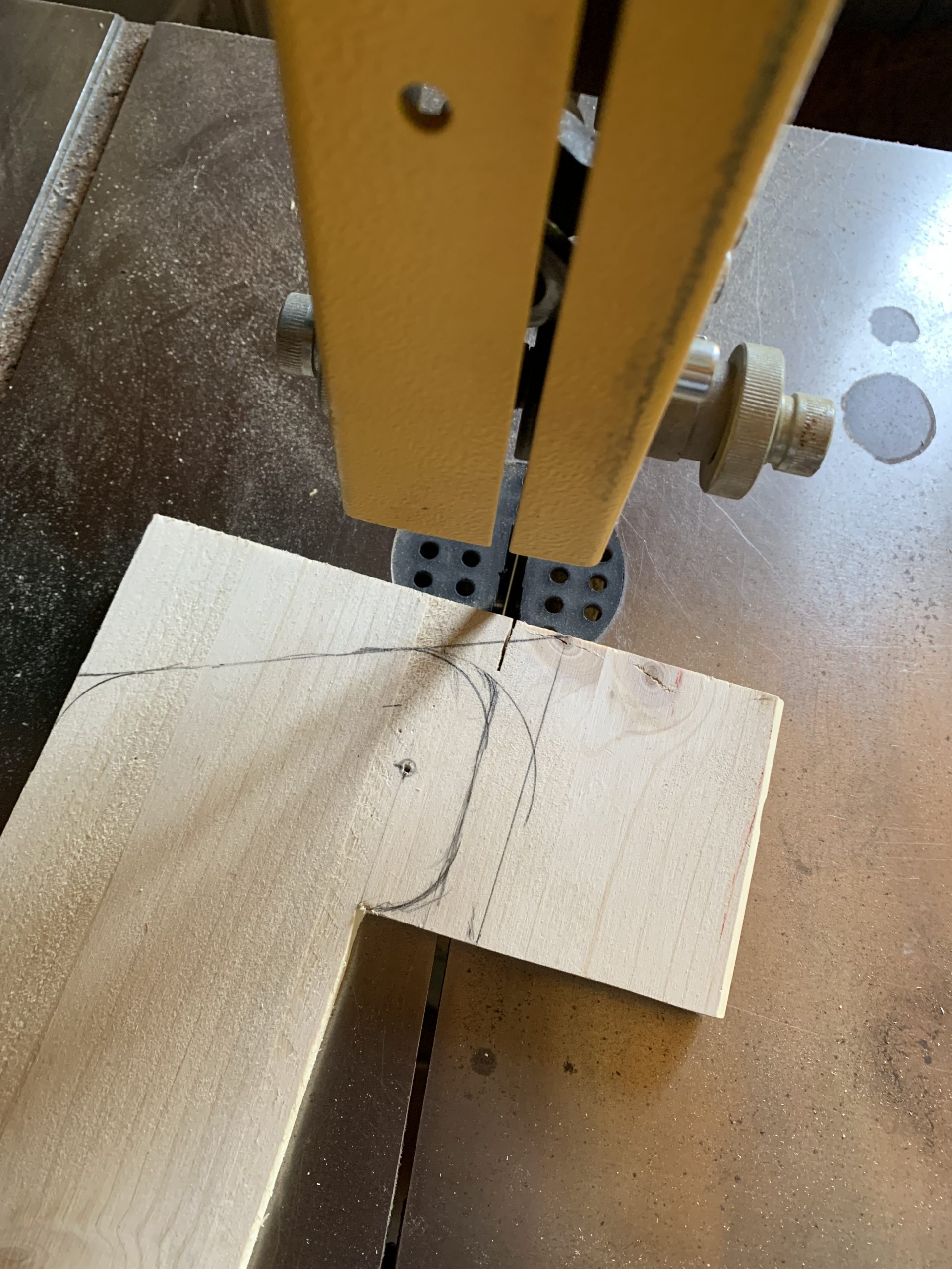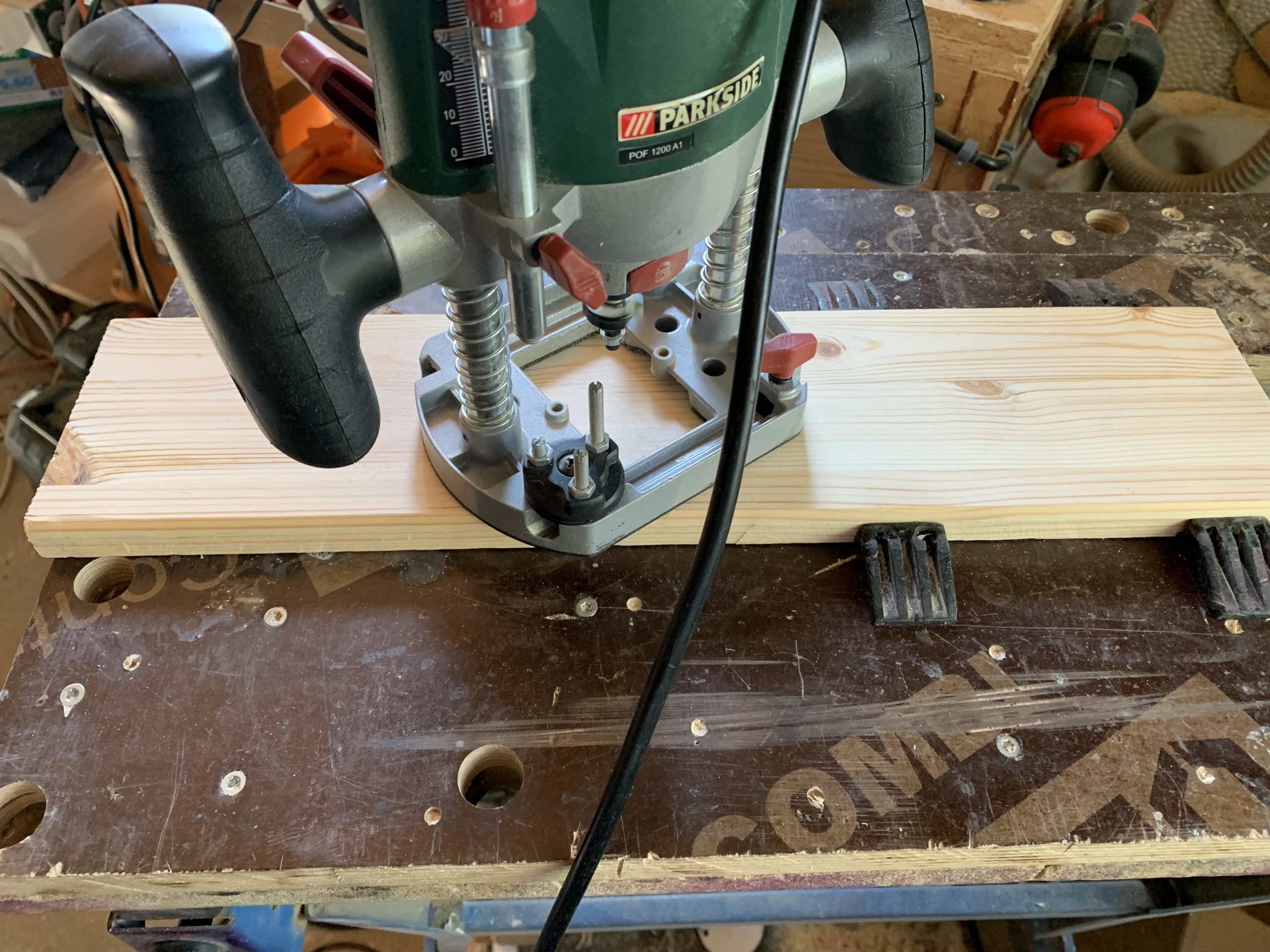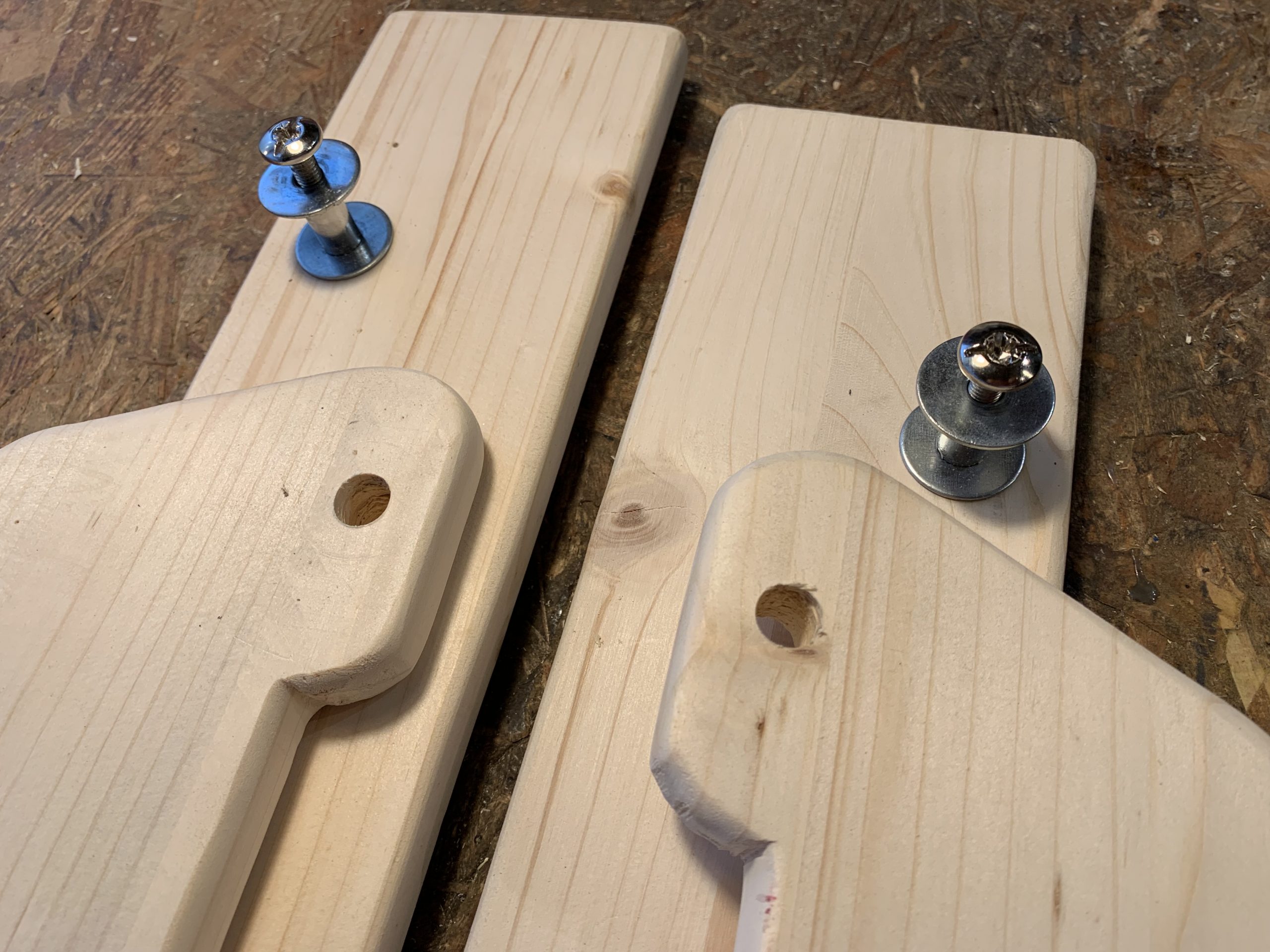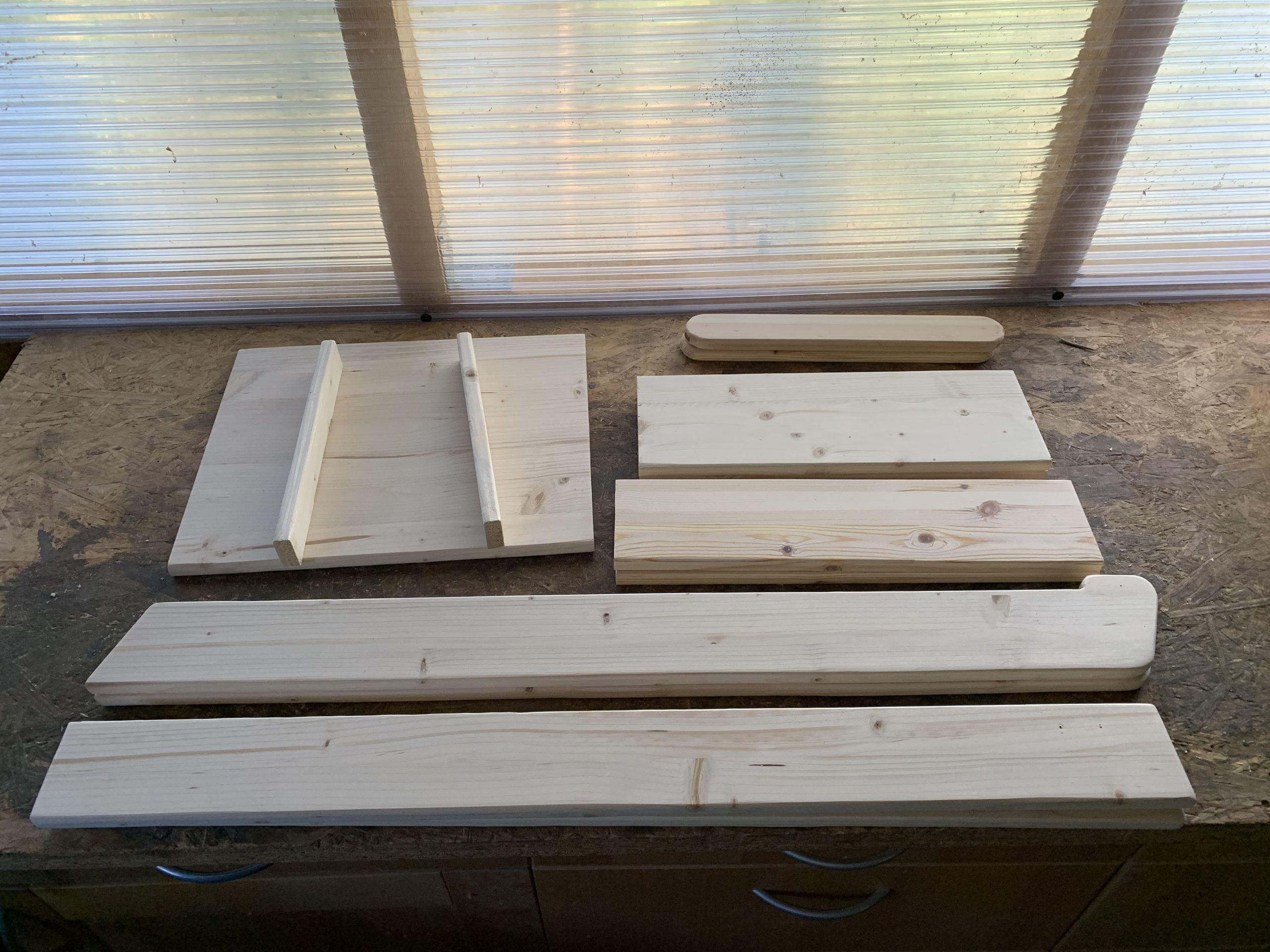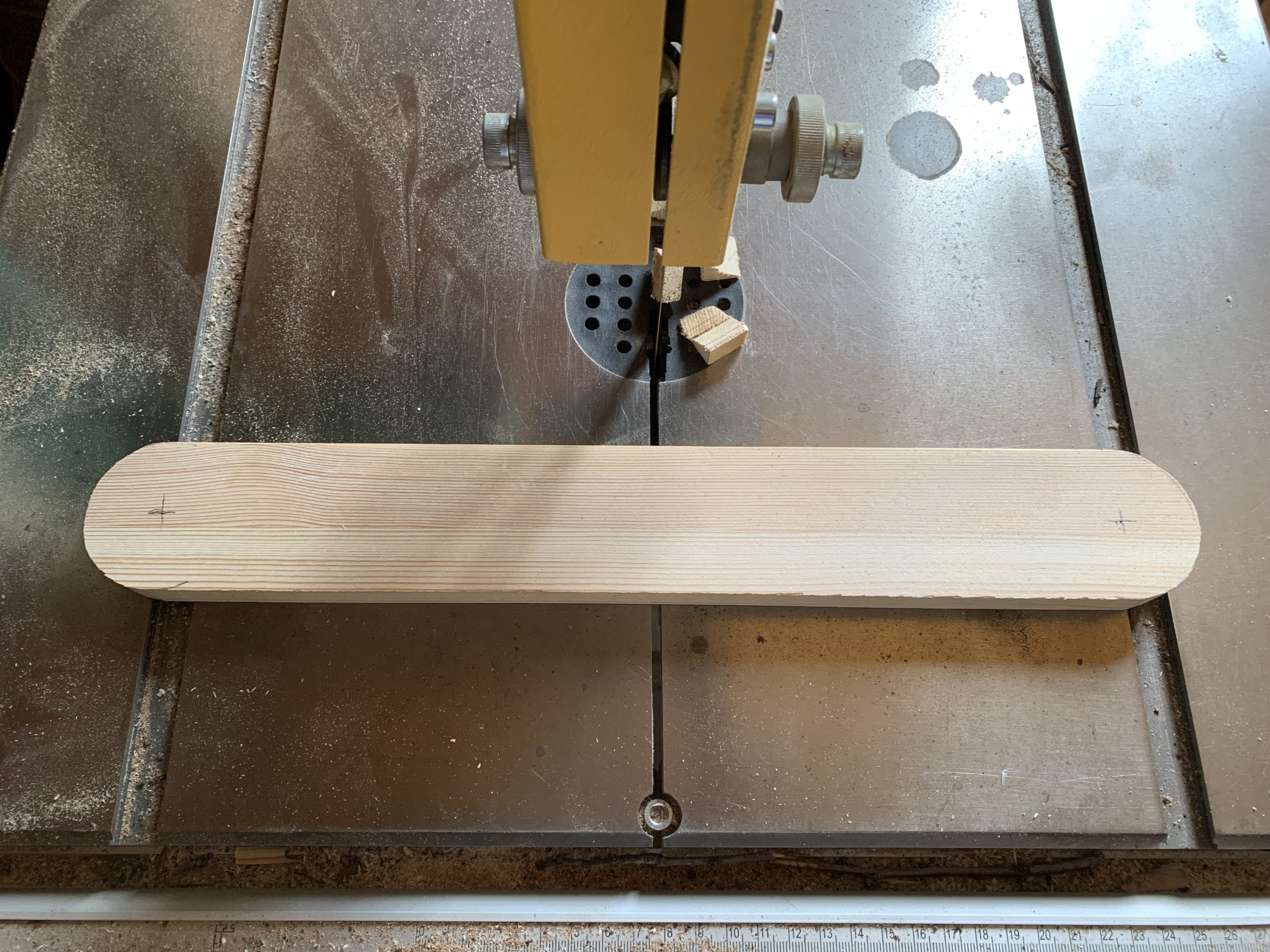 J’ai découpé les différentes pièces à la scie à ruban et j’ai arrondi les arêtes à la défonceuse pour que ce ne soit pas agressif. Puis un bon ponçage. Tout ça avec mes outils Park…de