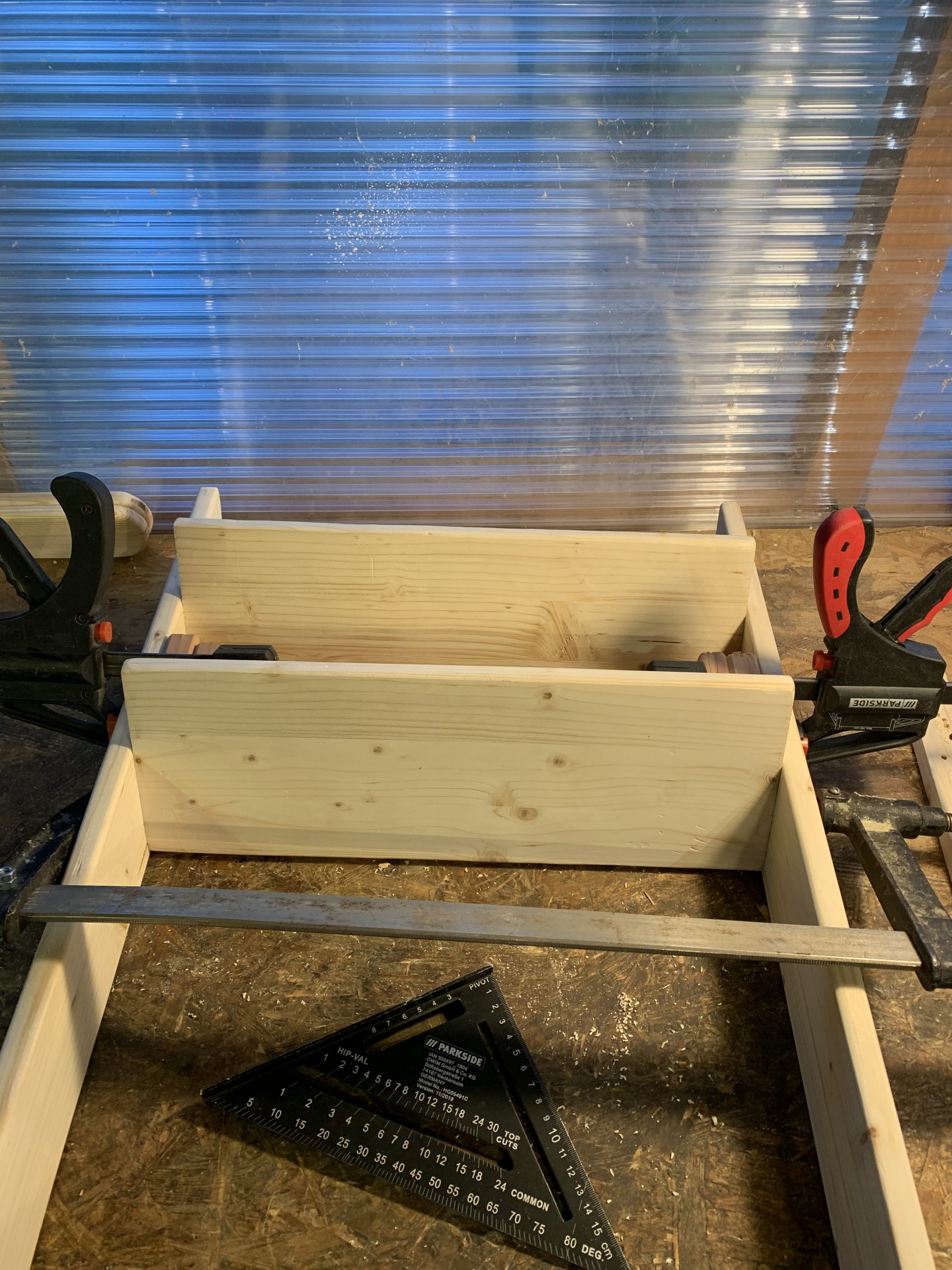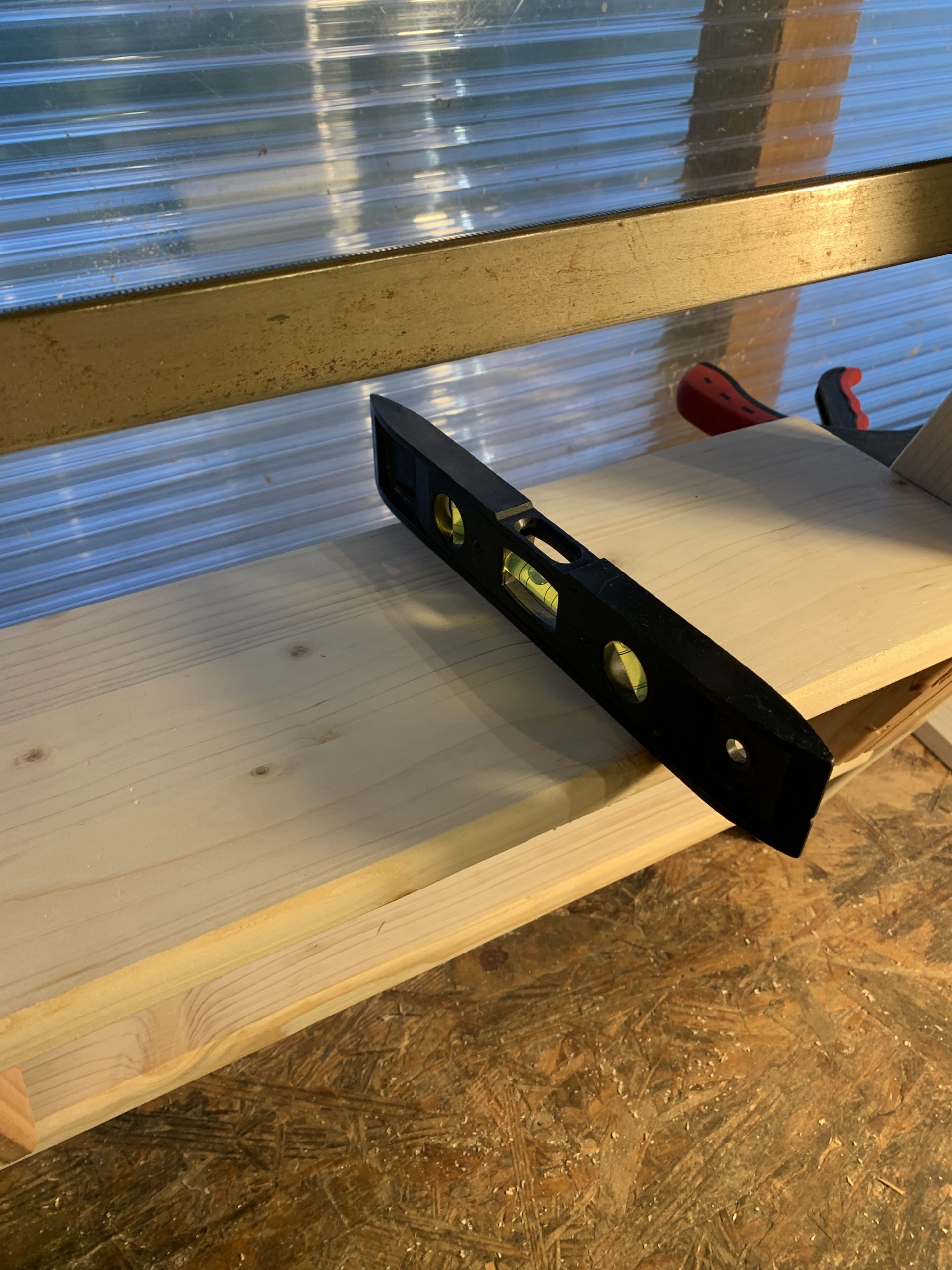L’assemblage n’est pas évident à cause de l’angle des marches. J’ai fait des cales et utilisé des serre joints, et mesuré et controlé de multiples fois…