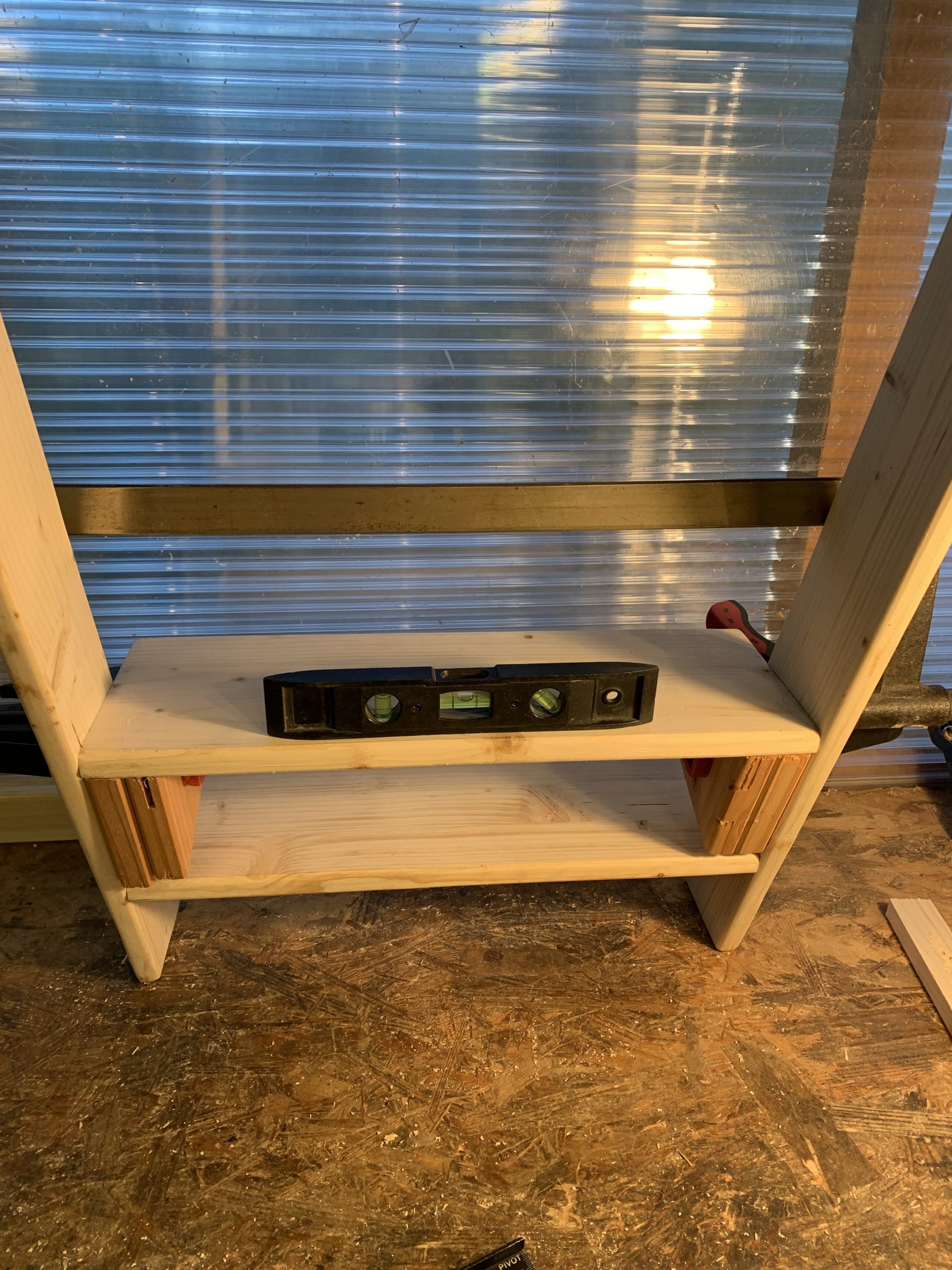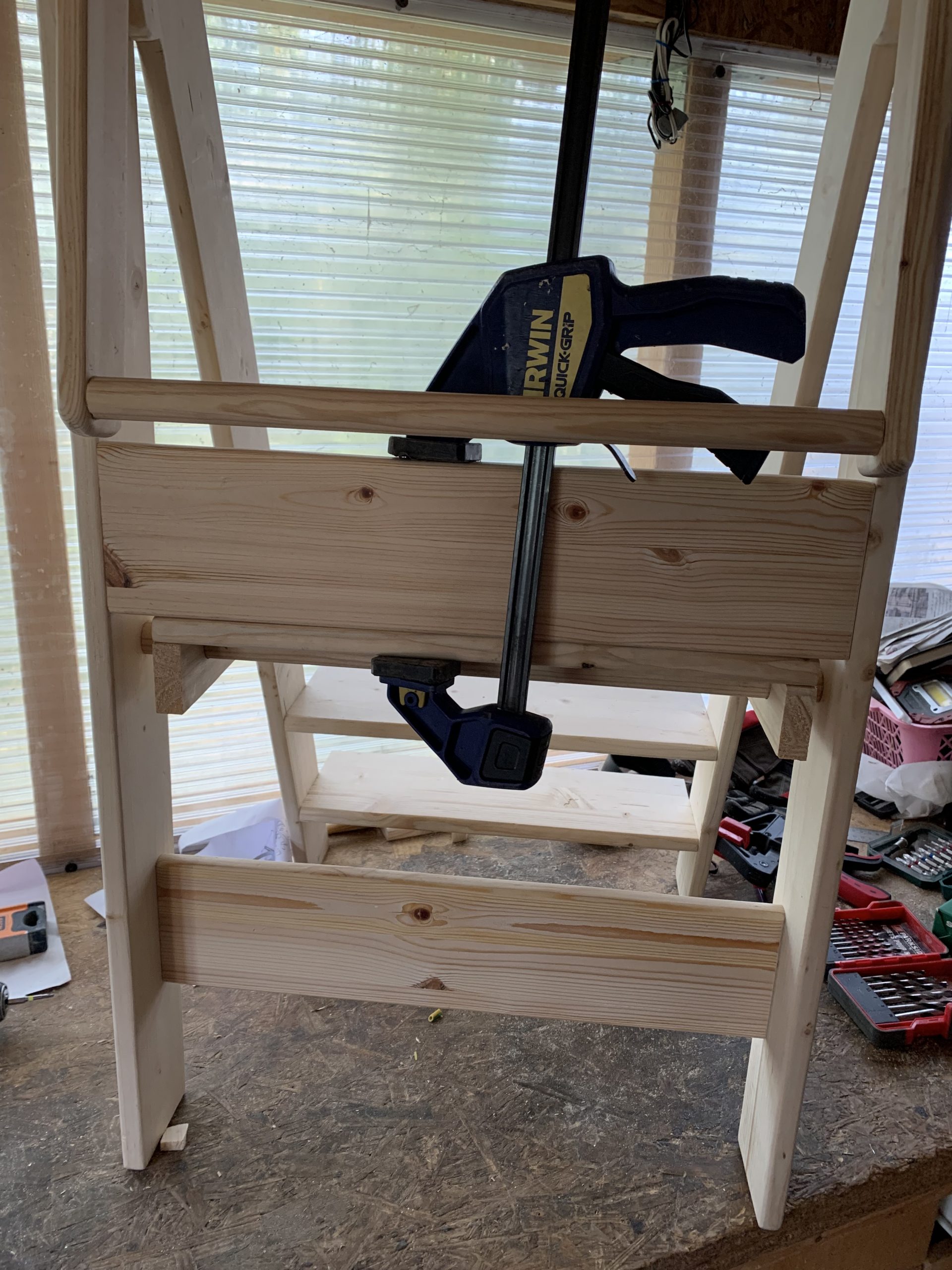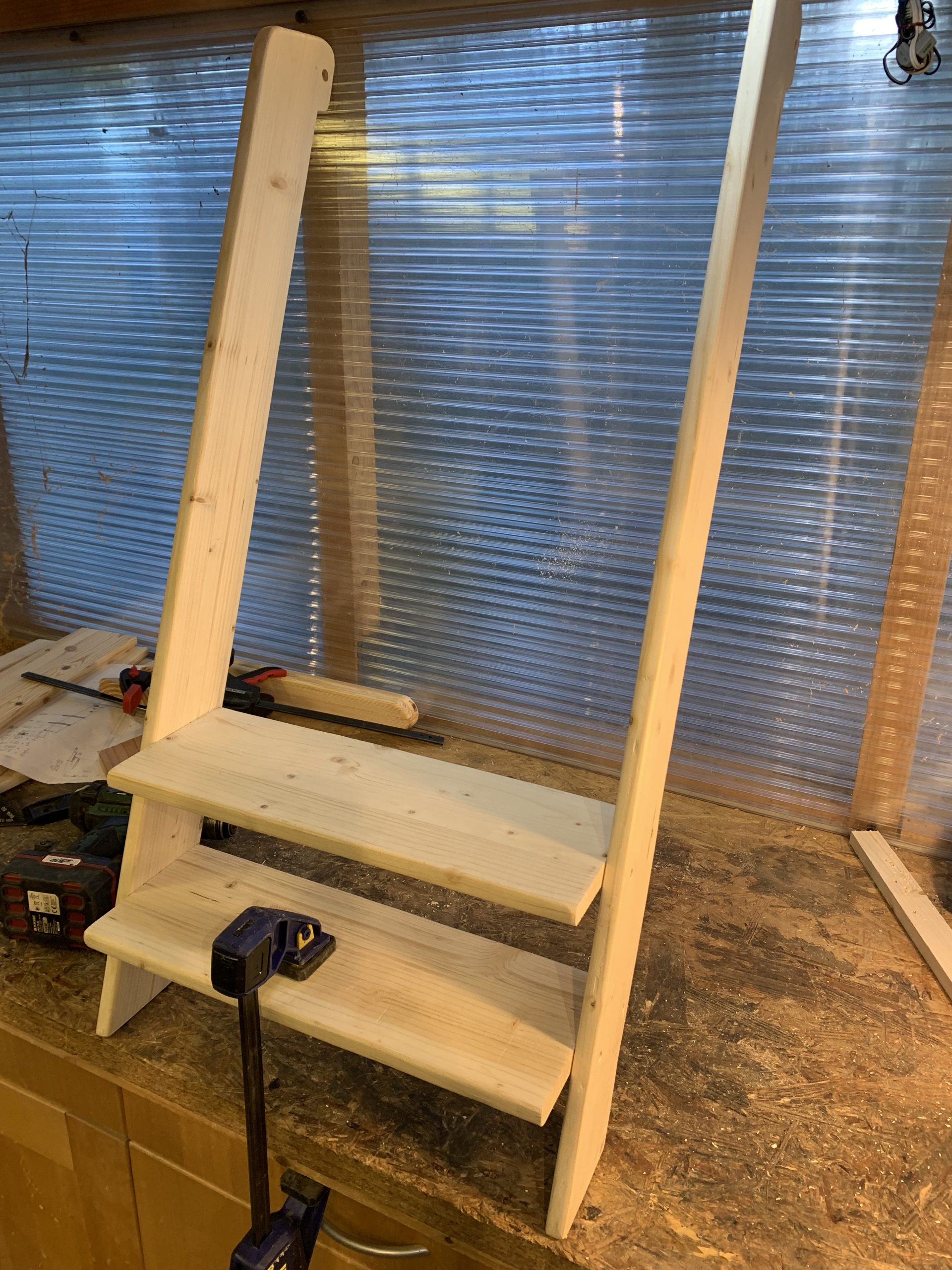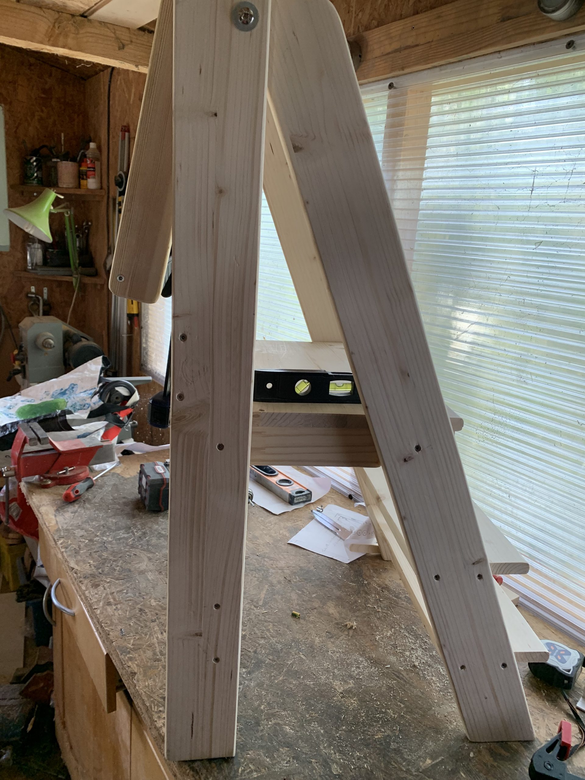 il ne reste plus qu’à assembler toutes les pièces. Une piece verticale fait butée pour la plateforme, securise et aussi rigidifie l’échelle.