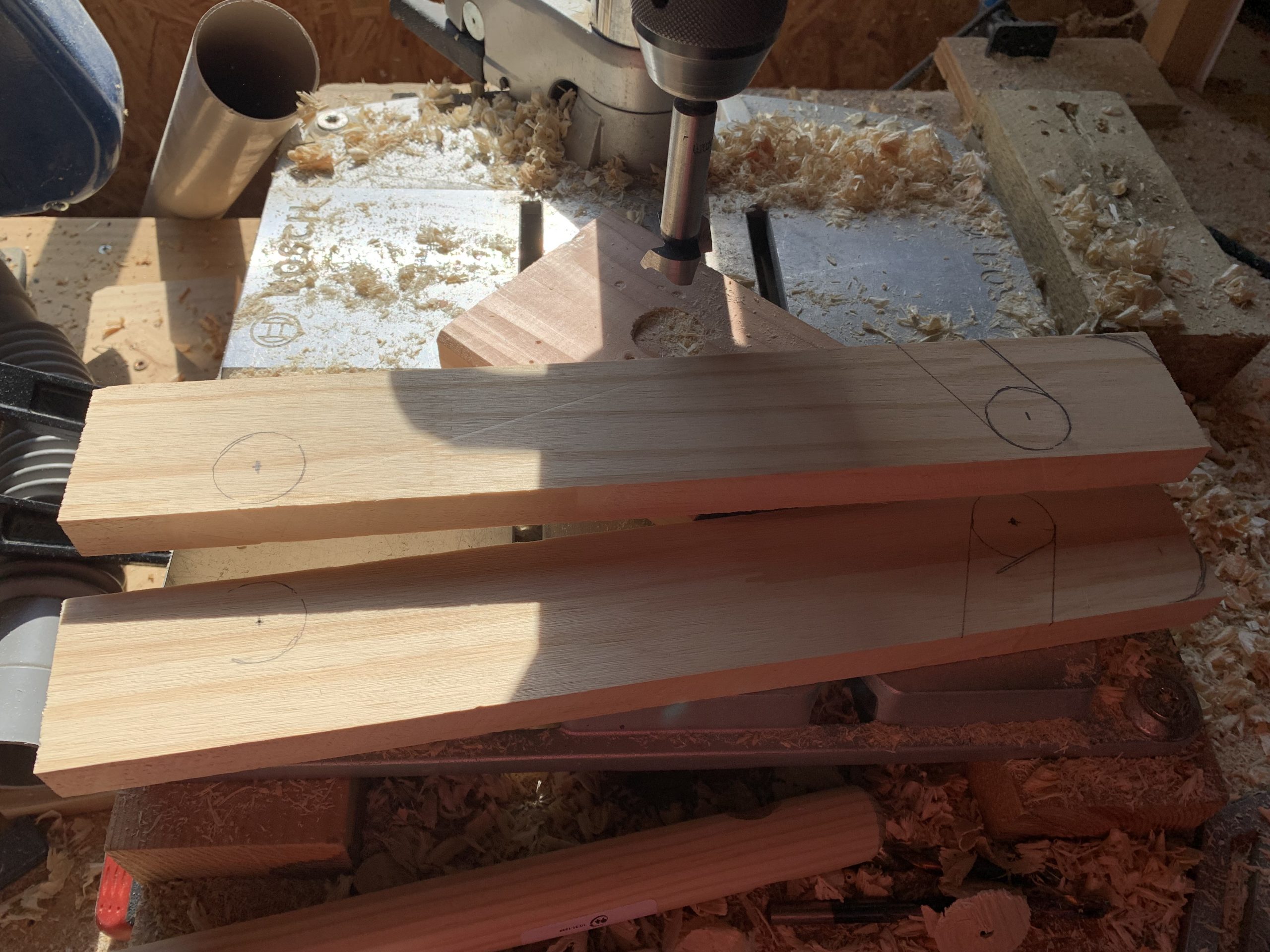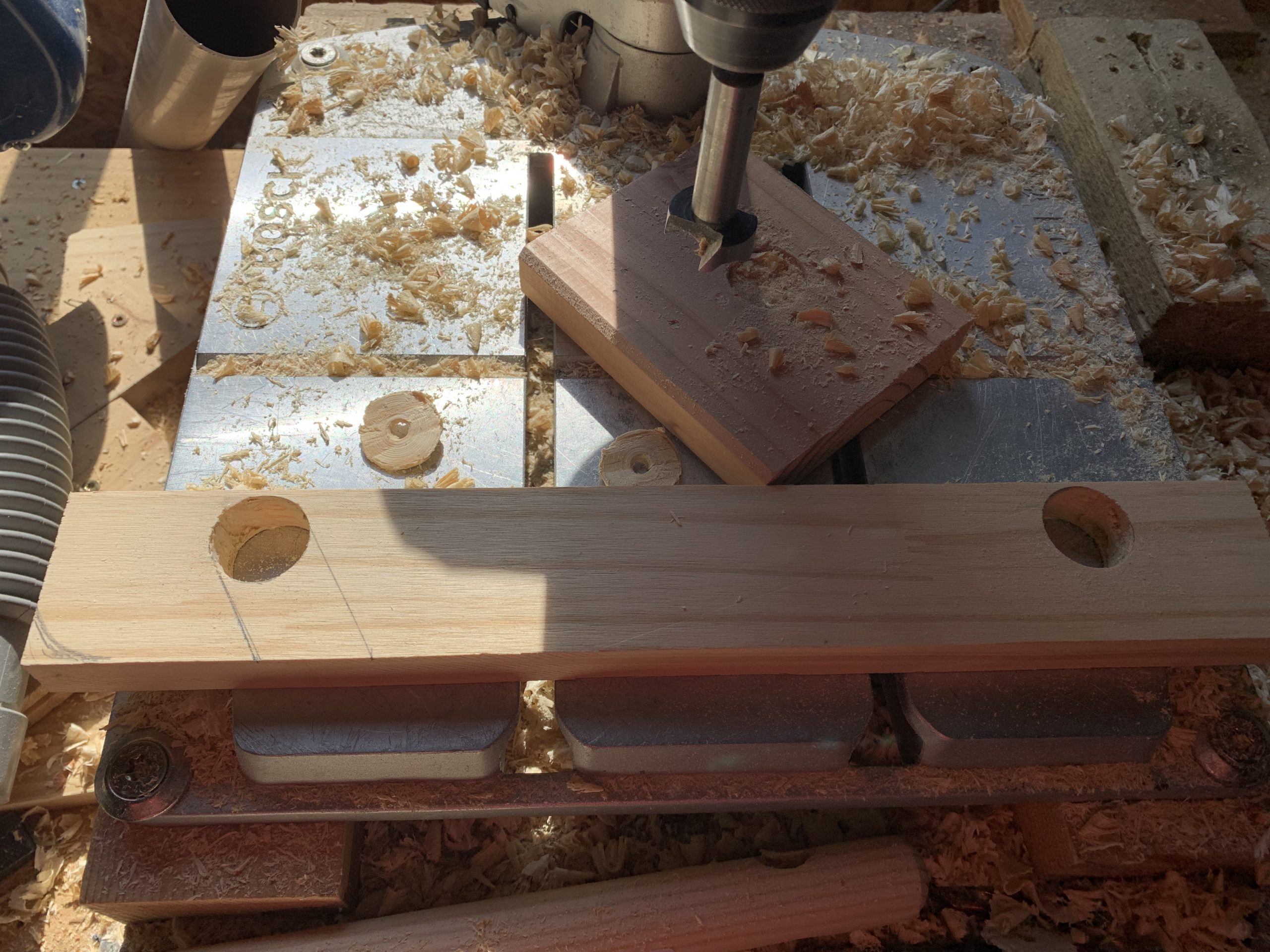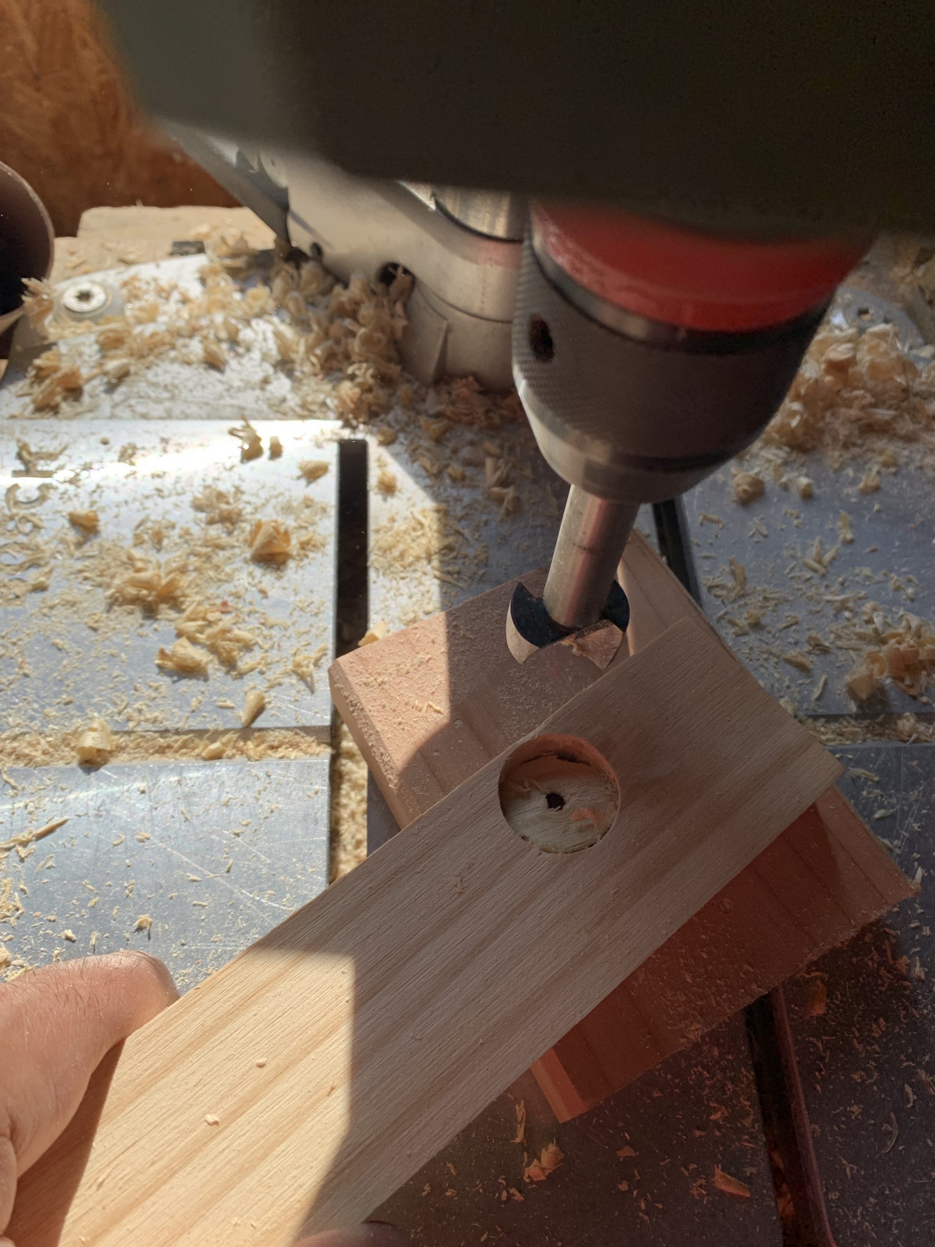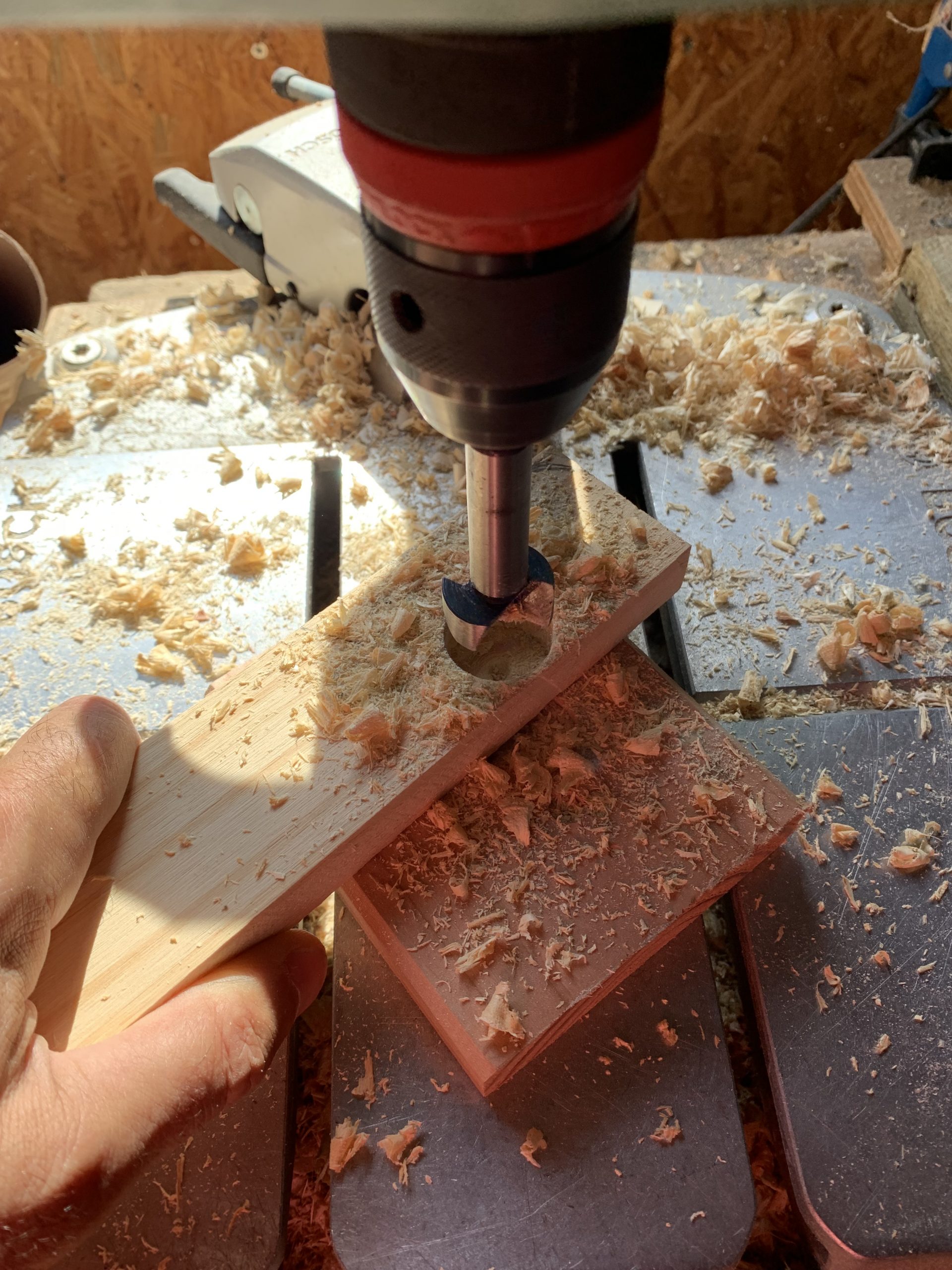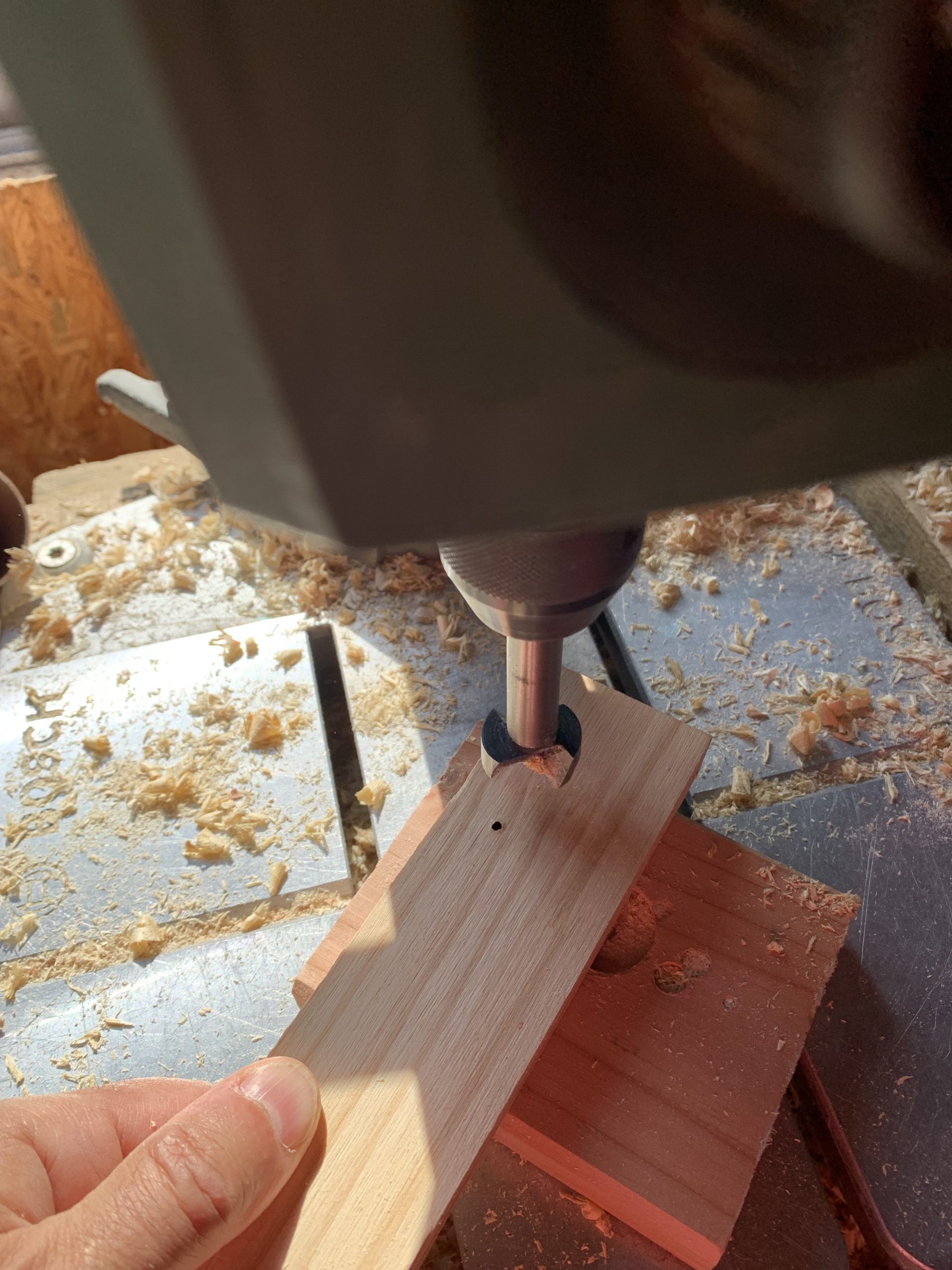 Pour percer proprement de gros trous à la fraise, je perce jusqu’à voir la pointe dépasser puis je reprends de l’autre cote.