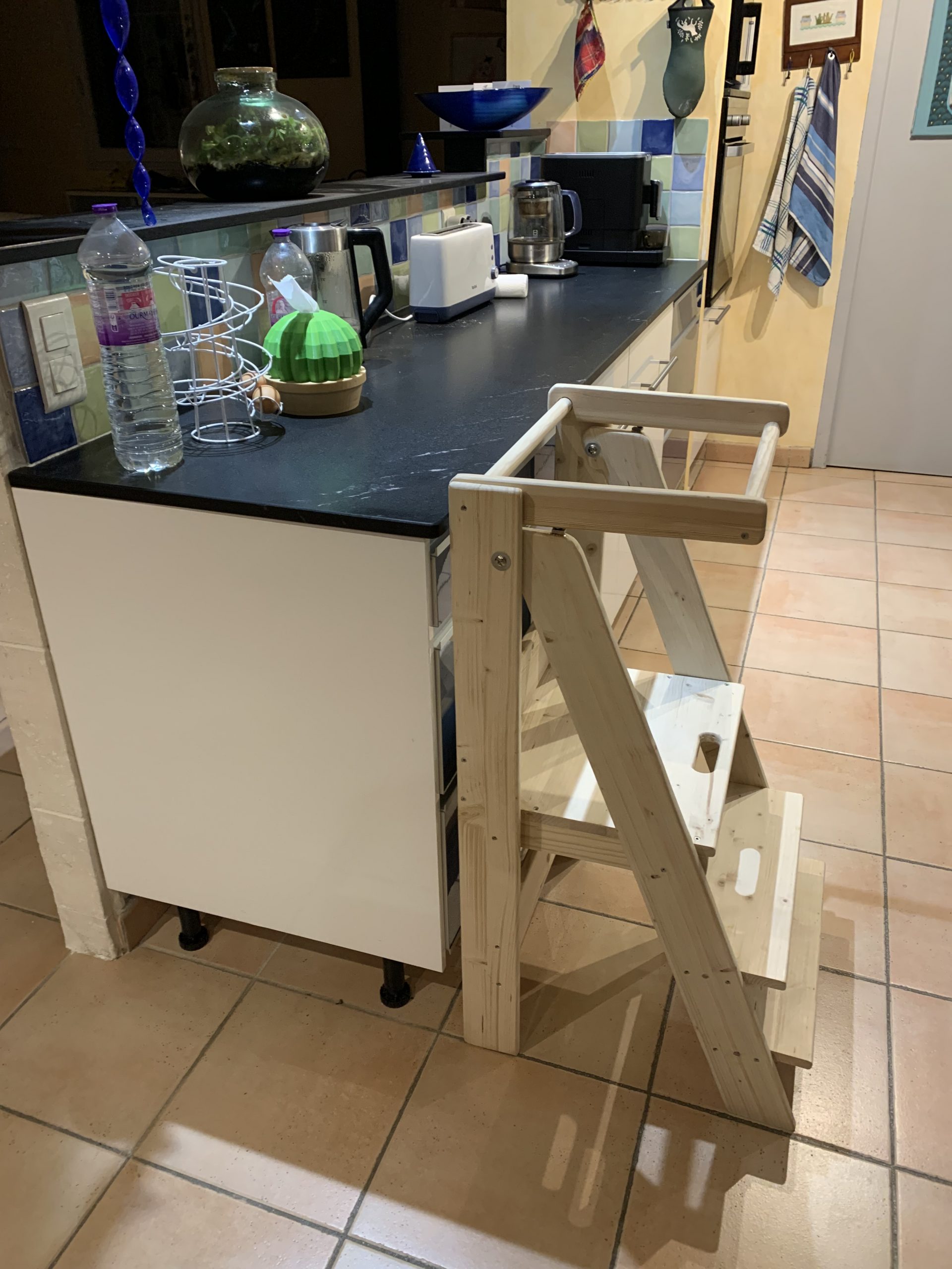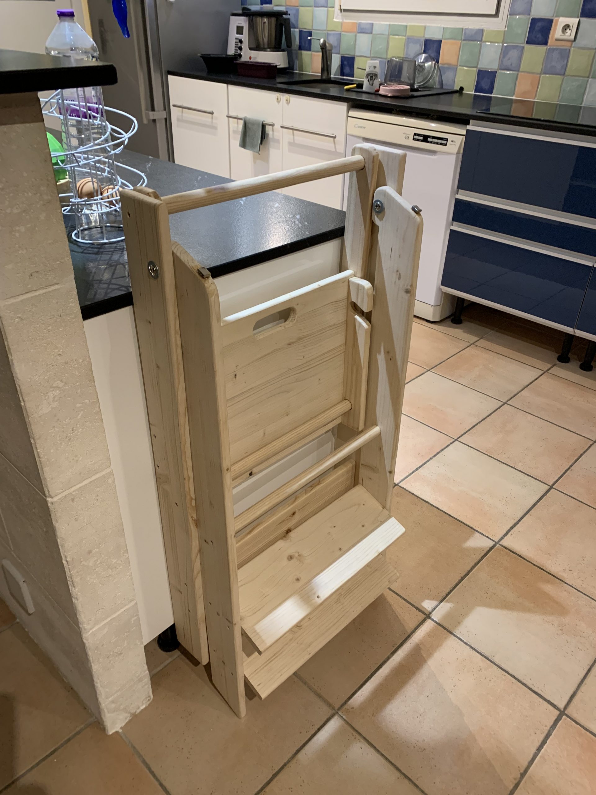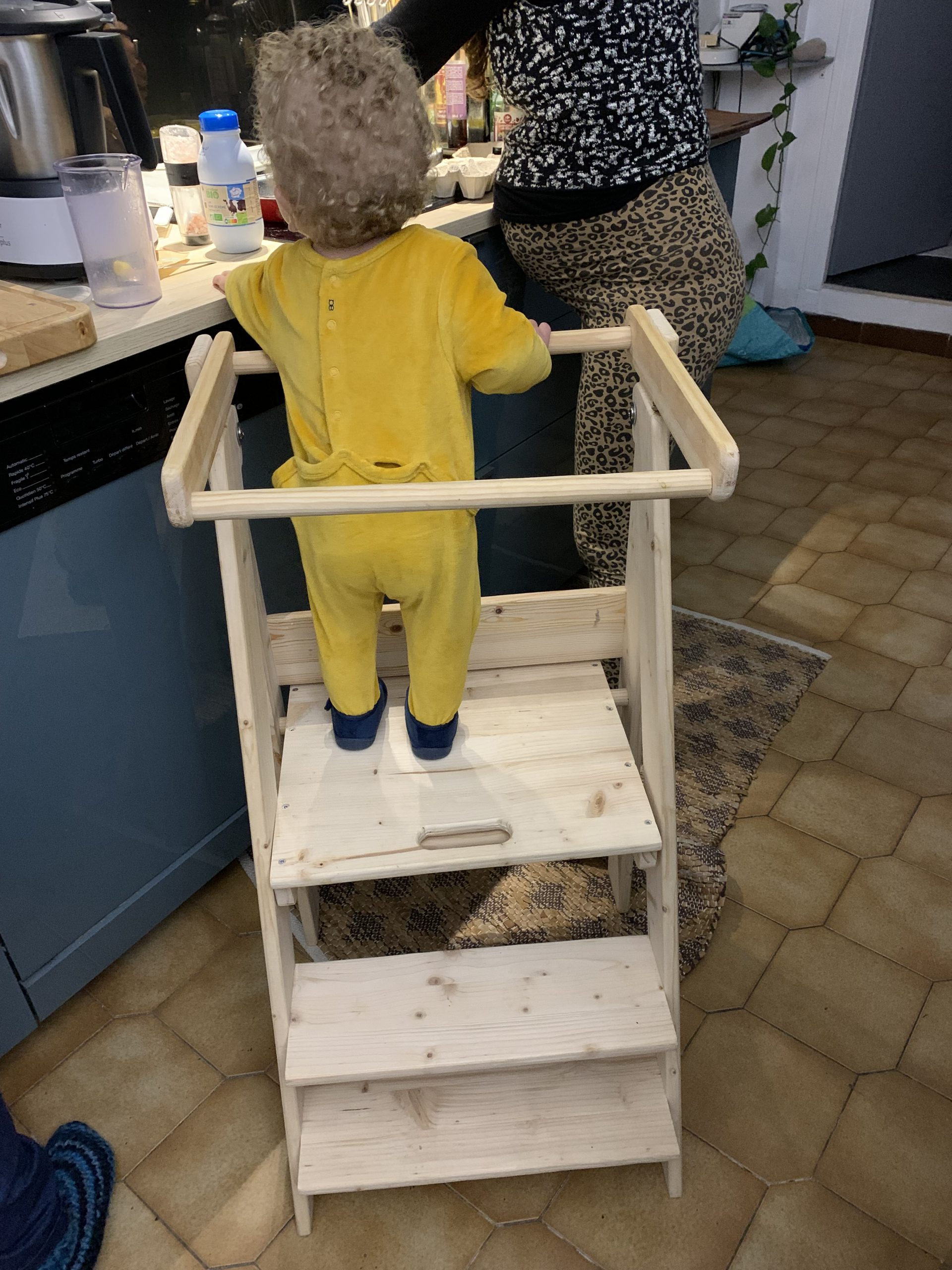 Il s’agit d’une sorte d’échelle sécurisée avec une plateforme pour que Milo puisse être à la hauteur du plan de la cuisine et regarder et participer. Il peut y monter seul et c’est assez sécurisé pour ne pas avoir à le tenir. Elle devait être pliable pour se caser facilement quand elle n,’est pas utilisée, dans leur cuisine pas si grande. Mais tout en étant pliable, elle doit être assez robuste et rigide pour inspirer confiance.