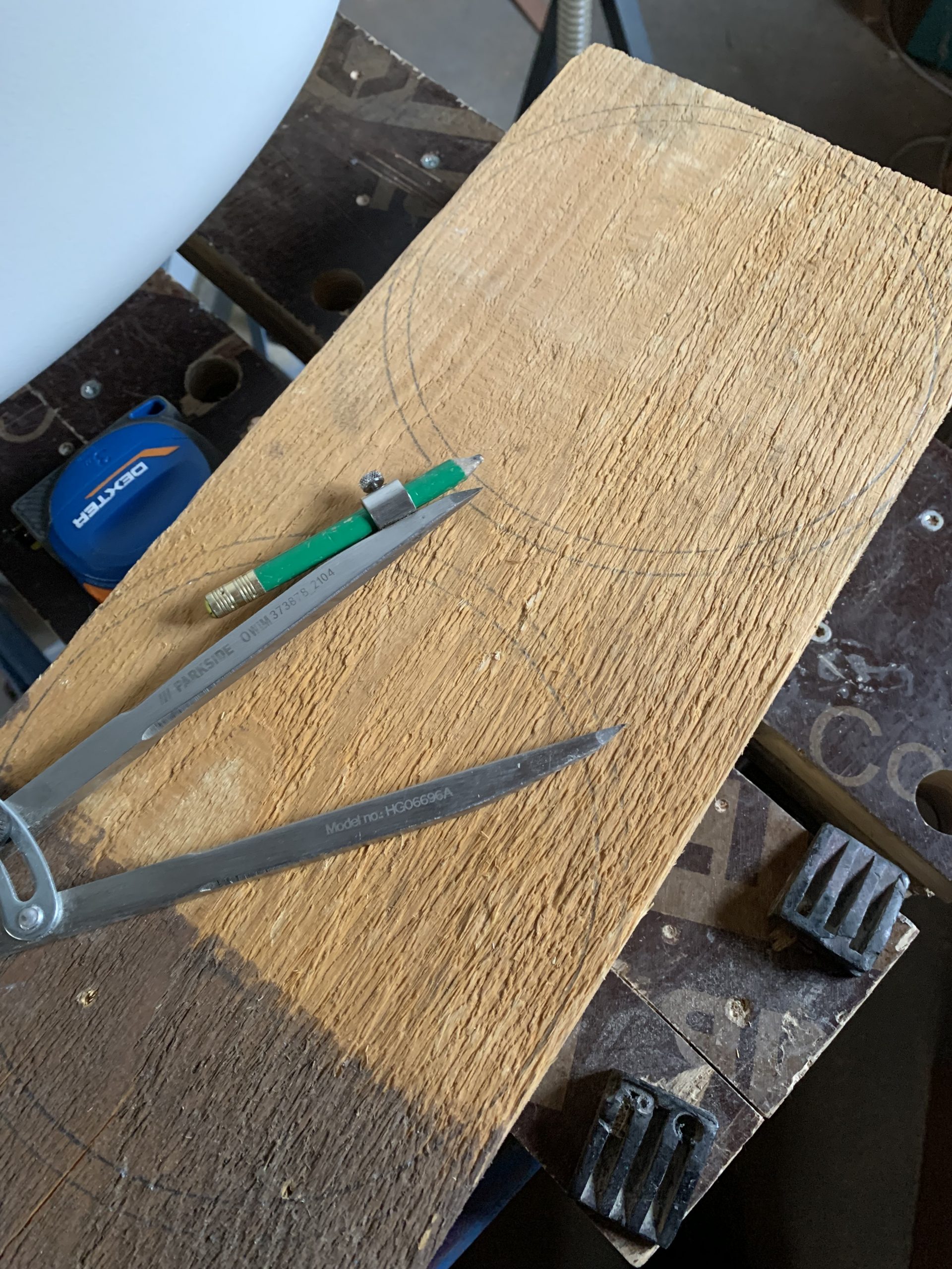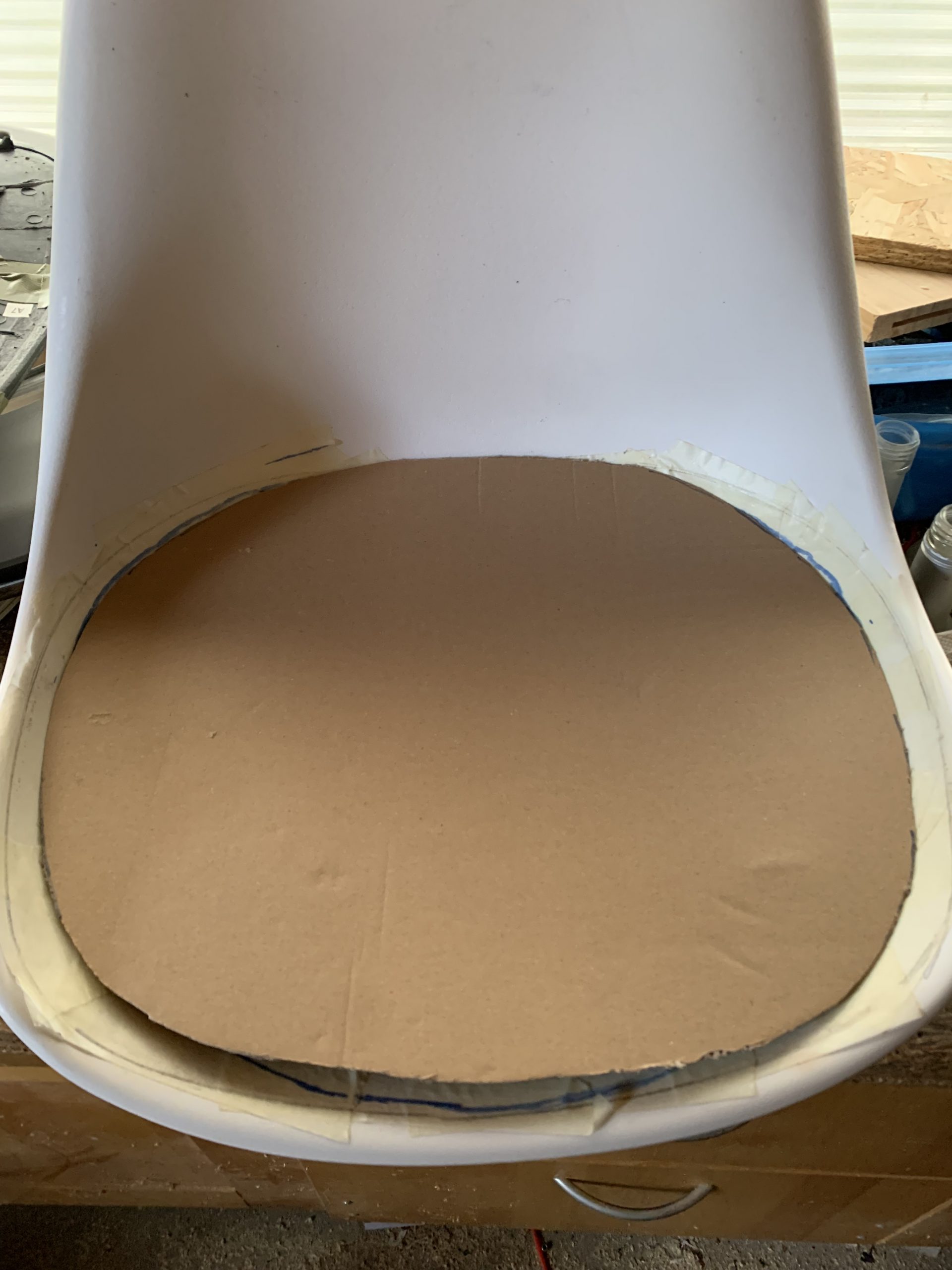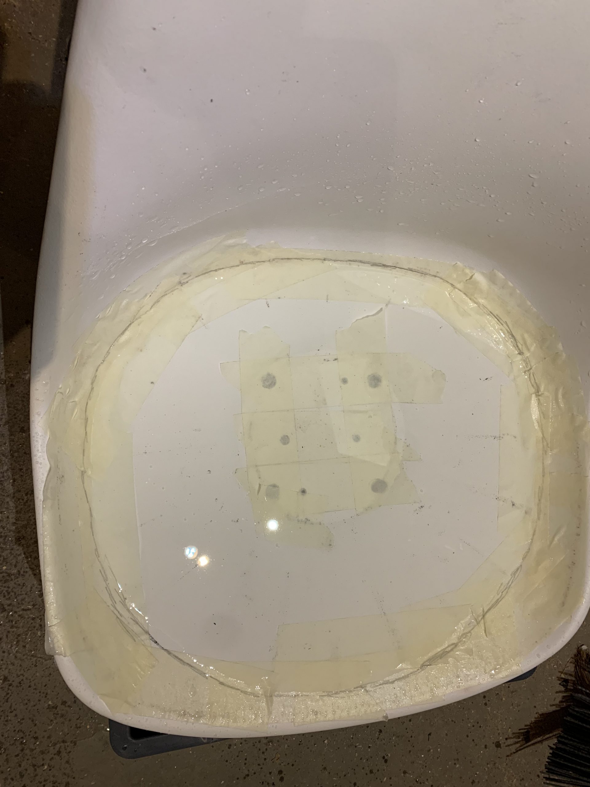 Pour trouver le contour de la pièce j’ai mis de l’eau au fond de la coque, et j’ai tracé le contour. J’ai aussi tracé le contour de la pièce actuelle, puis j’ai tracé un contour intermédiaire parallèle au contour de l’eau.