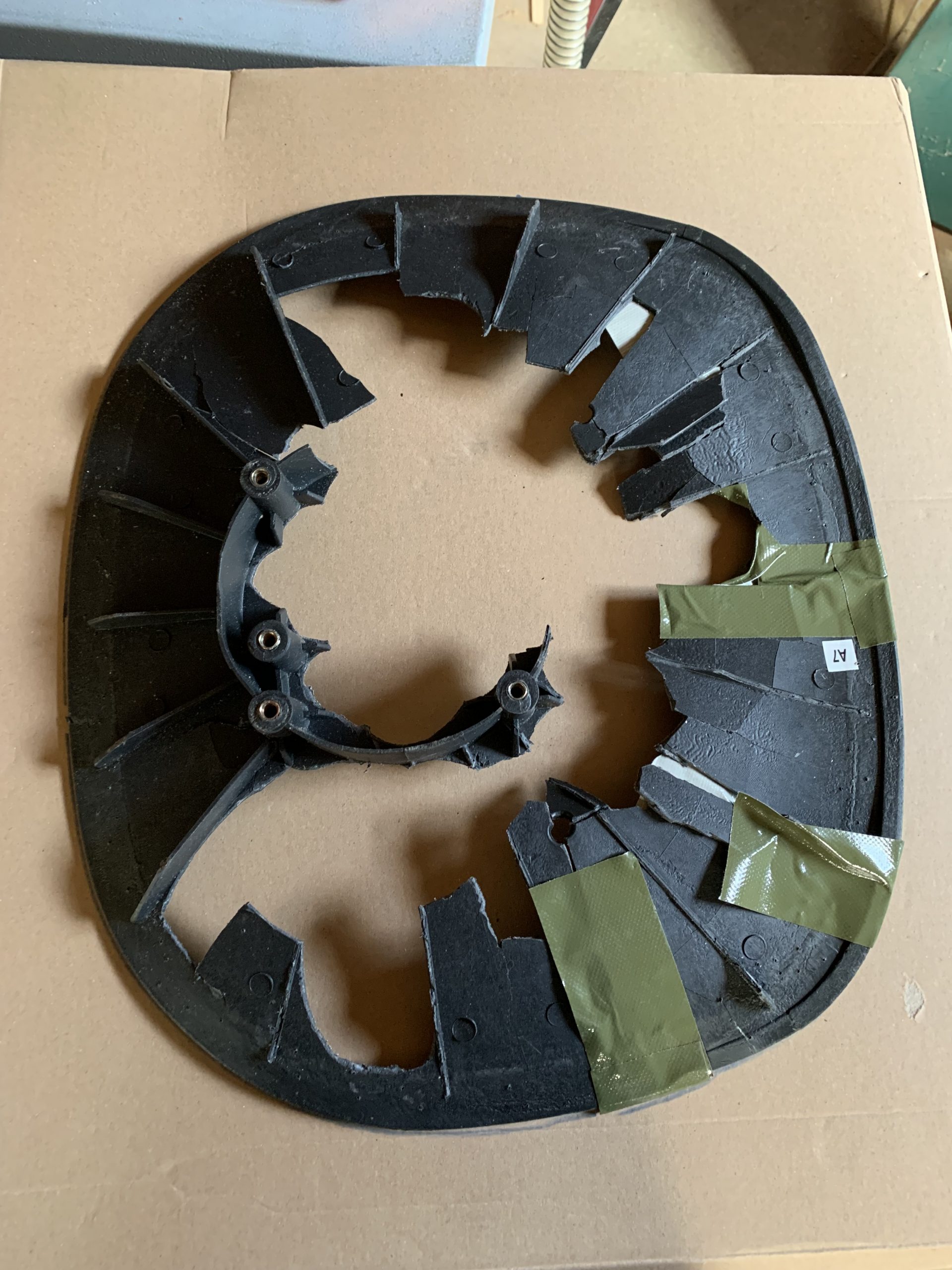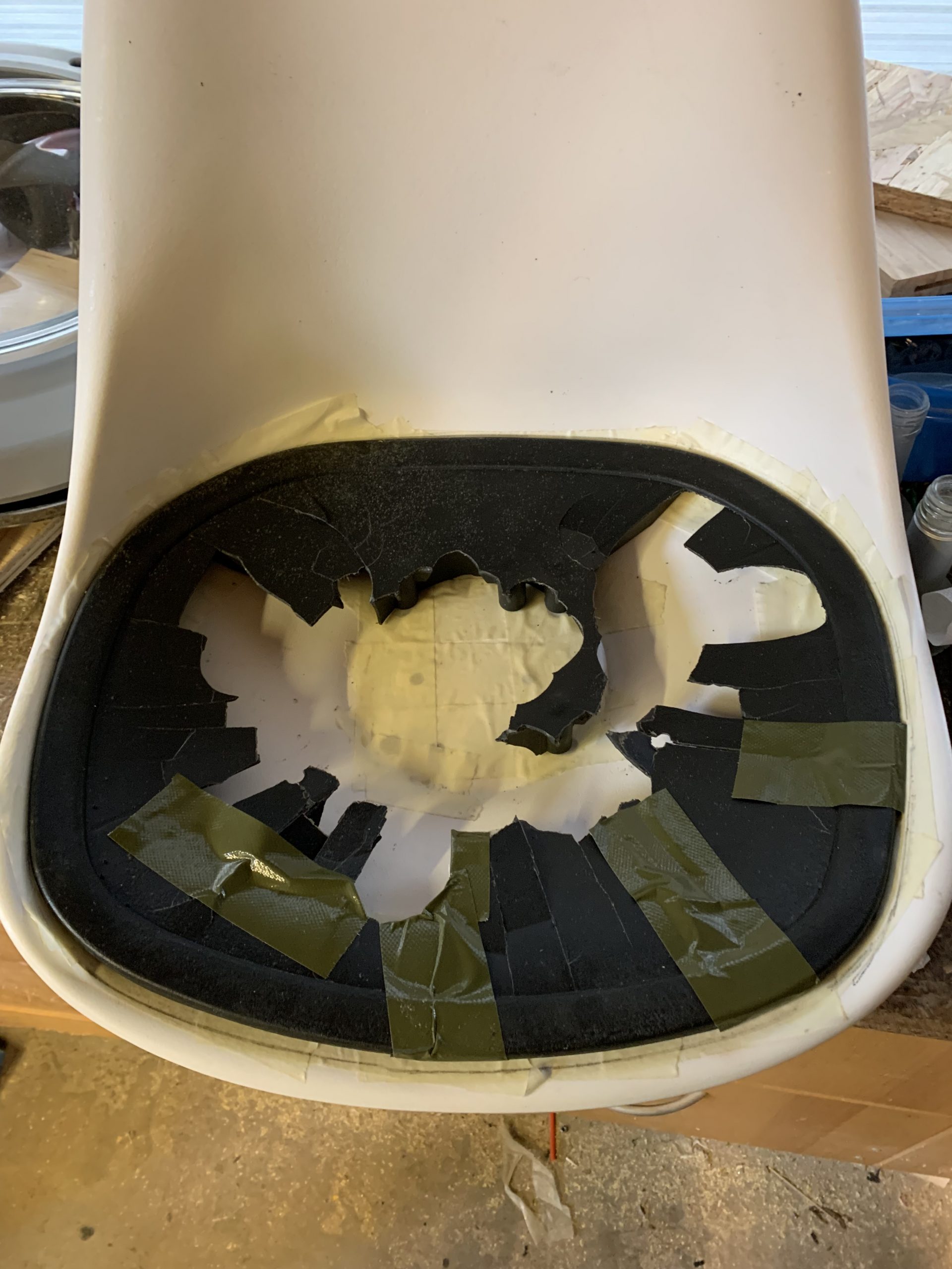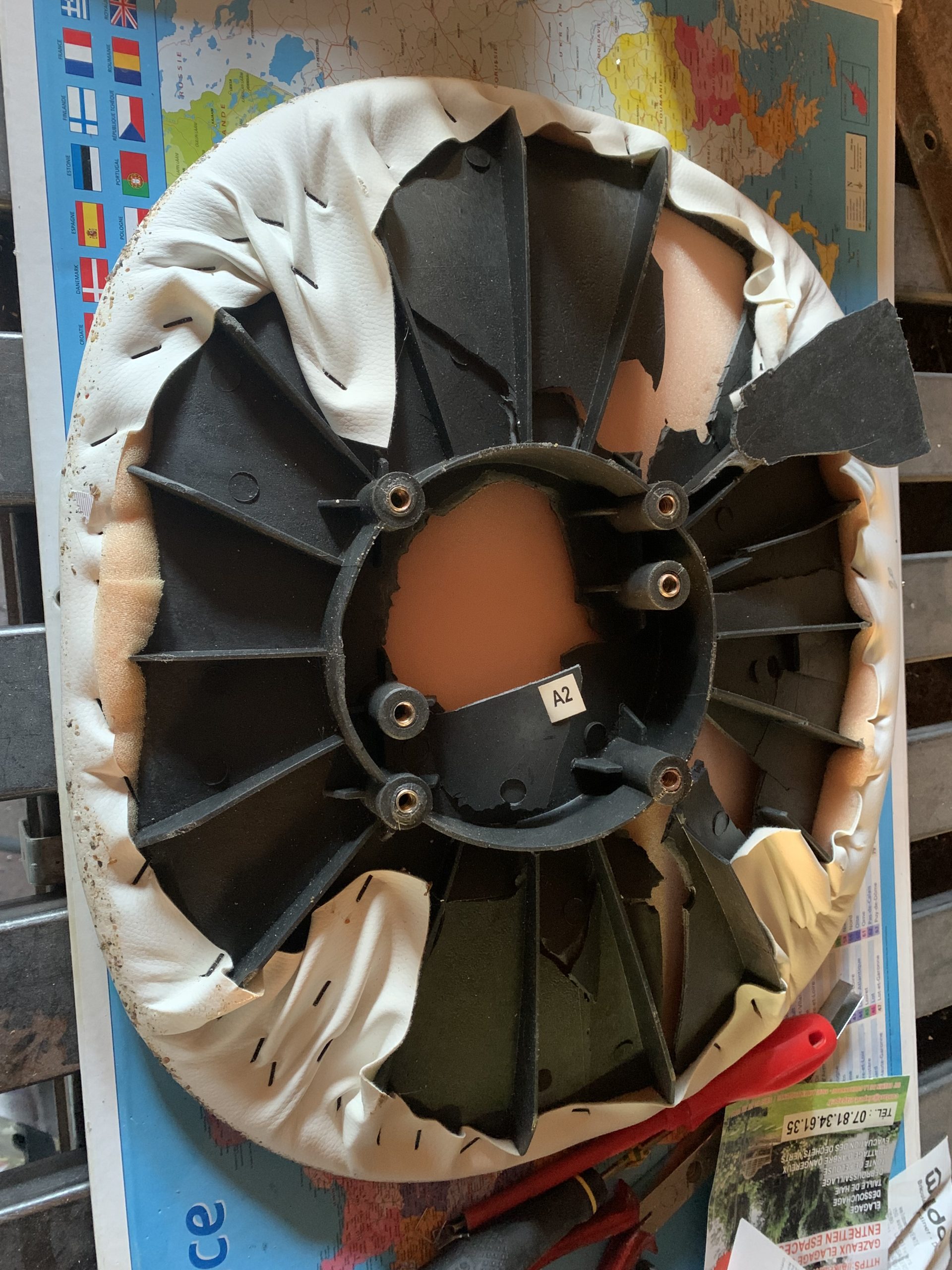 Rémi m’a proposé de réparer des chaises qu’il a récupérées et dont l’assise est abimée. La chaise comprend une coque et une galette de mousse pour l’assise.  Cette galette est fixée sur une pièce en plastique. C’est cette pièce qui est toute cassée et elle permet aussi de fixer la coque sur les pieds.