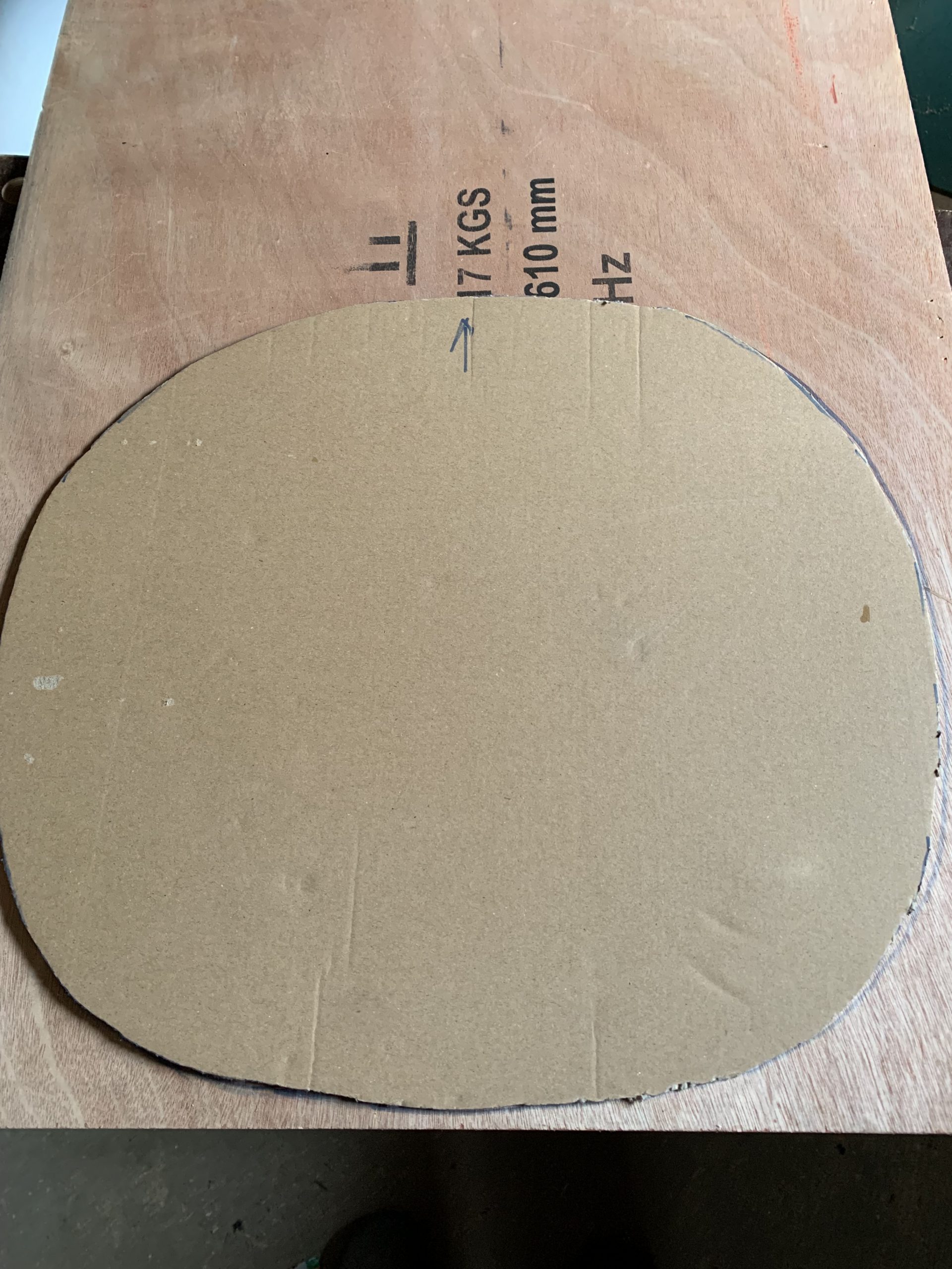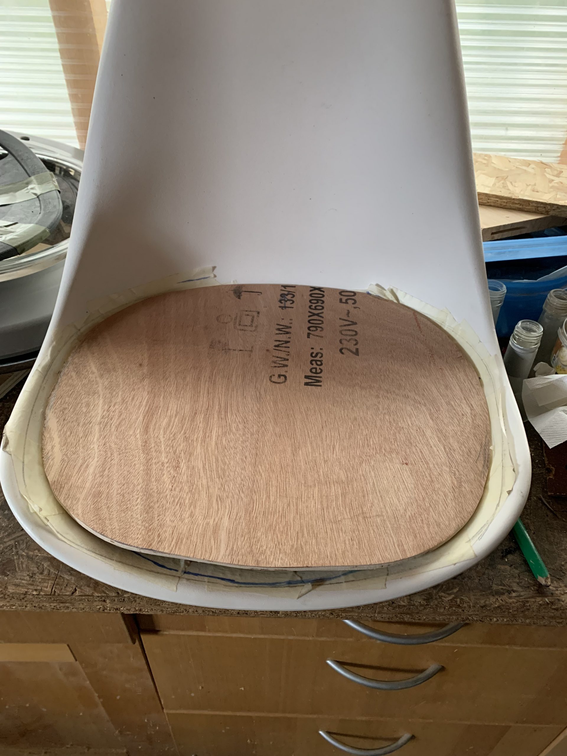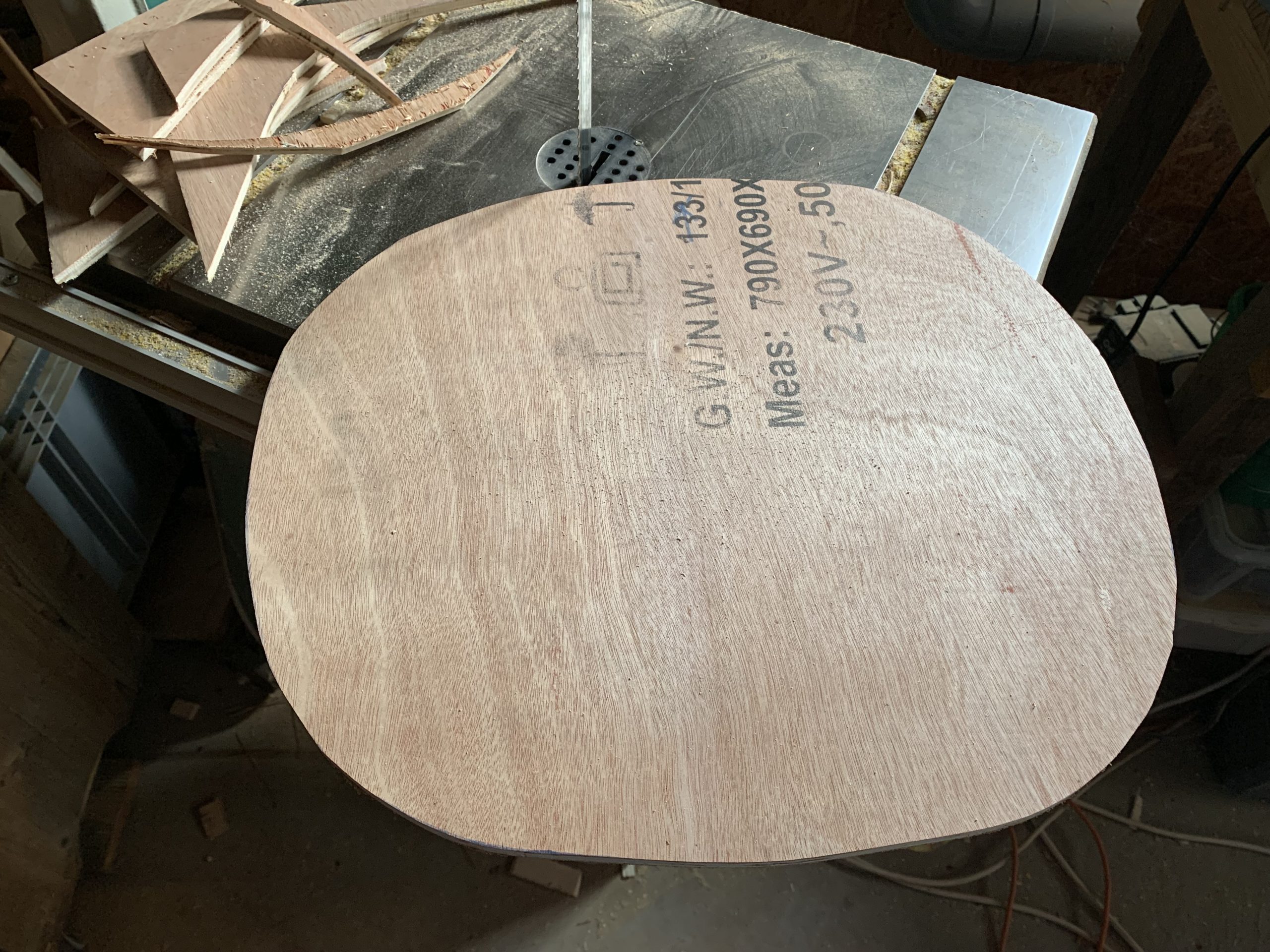 C’est cette forme que j’ai découpée en carton, puis ajustée et enfin reportée sur une planche de contreplaqué récupérée dans l’atelier. Je l’ai découpée à la scie à ruban, et cela s’adapte assez bien à la coque.