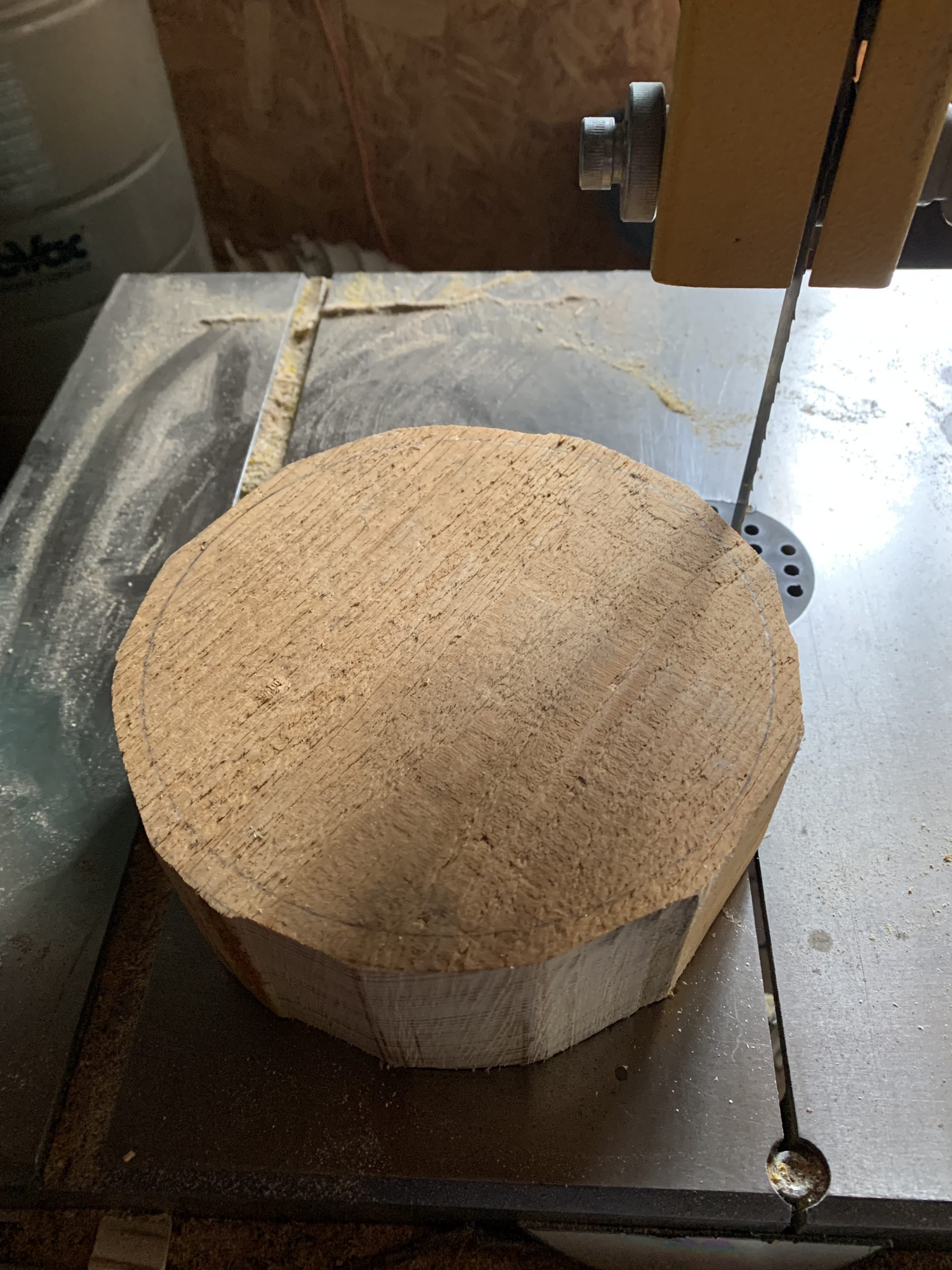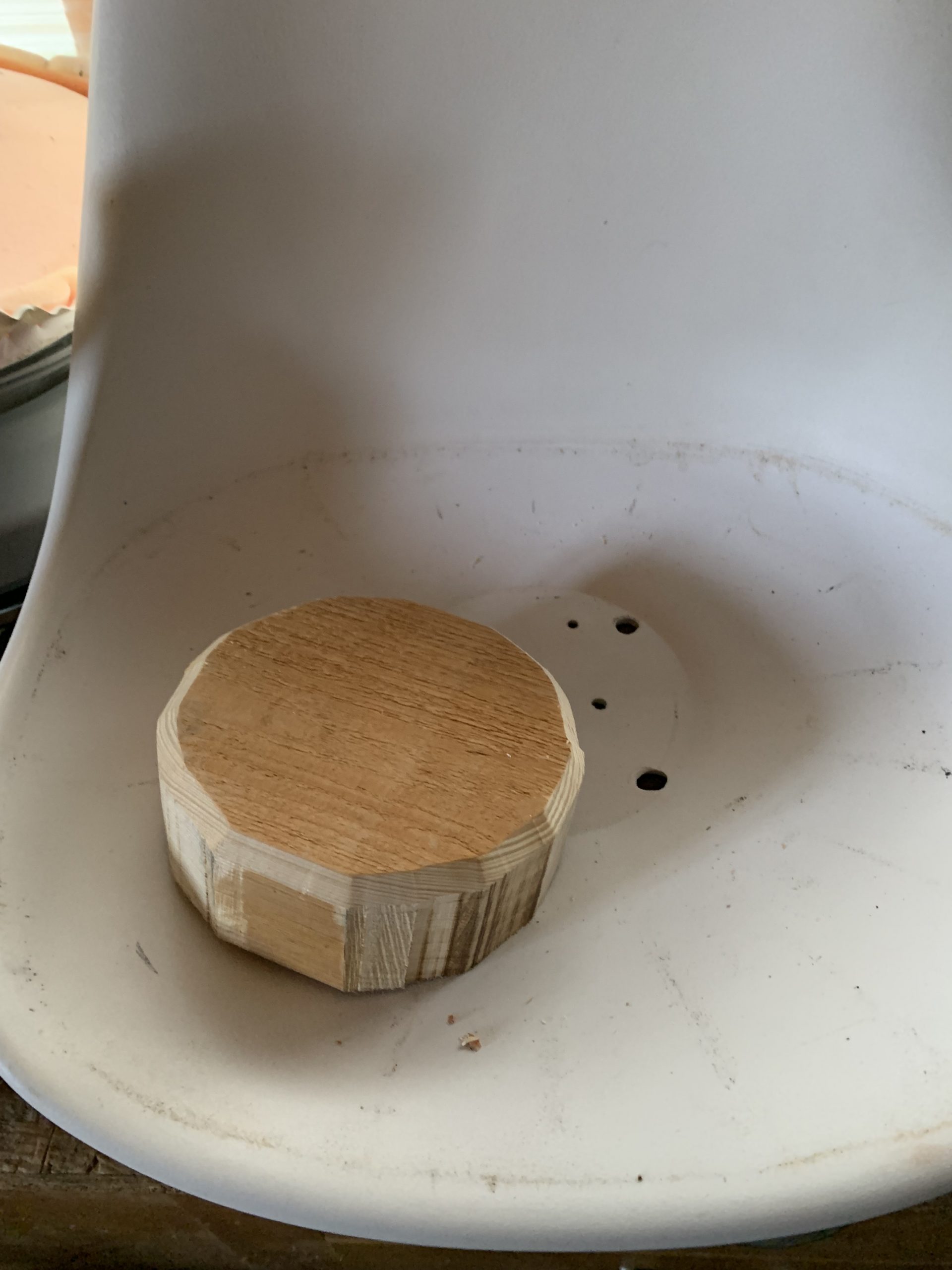 Pour compenser le vide sous la planche et aussi pouvoir fixer la coque et la galette de mousse sur les pieds, j’ai coupé un bloc de bois de la bonne épaisseur.