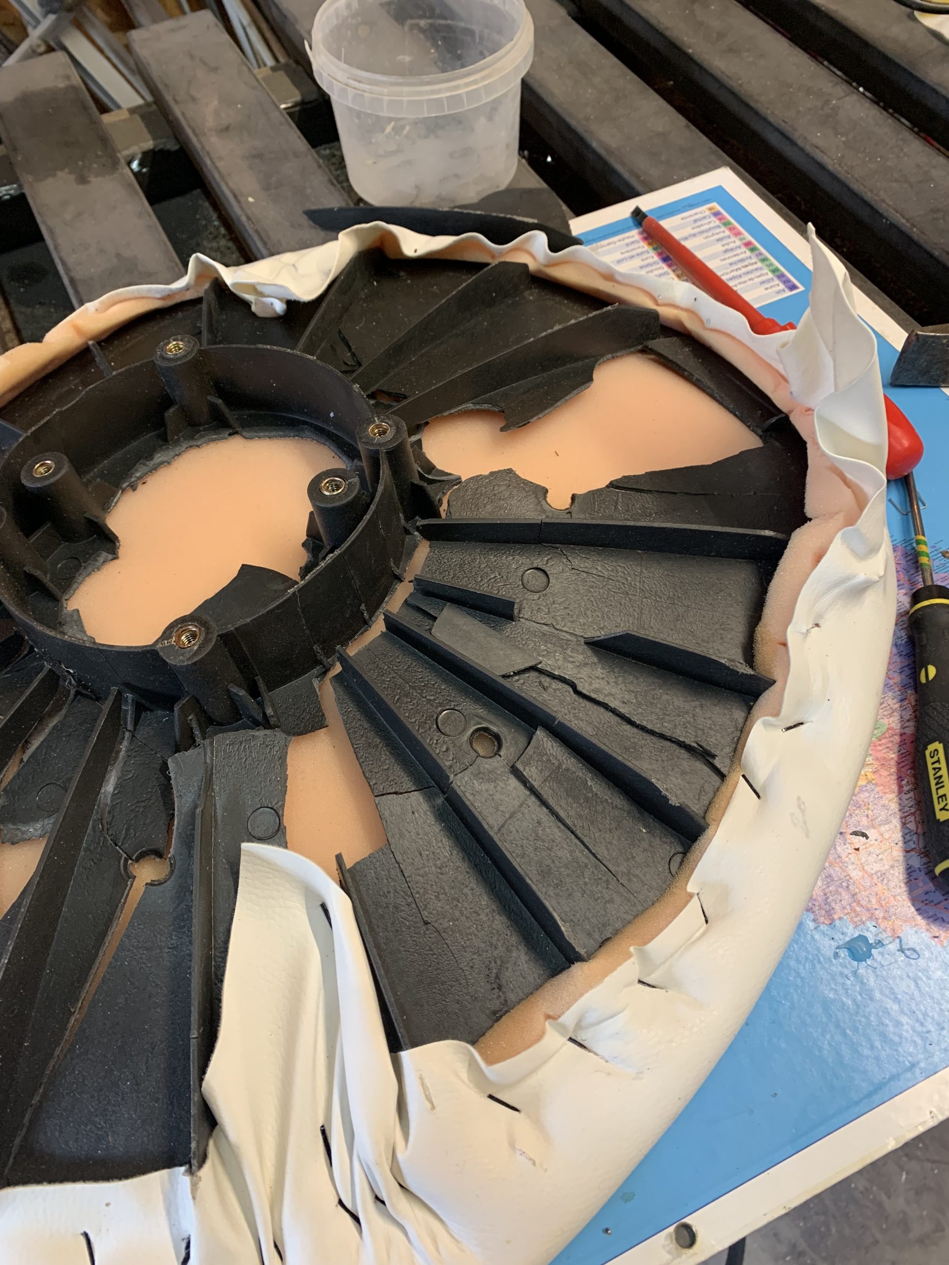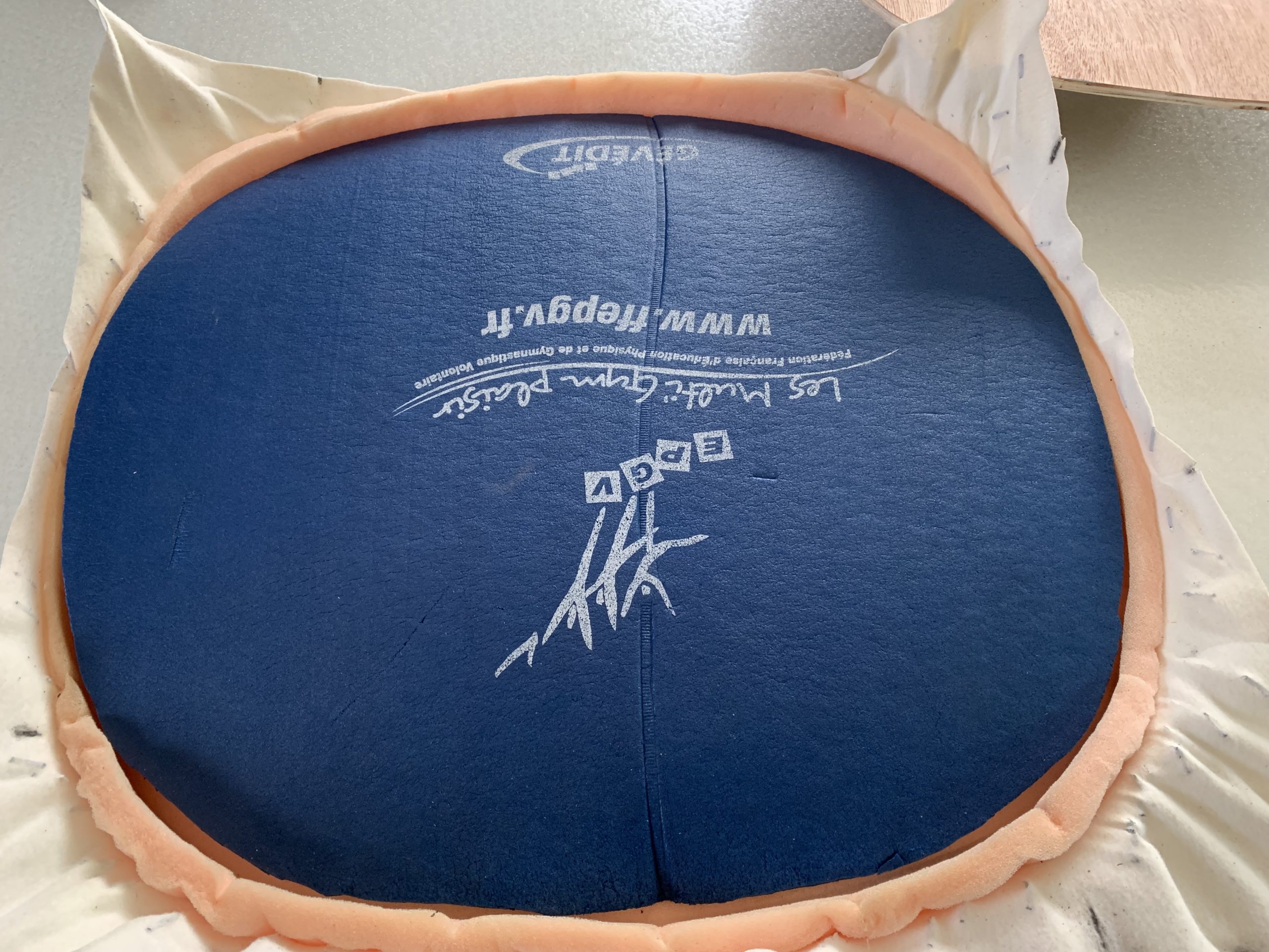 Pour que l’assise soit plus souple j’ai ajouté de la mousse découpée dans un vieux tapis de gym.